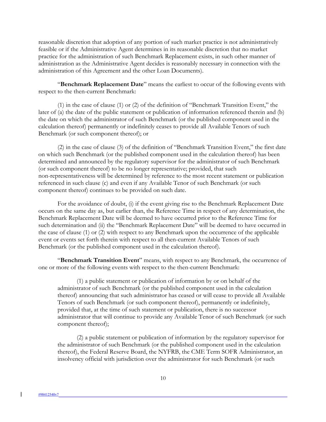 reasonable discretion that adoption of any portion of such market practice is not administratively feasible or if the Administrative Agent determines in its reasonable discretion that no market practice for the administration of such Benchmark Replacement exists, in such other manner of administration as the Administrative Agent decides is reasonably necessary in connection with the administration of this Agreement and the other Loan Documents). “Benchmark Replacement Date” means the earliest to occur of the following events with respect to the then-current Benchmark: (1) in the case of clause (1) or (2) of the definition of “Benchmark Transition Event,” the later of (a) the date of the public statement or publication of information referenced therein and (b) the date on which the administrator of such Benchmark (or the published component used in the calculation thereof) permanently or indefinitely ceases to provide all Available Tenors of such Benchmark (or such component thereof); or (2) in the case of clause (3) of the definition of “Benchmark Transition Event,” the first date on which such Benchmark (or the published component used in the calculation thereof) has been determined and announced by the regulatory supervisor for the administrator of such Benchmark (or such component thereof) to be no longer representative; provided, that such non-representativeness will be determined by reference to the most recent statement or publication referenced in such clause (c) and even if any Available Tenor of such Benchmark (or such component thereof) continues to be provided on such date. For the avoidance of doubt, (i) if the event giving rise to the Benchmark Replacement Date occurs on the same day as, but earlier than, the Reference Time in respect of any determination, the Benchmark Replacement Date will be deemed to have occurred prior to the Reference Time for such determination and (ii) the “Benchmark Replacement Date” will be deemed to have occurred in the case of clause (1) or (2) with respect to any Benchmark upon the occurrence of the applicable event or events set forth therein with respect to all then-current Available Tenors of such Benchmark (or the published component used in the calculation thereof). “Benchmark Transition Event” means, with respect to any Benchmark, the occurrence of one or more of the following events with respect to the then-current Benchmark: (1) a public statement or publication of information by or on behalf of the administrator of such Benchmark (or the published component used in the calculation thereof) announcing that such administrator has ceased or will cease to provide all Available Tenors of such Benchmark (or such component thereof), permanently or indefinitely, provided that, at the time of such statement or publication, there is no successor administrator that will continue to provide any Available Tenor of such Benchmark (or such component thereof); (2) a public statement or publication of information by the regulatory supervisor for the administrator of such Benchmark (or the published component used in the calculation thereof), the Federal Reserve Board, the NYFRB, the CME Term SOFR Administrator, an insolvency official with jurisdiction over the administrator for such Benchmark (or such 10 #98412540v7