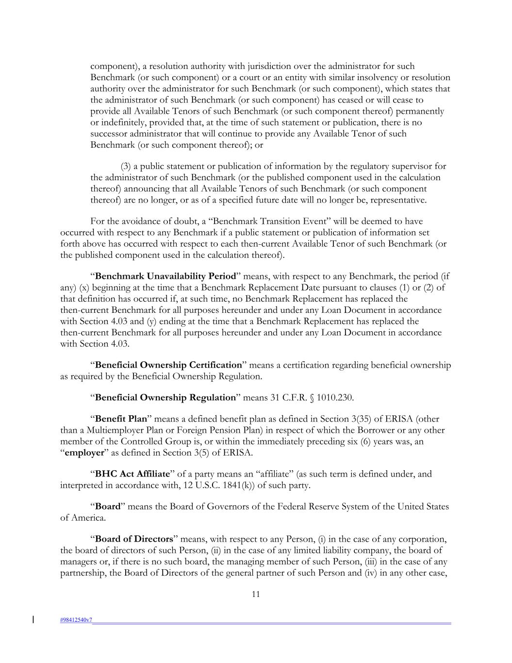 component), a resolution authority with jurisdiction over the administrator for such Benchmark (or such component) or a court or an entity with similar insolvency or resolution authority over the administrator for such Benchmark (or such component), which states that the administrator of such Benchmark (or such component) has ceased or will cease to provide all Available Tenors of such Benchmark (or such component thereof) permanently or indefinitely, provided that, at the time of such statement or publication, there is no successor administrator that will continue to provide any Available Tenor of such Benchmark (or such component thereof); or (3) a public statement or publication of information by the regulatory supervisor for the administrator of such Benchmark (or the published component used in the calculation thereof) announcing that all Available Tenors of such Benchmark (or such component thereof) are no longer, or as of a specified future date will no longer be, representative. For the avoidance of doubt, a “Benchmark Transition Event” will be deemed to have occurred with respect to any Benchmark if a public statement or publication of information set forth above has occurred with respect to each then-current Available Tenor of such Benchmark (or the published component used in the calculation thereof). “Benchmark Unavailability Period” means, with respect to any Benchmark, the period (if any) (x) beginning at the time that a Benchmark Replacement Date pursuant to clauses (1) or (2) of that definition has occurred if, at such time, no Benchmark Replacement has replaced the then-current Benchmark for all purposes hereunder and under any Loan Document in accordance with Section 4.03 and (y) ending at the time that a Benchmark Replacement has replaced the then-current Benchmark for all purposes hereunder and under any Loan Document in accordance with Section 4.03. “Beneficial Ownership Certification” means a certification regarding beneficial ownership as required by the Beneficial Ownership Regulation. “Beneficial Ownership Regulation” means 31 C.F.R. § 1010.230. “Benefit Plan” means a defined benefit plan as defined in Section 3(35) of ERISA (other than a Multiemployer Plan or Foreign Pension Plan) in respect of which the Borrower or any other member of the Controlled Group is, or within the immediately preceding six (6) years was, an “employer” as defined in Section 3(5) of ERISA. “BHC Act Affiliate” of a party means an “affiliate” (as such term is defined under, and interpreted in accordance with, 12 U.S.C. 1841(k)) of such party. “Board” means the Board of Governors of the Federal Reserve System of the United States of America. “Board of Directors” means, with respect to any Person, (i) in the case of any corporation, the board of directors of such Person, (ii) in the case of any limited liability company, the board of managers or, if there is no such board, the managing member of such Person, (iii) in the case of any partnership, the Board of Directors of the general partner of such Person and (iv) in any other case, 11 #98412540v7