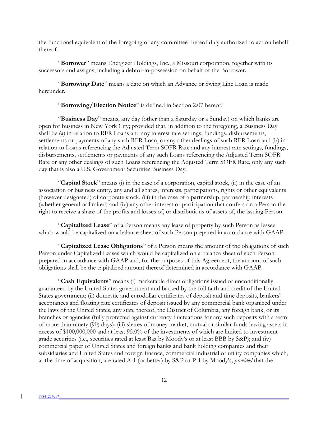 the functional equivalent of the foregoing or any committee thereof duly authorized to act on behalf thereof. “Borrower” means Energizer Holdings, Inc., a Missouri corporation, together with its successors and assigns, including a debtor-in-possession on behalf of the Borrower. “Borrowing Date” means a date on which an Advance or Swing Line Loan is made hereunder. “Borrowing/Election Notice” is defined in Section 2.07 hereof. “Business Day” means, any day (other than a Saturday or a Sunday) on which banks are open for business in New York City; provided that, in addition to the foregoing, a Business Day shall be (a) in relation to RFR Loans and any interest rate settings, fundings, disbursements, settlements or payments of any such RFR Loan, or any other dealings of such RFR Loan and (b) in relation to Loans referencing the Adjusted Term SOFR Rate and any interest rate settings, fundings, disbursements, settlements or payments of any such Loans referencing the Adjusted Term SOFR Rate or any other dealings of such Loans referencing the Adjusted Term SOFR Rate, only any such day that is also a U.S. Government Securities Business Day. “Capital Stock” means (i) in the case of a corporation, capital stock, (ii) in the case of an association or business entity, any and all shares, interests, participations, rights or other equivalents (however designated) of corporate stock, (iii) in the case of a partnership, partnership interests (whether general or limited) and (iv) any other interest or participation that confers on a Person the right to receive a share of the profits and losses of, or distributions of assets of, the issuing Person. “Capitalized Lease” of a Person means any lease of property by such Person as lessee which would be capitalized on a balance sheet of such Person prepared in accordance with GAAP. “Capitalized Lease Obligations” of a Person means the amount of the obligations of such Person under Capitalized Leases which would be capitalized on a balance sheet of such Person prepared in accordance with GAAP and, for the purposes of this Agreement, the amount of such obligations shall be the capitalized amount thereof determined in accordance with GAAP. “Cash Equivalents” means (i) marketable direct obligations issued or unconditionally guaranteed by the United States government and backed by the full faith and credit of the United States government; (ii) domestic and eurodollar certificates of deposit and time deposits, bankers’ acceptances and floating rate certificates of deposit issued by any commercial bank organized under the laws of the United States, any state thereof, the District of Columbia, any foreign bank, or its branches or agencies (fully protected against currency fluctuations for any such deposits with a term of more than ninety (90) days); (iii) shares of money market, mutual or similar funds having assets in excess of $100,000,000 and at least 95.0% of the investments of which are limited to investment grade securities (i.e., securities rated at least Baa by Moody’s or at least BBB by S&P); and (iv) commercial paper of United States and foreign banks and bank holding companies and their subsidiaries and United States and foreign finance, commercial industrial or utility companies which, at the time of acquisition, are rated A-1 (or better) by S&P or P-1 by Moody’s; provided that the 12 #98412540v7