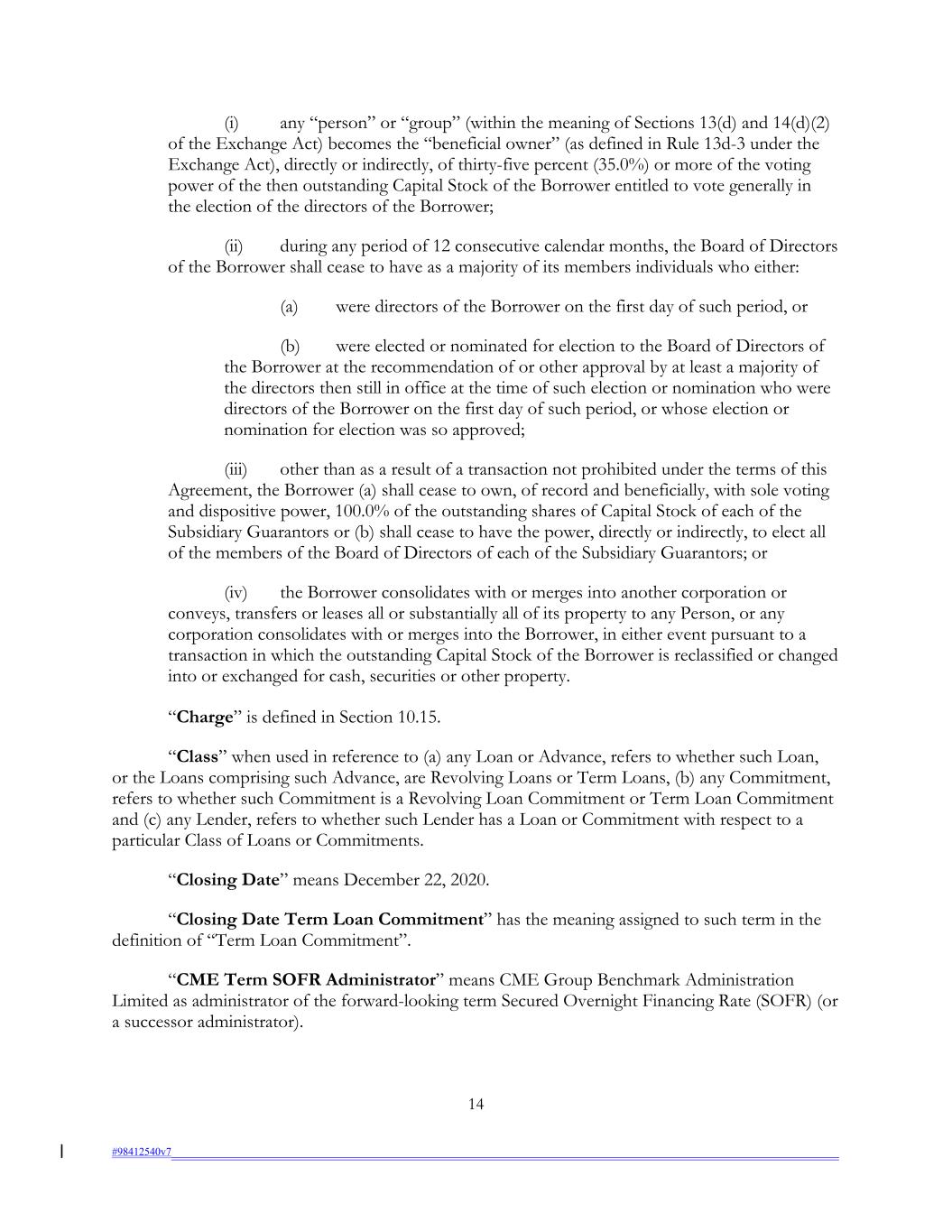 (i) any “person” or “group” (within the meaning of Sections 13(d) and 14(d)(2) of the Exchange Act) becomes the “beneficial owner” (as defined in Rule 13d-3 under the Exchange Act), directly or indirectly, of thirty-five percent (35.0%) or more of the voting power of the then outstanding Capital Stock of the Borrower entitled to vote generally in the election of the directors of the Borrower; (ii) during any period of 12 consecutive calendar months, the Board of Directors of the Borrower shall cease to have as a majority of its members individuals who either: (a) were directors of the Borrower on the first day of such period, or (b) were elected or nominated for election to the Board of Directors of the Borrower at the recommendation of or other approval by at least a majority of the directors then still in office at the time of such election or nomination who were directors of the Borrower on the first day of such period, or whose election or nomination for election was so approved; (iii) other than as a result of a transaction not prohibited under the terms of this Agreement, the Borrower (a) shall cease to own, of record and beneficially, with sole voting and dispositive power, 100.0% of the outstanding shares of Capital Stock of each of the Subsidiary Guarantors or (b) shall cease to have the power, directly or indirectly, to elect all of the members of the Board of Directors of each of the Subsidiary Guarantors; or (iv) the Borrower consolidates with or merges into another corporation or conveys, transfers or leases all or substantially all of its property to any Person, or any corporation consolidates with or merges into the Borrower, in either event pursuant to a transaction in which the outstanding Capital Stock of the Borrower is reclassified or changed into or exchanged for cash, securities or other property. “Charge” is defined in Section 10.15. “Class” when used in reference to (a) any Loan or Advance, refers to whether such Loan, or the Loans comprising such Advance, are Revolving Loans or Term Loans, (b) any Commitment, refers to whether such Commitment is a Revolving Loan Commitment or Term Loan Commitment and (c) any Lender, refers to whether such Lender has a Loan or Commitment with respect to a particular Class of Loans or Commitments. “Closing Date” means December 22, 2020. “Closing Date Term Loan Commitment” has the meaning assigned to such term in the definition of “Term Loan Commitment”. “CME Term SOFR Administrator” means CME Group Benchmark Administration Limited as administrator of the forward-looking term Secured Overnight Financing Rate (SOFR) (or a successor administrator). 14 #98412540v7