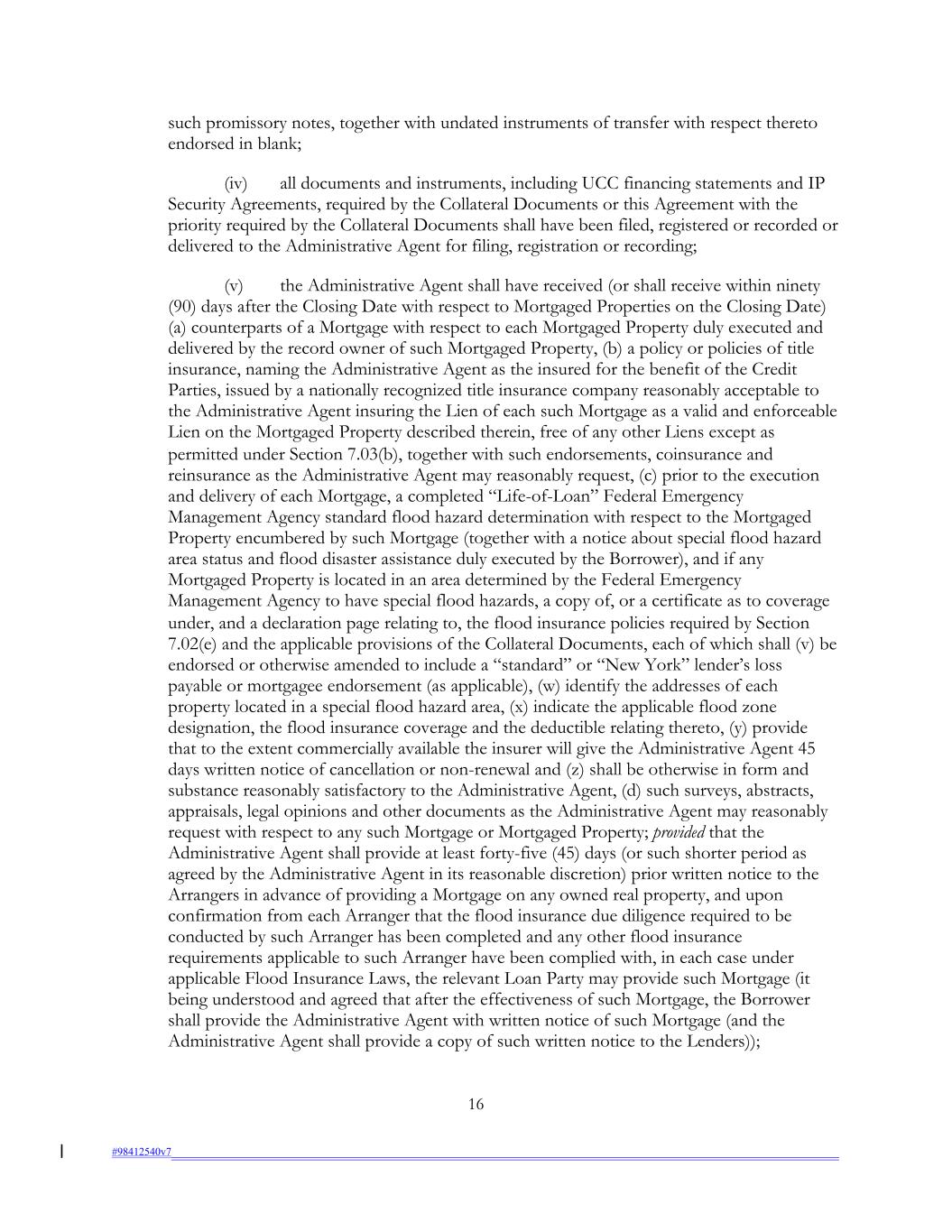 such promissory notes, together with undated instruments of transfer with respect thereto endorsed in blank; (iv) all documents and instruments, including UCC financing statements and IP Security Agreements, required by the Collateral Documents or this Agreement with the priority required by the Collateral Documents shall have been filed, registered or recorded or delivered to the Administrative Agent for filing, registration or recording; (v) the Administrative Agent shall have received (or shall receive within ninety (90) days after the Closing Date with respect to Mortgaged Properties on the Closing Date) (a) counterparts of a Mortgage with respect to each Mortgaged Property duly executed and delivered by the record owner of such Mortgaged Property, (b) a policy or policies of title insurance, naming the Administrative Agent as the insured for the benefit of the Credit Parties, issued by a nationally recognized title insurance company reasonably acceptable to the Administrative Agent insuring the Lien of each such Mortgage as a valid and enforceable Lien on the Mortgaged Property described therein, free of any other Liens except as permitted under Section 7.03(b), together with such endorsements, coinsurance and reinsurance as the Administrative Agent may reasonably request, (c) prior to the execution and delivery of each Mortgage, a completed “Life-of-Loan” Federal Emergency Management Agency standard flood hazard determination with respect to the Mortgaged Property encumbered by such Mortgage (together with a notice about special flood hazard area status and flood disaster assistance duly executed by the Borrower), and if any Mortgaged Property is located in an area determined by the Federal Emergency Management Agency to have special flood hazards, a copy of, or a certificate as to coverage under, and a declaration page relating to, the flood insurance policies required by Section 7.02(e) and the applicable provisions of the Collateral Documents, each of which shall (v) be endorsed or otherwise amended to include a “standard” or “New York” lender’s loss payable or mortgagee endorsement (as applicable), (w) identify the addresses of each property located in a special flood hazard area, (x) indicate the applicable flood zone designation, the flood insurance coverage and the deductible relating thereto, (y) provide that to the extent commercially available the insurer will give the Administrative Agent 45 days written notice of cancellation or non-renewal and (z) shall be otherwise in form and substance reasonably satisfactory to the Administrative Agent, (d) such surveys, abstracts, appraisals, legal opinions and other documents as the Administrative Agent may reasonably request with respect to any such Mortgage or Mortgaged Property; provided that the Administrative Agent shall provide at least forty-five (45) days (or such shorter period as agreed by the Administrative Agent in its reasonable discretion) prior written notice to the Arrangers in advance of providing a Mortgage on any owned real property, and upon confirmation from each Arranger that the flood insurance due diligence required to be conducted by such Arranger has been completed and any other flood insurance requirements applicable to such Arranger have been complied with, in each case under applicable Flood Insurance Laws, the relevant Loan Party may provide such Mortgage (it being understood and agreed that after the effectiveness of such Mortgage, the Borrower shall provide the Administrative Agent with written notice of such Mortgage (and the Administrative Agent shall provide a copy of such written notice to the Lenders)); 16 #98412540v7