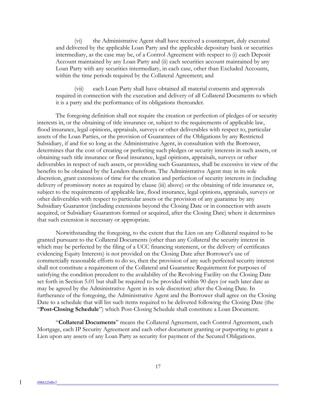 (vi) the Administrative Agent shall have received a counterpart, duly executed and delivered by the applicable Loan Party and the applicable depositary bank or securities intermediary, as the case may be, of a Control Agreement with respect to (i) each Deposit Account maintained by any Loan Party and (ii) each securities account maintained by any Loan Party with any securities intermediary, in each case, other than Excluded Accounts, within the time periods required by the Collateral Agreement; and (vii) each Loan Party shall have obtained all material consents and approvals required in connection with the execution and delivery of all Collateral Documents to which it is a party and the performance of its obligations thereunder. The foregoing definition shall not require the creation or perfection of pledges of or security interests in, or the obtaining of title insurance or, subject to the requirements of applicable law, flood insurance, legal opinions, appraisals, surveys or other deliverables with respect to, particular assets of the Loan Parties, or the provision of Guarantees of the Obligations by any Restricted Subsidiary, if and for so long as the Administrative Agent, in consultation with the Borrower, determines that the cost of creating or perfecting such pledges or security interests in such assets, or obtaining such title insurance or flood insurance, legal opinions, appraisals, surveys or other deliverables in respect of such assets, or providing such Guarantees, shall be excessive in view of the benefits to be obtained by the Lenders therefrom. The Administrative Agent may in its sole discretion, grant extensions of time for the creation and perfection of security interests in (including delivery of promissory notes as required by clause (iii) above) or the obtaining of title insurance or, subject to the requirements of applicable law, flood insurance, legal opinions, appraisals, surveys or other deliverables with respect to particular assets or the provision of any guarantee by any Subsidiary Guarantor (including extensions beyond the Closing Date or in connection with assets acquired, or Subsidiary Guarantors formed or acquired, after the Closing Date) where it determines that such extension is necessary or appropriate. Notwithstanding the foregoing, to the extent that the Lien on any Collateral required to be granted pursuant to the Collateral Documents (other than any Collateral the security interest in which may be perfected by the filing of a UCC financing statement, or the delivery of certificates evidencing Equity Interests) is not provided on the Closing Date after Borrower’s use of commercially reasonable efforts to do so, then the provision of any such perfected security interest shall not constitute a requirement of the Collateral and Guarantee Requirement for purposes of satisfying the condition precedent to the availability of the Revolving Facility on the Closing Date set forth in Section 5.01 but shall be required to be provided within 90 days (or such later date as may be agreed by the Administrative Agent in its sole discretion) after the Closing Date. In furtherance of the foregoing, the Administrative Agent and the Borrower shall agree on the Closing Date to a schedule that will list such items required to be delivered following the Closing Date (the “Post-Closing Schedule”) which Post-Closing Schedule shall constitute a Loan Document. “Collateral Documents” means the Collateral Agreement, each Control Agreement, each Mortgage, each IP Security Agreement and each other document granting or purporting to grant a Lien upon any assets of any Loan Party as security for payment of the Secured Obligations. 17 #98412540v7