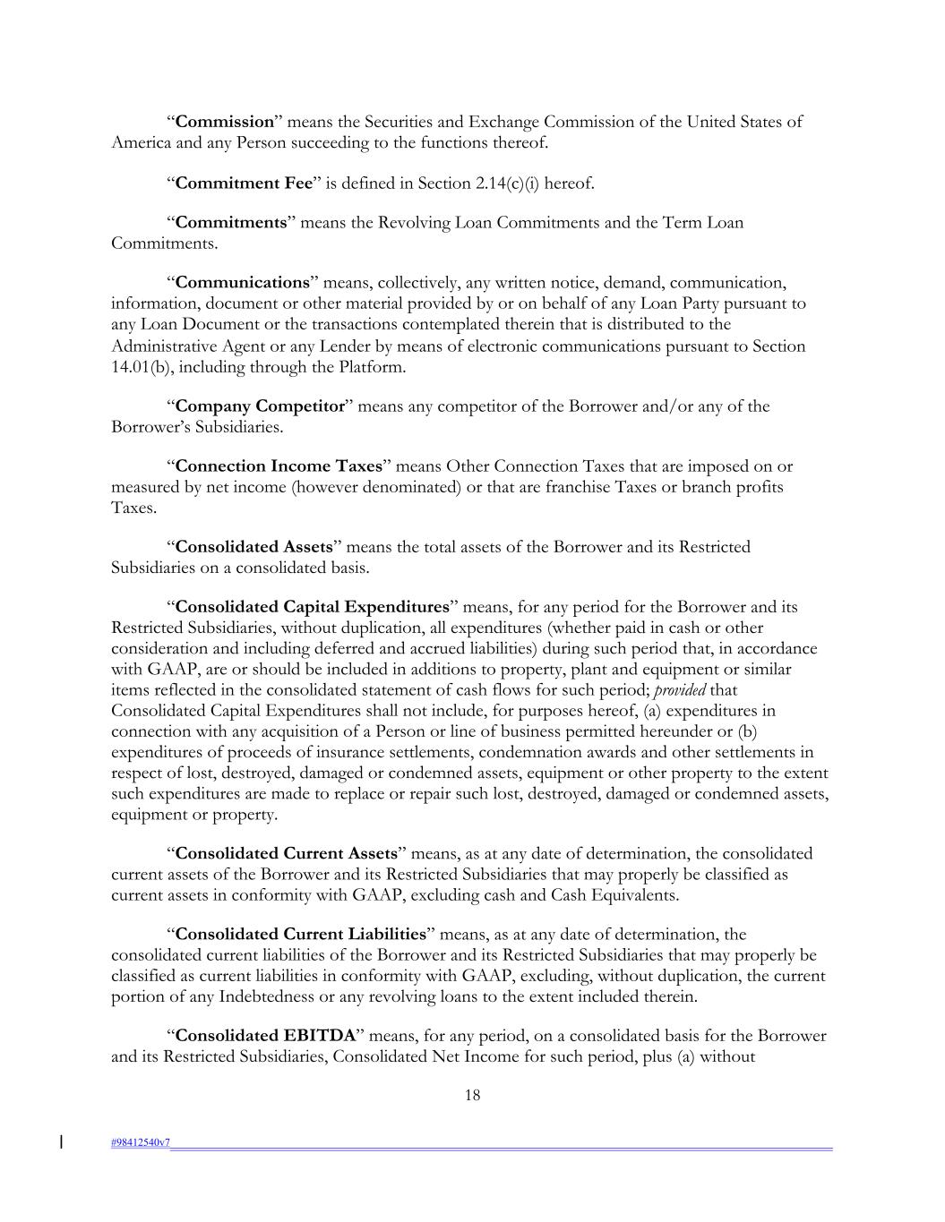 “Commission” means the Securities and Exchange Commission of the United States of America and any Person succeeding to the functions thereof. “Commitment Fee” is defined in Section 2.14(c)(i) hereof. “Commitments” means the Revolving Loan Commitments and the Term Loan Commitments. “Communications” means, collectively, any written notice, demand, communication, information, document or other material provided by or on behalf of any Loan Party pursuant to any Loan Document or the transactions contemplated therein that is distributed to the Administrative Agent or any Lender by means of electronic communications pursuant to Section 14.01(b), including through the Platform. “Company Competitor” means any competitor of the Borrower and/or any of the Borrower’s Subsidiaries. “Connection Income Taxes” means Other Connection Taxes that are imposed on or measured by net income (however denominated) or that are franchise Taxes or branch profits Taxes. “Consolidated Assets” means the total assets of the Borrower and its Restricted Subsidiaries on a consolidated basis. “Consolidated Capital Expenditures” means, for any period for the Borrower and its Restricted Subsidiaries, without duplication, all expenditures (whether paid in cash or other consideration and including deferred and accrued liabilities) during such period that, in accordance with GAAP, are or should be included in additions to property, plant and equipment or similar items reflected in the consolidated statement of cash flows for such period; provided that Consolidated Capital Expenditures shall not include, for purposes hereof, (a) expenditures in connection with any acquisition of a Person or line of business permitted hereunder or (b) expenditures of proceeds of insurance settlements, condemnation awards and other settlements in respect of lost, destroyed, damaged or condemned assets, equipment or other property to the extent such expenditures are made to replace or repair such lost, destroyed, damaged or condemned assets, equipment or property. “Consolidated Current Assets” means, as at any date of determination, the consolidated current assets of the Borrower and its Restricted Subsidiaries that may properly be classified as current assets in conformity with GAAP, excluding cash and Cash Equivalents. “Consolidated Current Liabilities” means, as at any date of determination, the consolidated current liabilities of the Borrower and its Restricted Subsidiaries that may properly be classified as current liabilities in conformity with GAAP, excluding, without duplication, the current portion of any Indebtedness or any revolving loans to the extent included therein. “Consolidated EBITDA” means, for any period, on a consolidated basis for the Borrower and its Restricted Subsidiaries, Consolidated Net Income for such period, plus (a) without 18 #98412540v7