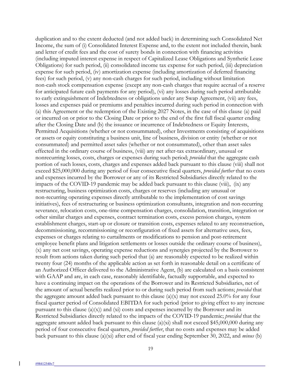 duplication and to the extent deducted (and not added back) in determining such Consolidated Net Income, the sum of (i) Consolidated Interest Expense and, to the extent not included therein, bank and letter of credit fees and the cost of surety bonds in connection with financing activities (including imputed interest expense in respect of Capitalized Lease Obligations and Synthetic Lease Obligations) for such period, (ii) consolidated income tax expense for such period, (iii) depreciation expense for such period, (iv) amortization expense (including amortization of deferred financing fees) for such period, (v) any non-cash charges for such period, including without limitation non-cash stock compensation expense (except any non-cash charges that require accrual of a reserve for anticipated future cash payments for any period), (vi) any losses during such period attributable to early extinguishment of Indebtedness or obligations under any Swap Agreement, (vii) any fees, losses and expenses paid or premiums and penalties incurred during such period in connection with (a) this Agreement or the redemption of the Existing 2027 Notes, in the case of this clause (a) paid or incurred on or prior to the Closing Date or prior to the end of the first full fiscal quarter ending after the Closing Date and (b) the issuance or incurrence of Indebtedness or Equity Interests, Permitted Acquisitions (whether or not consummated), other Investments consisting of acquisitions or assets or equity constituting a business unit, line of business, division or entity (whether or not consummated) and permitted asset sales (whether or not consummated), other than asset sales effected in the ordinary course of business, (viii) any net after-tax extraordinary, unusual or nonrecurring losses, costs, charges or expenses during such period; provided that the aggregate cash portion of such losses, costs, charges and expenses added back pursuant to this clause (viii) shall not exceed $25,000,000 during any period of four consecutive fiscal quarters, provided further that no costs and expenses incurred by the Borrower or any of its Restricted Subsidiaries directly related to the impacts of the COVID-19 pandemic may be added back pursuant to this clause (viii), (ix) any restructuring, business optimization costs, charges or reserves (including any unusual or non-recurring operating expenses directly attributable to the implementation of cost savings initiatives), fees of restructuring or business optimization consultants, integration and non-recurring severance, relocation costs, one-time compensation charges, consolidation, transition, integration or other similar charges and expenses, contract termination costs, excess pension charges, system establishment charges, start-up or closure or transition costs, expenses related to any reconstruction, decommissioning, recommissioning or reconfiguration of fixed assets for alternative uses, fees, expenses or charges relating to curtailments or modifications to pension and post-retirement employee benefit plans and litigation settlements or losses outside the ordinary course of business), (x) any net cost savings, operating expense reductions and synergies projected by the Borrower to result from actions taken during such period that (a) are reasonably expected to be realized within twenty four (24) months of the applicable action as set forth in reasonable detail on a certificate of an Authorized Officer delivered to the Administrative Agent, (b) are calculated on a basis consistent with GAAP and are, in each case, reasonably identifiable, factually supportable, and expected to have a continuing impact on the operations of the Borrower and its Restricted Subsidiaries, net of the amount of actual benefits realized prior to or during such period from such actions; provided that the aggregate amount added back pursuant to this clause (a)(x) may not exceed 25.0% for any four fiscal quarter period of Consolidated EBITDA for such period (prior to giving effect to any increase pursuant to this clause (a)(x)) and (xi) costs and expenses incurred by the Borrower and its Restricted Subsidiaries directly related to the impacts of the COVID-19 pandemic; provided that the aggregate amount added back pursuant to this clause (a)(xi) shall not exceed $45,000,000 during any period of four consecutive fiscal quarters, provided further, that no costs and expenses may be added back pursuant to this clause (a)(xi) after end of fiscal year ending September 30, 2022, and minus (b) 19 #98412540v7