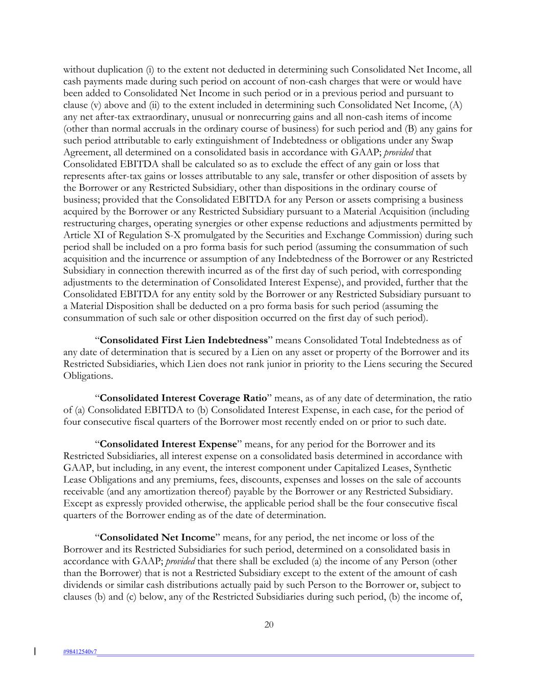 without duplication (i) to the extent not deducted in determining such Consolidated Net Income, all cash payments made during such period on account of non-cash charges that were or would have been added to Consolidated Net Income in such period or in a previous period and pursuant to clause (v) above and (ii) to the extent included in determining such Consolidated Net Income, (A) any net after-tax extraordinary, unusual or nonrecurring gains and all non-cash items of income (other than normal accruals in the ordinary course of business) for such period and (B) any gains for such period attributable to early extinguishment of Indebtedness or obligations under any Swap Agreement, all determined on a consolidated basis in accordance with GAAP; provided that Consolidated EBITDA shall be calculated so as to exclude the effect of any gain or loss that represents after-tax gains or losses attributable to any sale, transfer or other disposition of assets by the Borrower or any Restricted Subsidiary, other than dispositions in the ordinary course of business; provided that the Consolidated EBITDA for any Person or assets comprising a business acquired by the Borrower or any Restricted Subsidiary pursuant to a Material Acquisition (including restructuring charges, operating synergies or other expense reductions and adjustments permitted by Article XI of Regulation S-X promulgated by the Securities and Exchange Commission) during such period shall be included on a pro forma basis for such period (assuming the consummation of such acquisition and the incurrence or assumption of any Indebtedness of the Borrower or any Restricted Subsidiary in connection therewith incurred as of the first day of such period, with corresponding adjustments to the determination of Consolidated Interest Expense), and provided, further that the Consolidated EBITDA for any entity sold by the Borrower or any Restricted Subsidiary pursuant to a Material Disposition shall be deducted on a pro forma basis for such period (assuming the consummation of such sale or other disposition occurred on the first day of such period). “Consolidated First Lien Indebtedness” means Consolidated Total Indebtedness as of any date of determination that is secured by a Lien on any asset or property of the Borrower and its Restricted Subsidiaries, which Lien does not rank junior in priority to the Liens securing the Secured Obligations. “Consolidated Interest Coverage Ratio” means, as of any date of determination, the ratio of (a) Consolidated EBITDA to (b) Consolidated Interest Expense, in each case, for the period of four consecutive fiscal quarters of the Borrower most recently ended on or prior to such date. “Consolidated Interest Expense” means, for any period for the Borrower and its Restricted Subsidiaries, all interest expense on a consolidated basis determined in accordance with GAAP, but including, in any event, the interest component under Capitalized Leases, Synthetic Lease Obligations and any premiums, fees, discounts, expenses and losses on the sale of accounts receivable (and any amortization thereof) payable by the Borrower or any Restricted Subsidiary. Except as expressly provided otherwise, the applicable period shall be the four consecutive fiscal quarters of the Borrower ending as of the date of determination. “Consolidated Net Income” means, for any period, the net income or loss of the Borrower and its Restricted Subsidiaries for such period, determined on a consolidated basis in accordance with GAAP; provided that there shall be excluded (a) the income of any Person (other than the Borrower) that is not a Restricted Subsidiary except to the extent of the amount of cash dividends or similar cash distributions actually paid by such Person to the Borrower or, subject to clauses (b) and (c) below, any of the Restricted Subsidiaries during such period, (b) the income of, 20 #98412540v7