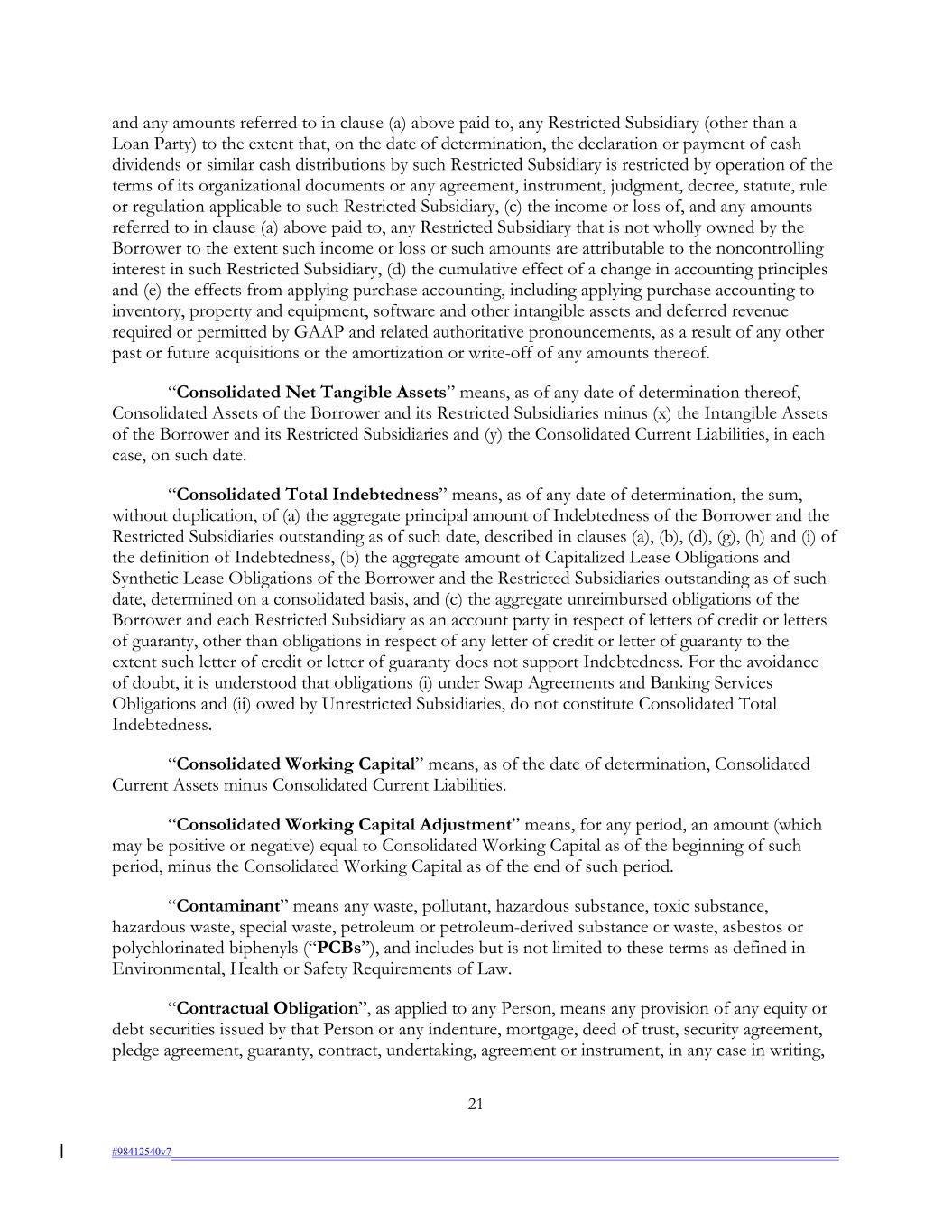 and any amounts referred to in clause (a) above paid to, any Restricted Subsidiary (other than a Loan Party) to the extent that, on the date of determination, the declaration or payment of cash dividends or similar cash distributions by such Restricted Subsidiary is restricted by operation of the terms of its organizational documents or any agreement, instrument, judgment, decree, statute, rule or regulation applicable to such Restricted Subsidiary, (c) the income or loss of, and any amounts referred to in clause (a) above paid to, any Restricted Subsidiary that is not wholly owned by the Borrower to the extent such income or loss or such amounts are attributable to the noncontrolling interest in such Restricted Subsidiary, (d) the cumulative effect of a change in accounting principles and (e) the effects from applying purchase accounting, including applying purchase accounting to inventory, property and equipment, software and other intangible assets and deferred revenue required or permitted by GAAP and related authoritative pronouncements, as a result of any other past or future acquisitions or the amortization or write-off of any amounts thereof. “Consolidated Net Tangible Assets” means, as of any date of determination thereof, Consolidated Assets of the Borrower and its Restricted Subsidiaries minus (x) the Intangible Assets of the Borrower and its Restricted Subsidiaries and (y) the Consolidated Current Liabilities, in each case, on such date. “Consolidated Total Indebtedness” means, as of any date of determination, the sum, without duplication, of (a) the aggregate principal amount of Indebtedness of the Borrower and the Restricted Subsidiaries outstanding as of such date, described in clauses (a), (b), (d), (g), (h) and (i) of the definition of Indebtedness, (b) the aggregate amount of Capitalized Lease Obligations and Synthetic Lease Obligations of the Borrower and the Restricted Subsidiaries outstanding as of such date, determined on a consolidated basis, and (c) the aggregate unreimbursed obligations of the Borrower and each Restricted Subsidiary as an account party in respect of letters of credit or letters of guaranty, other than obligations in respect of any letter of credit or letter of guaranty to the extent such letter of credit or letter of guaranty does not support Indebtedness. For the avoidance of doubt, it is understood that obligations (i) under Swap Agreements and Banking Services Obligations and (ii) owed by Unrestricted Subsidiaries, do not constitute Consolidated Total Indebtedness. “Consolidated Working Capital” means, as of the date of determination, Consolidated Current Assets minus Consolidated Current Liabilities. “Consolidated Working Capital Adjustment” means, for any period, an amount (which may be positive or negative) equal to Consolidated Working Capital as of the beginning of such period, minus the Consolidated Working Capital as of the end of such period. “Contaminant” means any waste, pollutant, hazardous substance, toxic substance, hazardous waste, special waste, petroleum or petroleum-derived substance or waste, asbestos or polychlorinated biphenyls (“PCBs”), and includes but is not limited to these terms as defined in Environmental, Health or Safety Requirements of Law. “Contractual Obligation”, as applied to any Person, means any provision of any equity or debt securities issued by that Person or any indenture, mortgage, deed of trust, security agreement, pledge agreement, guaranty, contract, undertaking, agreement or instrument, in any case in writing, 21 #98412540v7
