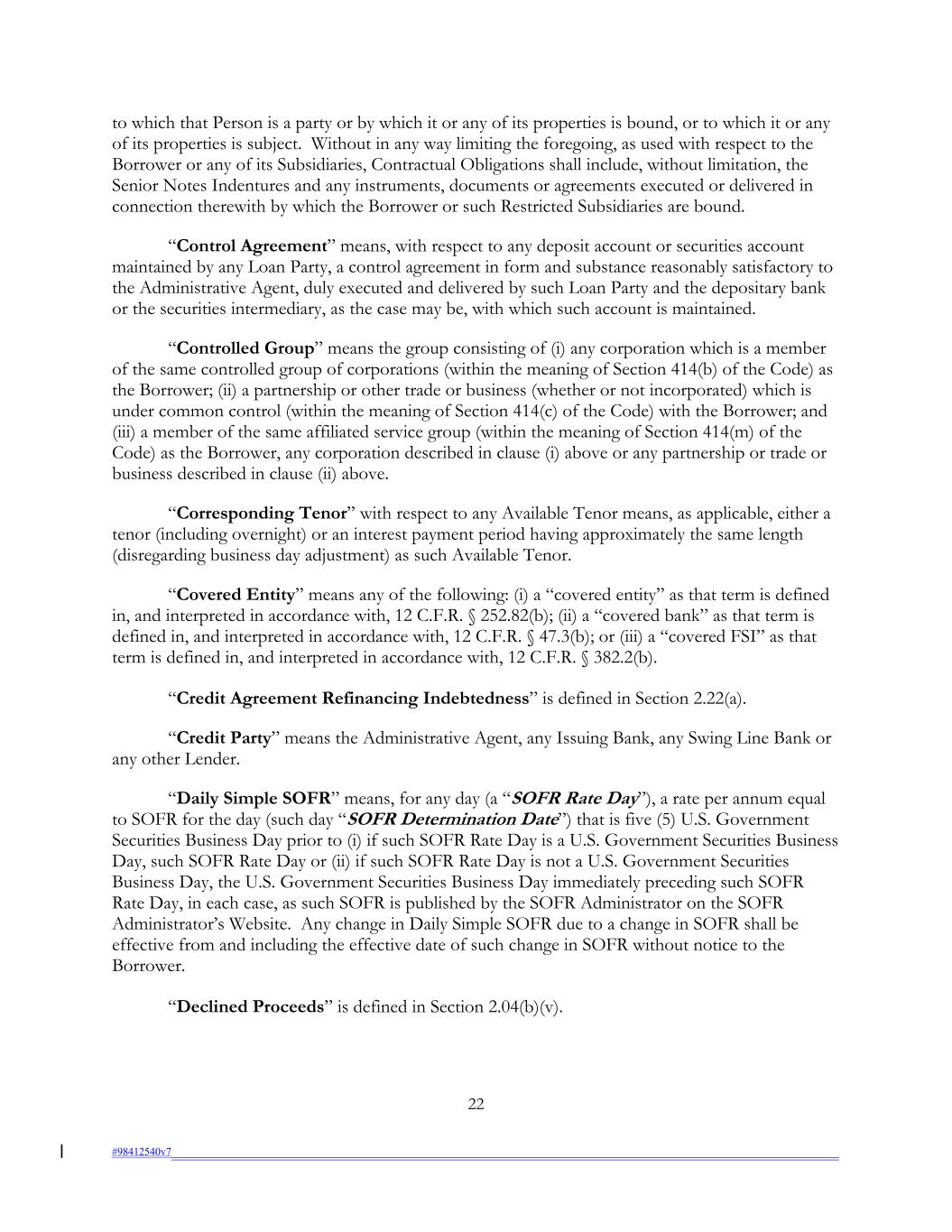 to which that Person is a party or by which it or any of its properties is bound, or to which it or any of its properties is subject. Without in any way limiting the foregoing, as used with respect to the Borrower or any of its Subsidiaries, Contractual Obligations shall include, without limitation, the Senior Notes Indentures and any instruments, documents or agreements executed or delivered in connection therewith by which the Borrower or such Restricted Subsidiaries are bound. “Control Agreement” means, with respect to any deposit account or securities account maintained by any Loan Party, a control agreement in form and substance reasonably satisfactory to the Administrative Agent, duly executed and delivered by such Loan Party and the depositary bank or the securities intermediary, as the case may be, with which such account is maintained. “Controlled Group” means the group consisting of (i) any corporation which is a member of the same controlled group of corporations (within the meaning of Section 414(b) of the Code) as the Borrower; (ii) a partnership or other trade or business (whether or not incorporated) which is under common control (within the meaning of Section 414(c) of the Code) with the Borrower; and (iii) a member of the same affiliated service group (within the meaning of Section 414(m) of the Code) as the Borrower, any corporation described in clause (i) above or any partnership or trade or business described in clause (ii) above. “Corresponding Tenor” with respect to any Available Tenor means, as applicable, either a tenor (including overnight) or an interest payment period having approximately the same length (disregarding business day adjustment) as such Available Tenor. “Covered Entity” means any of the following: (i) a “covered entity” as that term is defined in, and interpreted in accordance with, 12 C.F.R. § 252.82(b); (ii) a “covered bank” as that term is defined in, and interpreted in accordance with, 12 C.F.R. § 47.3(b); or (iii) a “covered FSI” as that term is defined in, and interpreted in accordance with, 12 C.F.R. § 382.2(b). “Credit Agreement Refinancing Indebtedness” is defined in Section 2.22(a). “Credit Party” means the Administrative Agent, any Issuing Bank, any Swing Line Bank or any other Lender. “Daily Simple SOFR” means, for any day (a “SOFR Rate Day”), a rate per annum equal to SOFR for the day (such day “SOFR Determination Date”) that is five (5) U.S. Government Securities Business Day prior to (i) if such SOFR Rate Day is a U.S. Government Securities Business Day, such SOFR Rate Day or (ii) if such SOFR Rate Day is not a U.S. Government Securities Business Day, the U.S. Government Securities Business Day immediately preceding such SOFR Rate Day, in each case, as such SOFR is published by the SOFR Administrator on the SOFR Administrator’s Website. Any change in Daily Simple SOFR due to a change in SOFR shall be effective from and including the effective date of such change in SOFR without notice to the Borrower. “Declined Proceeds” is defined in Section 2.04(b)(v). 22 #98412540v7
