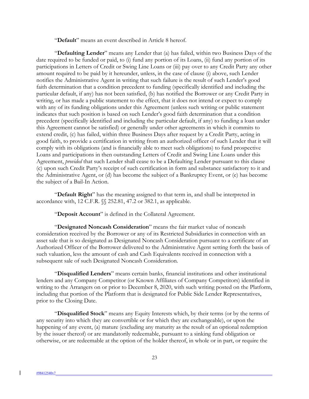 “Default” means an event described in Article 8 hereof. “Defaulting Lender” means any Lender that (a) has failed, within two Business Days of the date required to be funded or paid, to (i) fund any portion of its Loans, (ii) fund any portion of its participations in Letters of Credit or Swing Line Loans or (iii) pay over to any Credit Party any other amount required to be paid by it hereunder, unless, in the case of clause (i) above, such Lender notifies the Administrative Agent in writing that such failure is the result of such Lender’s good faith determination that a condition precedent to funding (specifically identified and including the particular default, if any) has not been satisfied, (b) has notified the Borrower or any Credit Party in writing, or has made a public statement to the effect, that it does not intend or expect to comply with any of its funding obligations under this Agreement (unless such writing or public statement indicates that such position is based on such Lender’s good faith determination that a condition precedent (specifically identified and including the particular default, if any) to funding a loan under this Agreement cannot be satisfied) or generally under other agreements in which it commits to extend credit, (c) has failed, within three Business Days after request by a Credit Party, acting in good faith, to provide a certification in writing from an authorized officer of such Lender that it will comply with its obligations (and is financially able to meet such obligations) to fund prospective Loans and participations in then outstanding Letters of Credit and Swing Line Loans under this Agreement, provided that such Lender shall cease to be a Defaulting Lender pursuant to this clause (c) upon such Credit Party’s receipt of such certification in form and substance satisfactory to it and the Administrative Agent, or (d) has become the subject of a Bankruptcy Event, or (e) has become the subject of a Bail-In Action. “Default Right” has the meaning assigned to that term in, and shall be interpreted in accordance with, 12 C.F.R. §§ 252.81, 47.2 or 382.1, as applicable. “Deposit Account” is defined in the Collateral Agreement. “Designated Noncash Consideration” means the fair market value of noncash consideration received by the Borrower or any of its Restricted Subsidiaries in connection with an asset sale that is so designated as Designated Noncash Consideration pursuant to a certificate of an Authorized Officer of the Borrower delivered to the Administrative Agent setting forth the basis of such valuation, less the amount of cash and Cash Equivalents received in connection with a subsequent sale of such Designated Noncash Consideration. “Disqualified Lenders” means certain banks, financial institutions and other institutional lenders and any Company Competitor (or Known Affiliates of Company Competitors) identified in writing to the Arrangers on or prior to December 8, 2020, with such writing posted on the Platform, including that portion of the Platform that is designated for Public Side Lender Representatives, prior to the Closing Date. “Disqualified Stock” means any Equity Interests which, by their terms (or by the terms of any security into which they are convertible or for which they are exchangeable), or upon the happening of any event, (a) mature (excluding any maturity as the result of an optional redemption by the issuer thereof) or are mandatorily redeemable, pursuant to a sinking fund obligation or otherwise, or are redeemable at the option of the holder thereof, in whole or in part, or require the 23 #98412540v7