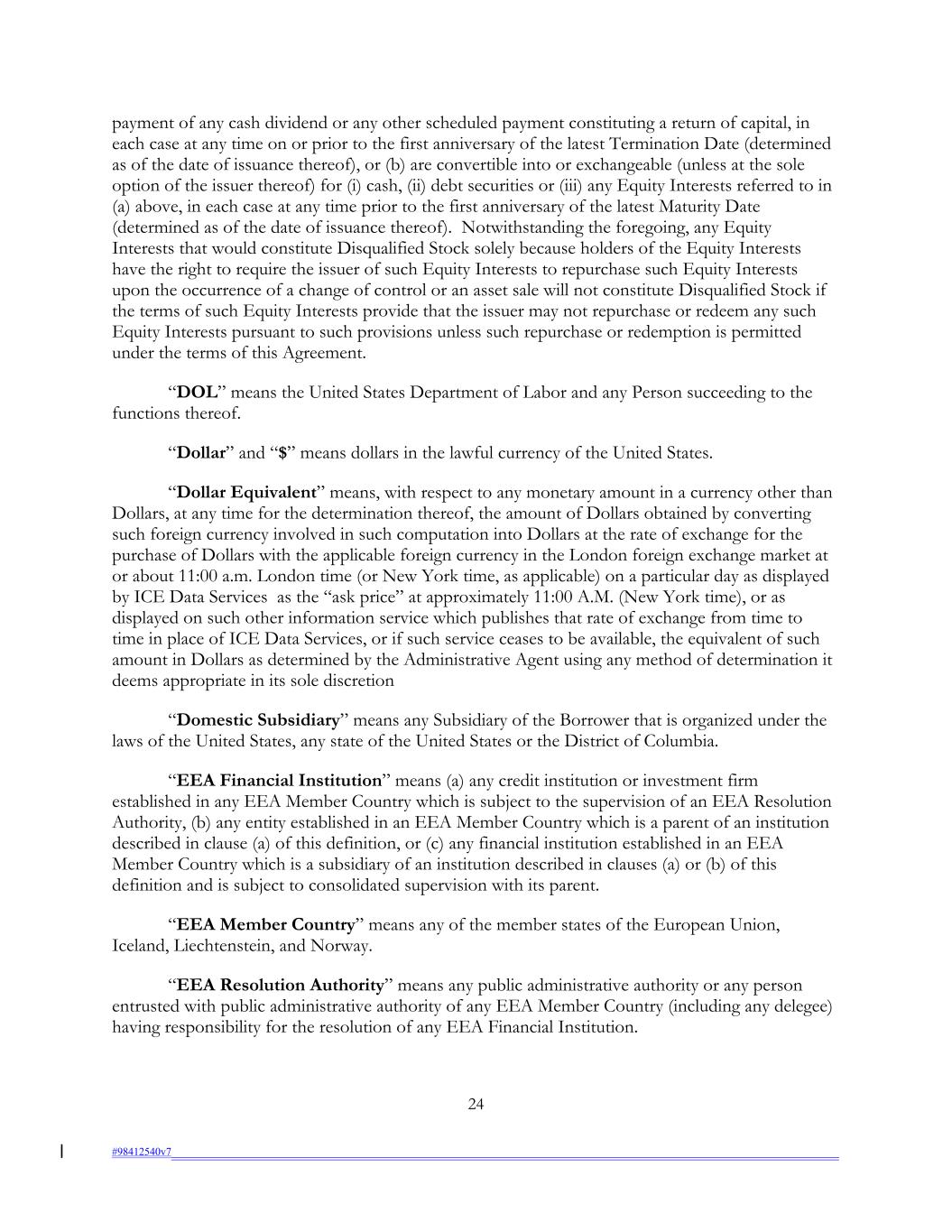 payment of any cash dividend or any other scheduled payment constituting a return of capital, in each case at any time on or prior to the first anniversary of the latest Termination Date (determined as of the date of issuance thereof), or (b) are convertible into or exchangeable (unless at the sole option of the issuer thereof) for (i) cash, (ii) debt securities or (iii) any Equity Interests referred to in (a) above, in each case at any time prior to the first anniversary of the latest Maturity Date (determined as of the date of issuance thereof). Notwithstanding the foregoing, any Equity Interests that would constitute Disqualified Stock solely because holders of the Equity Interests have the right to require the issuer of such Equity Interests to repurchase such Equity Interests upon the occurrence of a change of control or an asset sale will not constitute Disqualified Stock if the terms of such Equity Interests provide that the issuer may not repurchase or redeem any such Equity Interests pursuant to such provisions unless such repurchase or redemption is permitted under the terms of this Agreement. “DOL” means the United States Department of Labor and any Person succeeding to the functions thereof. “Dollar” and “$” means dollars in the lawful currency of the United States. “Dollar Equivalent” means, with respect to any monetary amount in a currency other than Dollars, at any time for the determination thereof, the amount of Dollars obtained by converting such foreign currency involved in such computation into Dollars at the rate of exchange for the purchase of Dollars with the applicable foreign currency in the London foreign exchange market at or about 11:00 a.m. London time (or New York time, as applicable) on a particular day as displayed by ICE Data Services as the “ask price” at approximately 11:00 A.M. (New York time), or as displayed on such other information service which publishes that rate of exchange from time to time in place of ICE Data Services, or if such service ceases to be available, the equivalent of such amount in Dollars as determined by the Administrative Agent using any method of determination it deems appropriate in its sole discretion “Domestic Subsidiary” means any Subsidiary of the Borrower that is organized under the laws of the United States, any state of the United States or the District of Columbia. “EEA Financial Institution” means (a) any credit institution or investment firm established in any EEA Member Country which is subject to the supervision of an EEA Resolution Authority, (b) any entity established in an EEA Member Country which is a parent of an institution described in clause (a) of this definition, or (c) any financial institution established in an EEA Member Country which is a subsidiary of an institution described in clauses (a) or (b) of this definition and is subject to consolidated supervision with its parent. “EEA Member Country” means any of the member states of the European Union, Iceland, Liechtenstein, and Norway. “EEA Resolution Authority” means any public administrative authority or any person entrusted with public administrative authority of any EEA Member Country (including any delegee) having responsibility for the resolution of any EEA Financial Institution. 24 #98412540v7