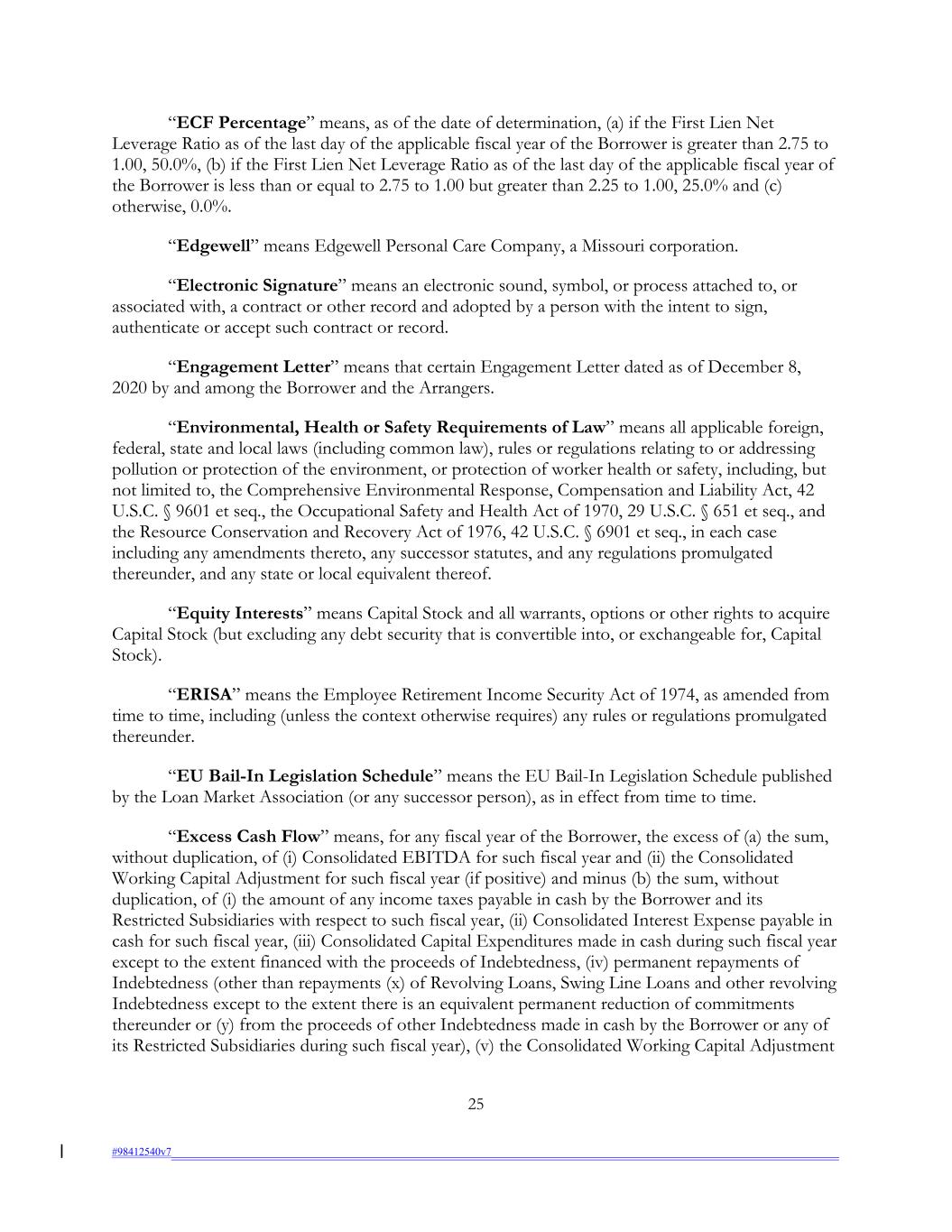“ECF Percentage” means, as of the date of determination, (a) if the First Lien Net Leverage Ratio as of the last day of the applicable fiscal year of the Borrower is greater than 2.75 to 1.00, 50.0%, (b) if the First Lien Net Leverage Ratio as of the last day of the applicable fiscal year of the Borrower is less than or equal to 2.75 to 1.00 but greater than 2.25 to 1.00, 25.0% and (c) otherwise, 0.0%. “Edgewell” means Edgewell Personal Care Company, a Missouri corporation. “Electronic Signature” means an electronic sound, symbol, or process attached to, or associated with, a contract or other record and adopted by a person with the intent to sign, authenticate or accept such contract or record. “Engagement Letter” means that certain Engagement Letter dated as of December 8, 2020 by and among the Borrower and the Arrangers. “Environmental, Health or Safety Requirements of Law” means all applicable foreign, federal, state and local laws (including common law), rules or regulations relating to or addressing pollution or protection of the environment, or protection of worker health or safety, including, but not limited to, the Comprehensive Environmental Response, Compensation and Liability Act, 42 U.S.C. § 9601 et seq., the Occupational Safety and Health Act of 1970, 29 U.S.C. § 651 et seq., and the Resource Conservation and Recovery Act of 1976, 42 U.S.C. § 6901 et seq., in each case including any amendments thereto, any successor statutes, and any regulations promulgated thereunder, and any state or local equivalent thereof. “Equity Interests” means Capital Stock and all warrants, options or other rights to acquire Capital Stock (but excluding any debt security that is convertible into, or exchangeable for, Capital Stock). “ERISA” means the Employee Retirement Income Security Act of 1974, as amended from time to time, including (unless the context otherwise requires) any rules or regulations promulgated thereunder. “EU Bail-In Legislation Schedule” means the EU Bail-In Legislation Schedule published by the Loan Market Association (or any successor person), as in effect from time to time. “Excess Cash Flow” means, for any fiscal year of the Borrower, the excess of (a) the sum, without duplication, of (i) Consolidated EBITDA for such fiscal year and (ii) the Consolidated Working Capital Adjustment for such fiscal year (if positive) and minus (b) the sum, without duplication, of (i) the amount of any income taxes payable in cash by the Borrower and its Restricted Subsidiaries with respect to such fiscal year, (ii) Consolidated Interest Expense payable in cash for such fiscal year, (iii) Consolidated Capital Expenditures made in cash during such fiscal year except to the extent financed with the proceeds of Indebtedness, (iv) permanent repayments of Indebtedness (other than repayments (x) of Revolving Loans, Swing Line Loans and other revolving Indebtedness except to the extent there is an equivalent permanent reduction of commitments thereunder or (y) from the proceeds of other Indebtedness made in cash by the Borrower or any of its Restricted Subsidiaries during such fiscal year), (v) the Consolidated Working Capital Adjustment 25 #98412540v7