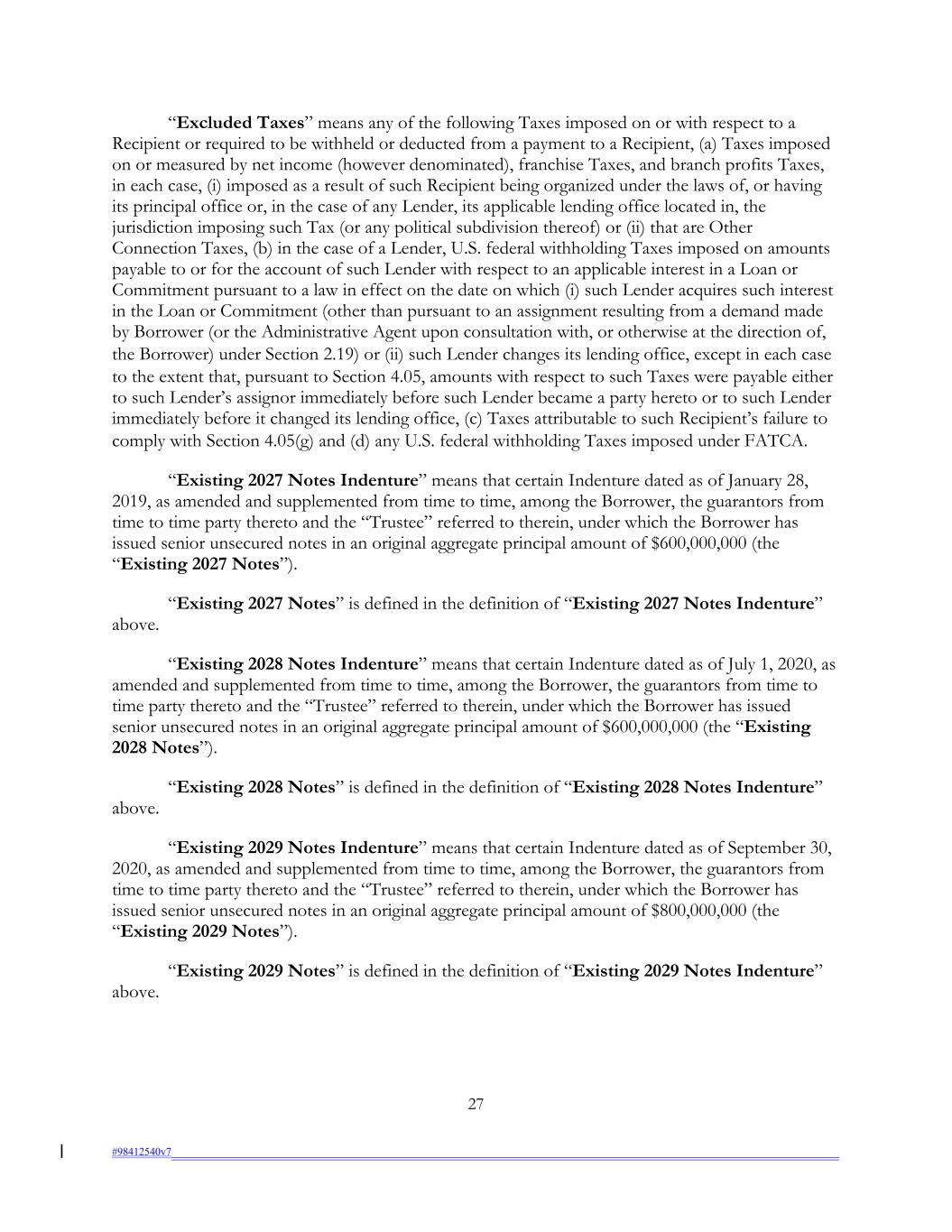 “Excluded Taxes” means any of the following Taxes imposed on or with respect to a Recipient or required to be withheld or deducted from a payment to a Recipient, (a) Taxes imposed on or measured by net income (however denominated), franchise Taxes, and branch profits Taxes, in each case, (i) imposed as a result of such Recipient being organized under the laws of, or having its principal office or, in the case of any Lender, its applicable lending office located in, the jurisdiction imposing such Tax (or any political subdivision thereof) or (ii) that are Other Connection Taxes, (b) in the case of a Lender, U.S. federal withholding Taxes imposed on amounts payable to or for the account of such Lender with respect to an applicable interest in a Loan or Commitment pursuant to a law in effect on the date on which (i) such Lender acquires such interest in the Loan or Commitment (other than pursuant to an assignment resulting from a demand made by Borrower (or the Administrative Agent upon consultation with, or otherwise at the direction of, the Borrower) under Section 2.19) or (ii) such Lender changes its lending office, except in each case to the extent that, pursuant to Section 4.05, amounts with respect to such Taxes were payable either to such Lender’s assignor immediately before such Lender became a party hereto or to such Lender immediately before it changed its lending office, (c) Taxes attributable to such Recipient’s failure to comply with Section 4.05(g) and (d) any U.S. federal withholding Taxes imposed under FATCA. “Existing 2027 Notes Indenture” means that certain Indenture dated as of January 28, 2019, as amended and supplemented from time to time, among the Borrower, the guarantors from time to time party thereto and the “Trustee” referred to therein, under which the Borrower has issued senior unsecured notes in an original aggregate principal amount of $600,000,000 (the “Existing 2027 Notes”). “Existing 2027 Notes” is defined in the definition of “Existing 2027 Notes Indenture” above. “Existing 2028 Notes Indenture” means that certain Indenture dated as of July 1, 2020, as amended and supplemented from time to time, among the Borrower, the guarantors from time to time party thereto and the “Trustee” referred to therein, under which the Borrower has issued senior unsecured notes in an original aggregate principal amount of $600,000,000 (the “Existing 2028 Notes”). “Existing 2028 Notes” is defined in the definition of “Existing 2028 Notes Indenture” above. “Existing 2029 Notes Indenture” means that certain Indenture dated as of September 30, 2020, as amended and supplemented from time to time, among the Borrower, the guarantors from time to time party thereto and the “Trustee” referred to therein, under which the Borrower has issued senior unsecured notes in an original aggregate principal amount of $800,000,000 (the “Existing 2029 Notes”). “Existing 2029 Notes” is defined in the definition of “Existing 2029 Notes Indenture” above. 27 #98412540v7
