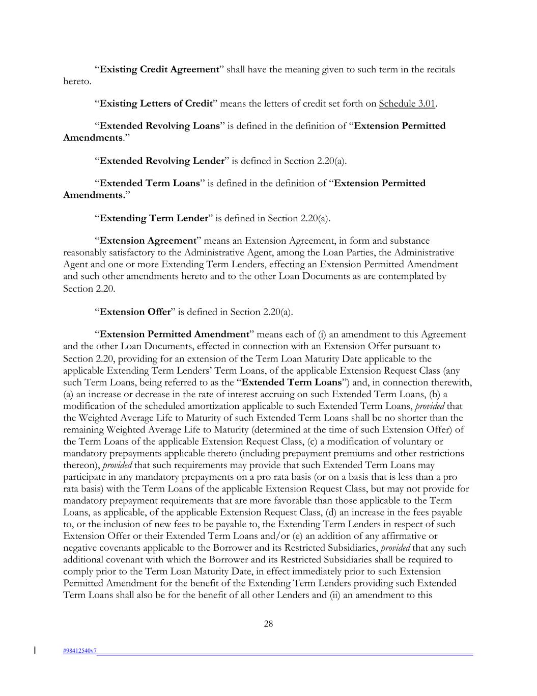 “Existing Credit Agreement” shall have the meaning given to such term in the recitals hereto. “Existing Letters of Credit” means the letters of credit set forth on Schedule 3.01. “Extended Revolving Loans” is defined in the definition of “Extension Permitted Amendments.” “Extended Revolving Lender” is defined in Section 2.20(a). “Extended Term Loans” is defined in the definition of “Extension Permitted Amendments.” “Extending Term Lender” is defined in Section 2.20(a). “Extension Agreement” means an Extension Agreement, in form and substance reasonably satisfactory to the Administrative Agent, among the Loan Parties, the Administrative Agent and one or more Extending Term Lenders, effecting an Extension Permitted Amendment and such other amendments hereto and to the other Loan Documents as are contemplated by Section 2.20. “Extension Offer” is defined in Section 2.20(a). “Extension Permitted Amendment” means each of (i) an amendment to this Agreement and the other Loan Documents, effected in connection with an Extension Offer pursuant to Section 2.20, providing for an extension of the Term Loan Maturity Date applicable to the applicable Extending Term Lenders’ Term Loans, of the applicable Extension Request Class (any such Term Loans, being referred to as the “Extended Term Loans”) and, in connection therewith, (a) an increase or decrease in the rate of interest accruing on such Extended Term Loans, (b) a modification of the scheduled amortization applicable to such Extended Term Loans, provided that the Weighted Average Life to Maturity of such Extended Term Loans shall be no shorter than the remaining Weighted Average Life to Maturity (determined at the time of such Extension Offer) of the Term Loans of the applicable Extension Request Class, (c) a modification of voluntary or mandatory prepayments applicable thereto (including prepayment premiums and other restrictions thereon), provided that such requirements may provide that such Extended Term Loans may participate in any mandatory prepayments on a pro rata basis (or on a basis that is less than a pro rata basis) with the Term Loans of the applicable Extension Request Class, but may not provide for mandatory prepayment requirements that are more favorable than those applicable to the Term Loans, as applicable, of the applicable Extension Request Class, (d) an increase in the fees payable to, or the inclusion of new fees to be payable to, the Extending Term Lenders in respect of such Extension Offer or their Extended Term Loans and/or (e) an addition of any affirmative or negative covenants applicable to the Borrower and its Restricted Subsidiaries, provided that any such additional covenant with which the Borrower and its Restricted Subsidiaries shall be required to comply prior to the Term Loan Maturity Date, in effect immediately prior to such Extension Permitted Amendment for the benefit of the Extending Term Lenders providing such Extended Term Loans shall also be for the benefit of all other Lenders and (ii) an amendment to this 28 #98412540v7