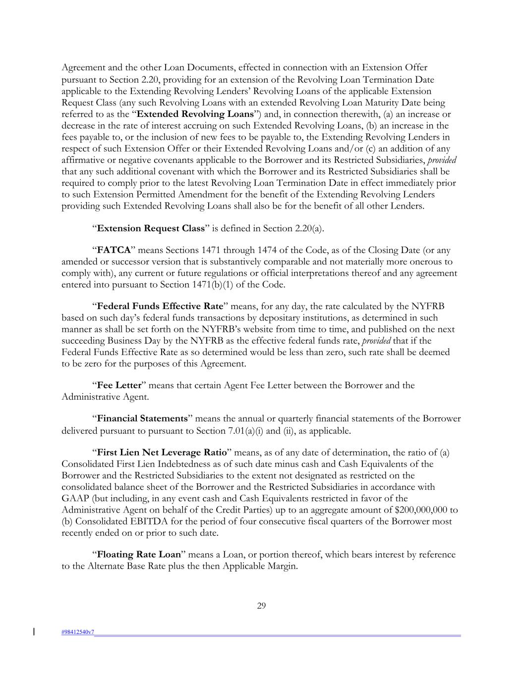 Agreement and the other Loan Documents, effected in connection with an Extension Offer pursuant to Section 2.20, providing for an extension of the Revolving Loan Termination Date applicable to the Extending Revolving Lenders’ Revolving Loans of the applicable Extension Request Class (any such Revolving Loans with an extended Revolving Loan Maturity Date being referred to as the “Extended Revolving Loans”) and, in connection therewith, (a) an increase or decrease in the rate of interest accruing on such Extended Revolving Loans, (b) an increase in the fees payable to, or the inclusion of new fees to be payable to, the Extending Revolving Lenders in respect of such Extension Offer or their Extended Revolving Loans and/or (c) an addition of any affirmative or negative covenants applicable to the Borrower and its Restricted Subsidiaries, provided that any such additional covenant with which the Borrower and its Restricted Subsidiaries shall be required to comply prior to the latest Revolving Loan Termination Date in effect immediately prior to such Extension Permitted Amendment for the benefit of the Extending Revolving Lenders providing such Extended Revolving Loans shall also be for the benefit of all other Lenders. “Extension Request Class” is defined in Section 2.20(a). “FATCA” means Sections 1471 through 1474 of the Code, as of the Closing Date (or any amended or successor version that is substantively comparable and not materially more onerous to comply with), any current or future regulations or official interpretations thereof and any agreement entered into pursuant to Section 1471(b)(1) of the Code. “Federal Funds Effective Rate” means, for any day, the rate calculated by the NYFRB based on such day’s federal funds transactions by depositary institutions, as determined in such manner as shall be set forth on the NYFRB’s website from time to time, and published on the next succeeding Business Day by the NYFRB as the effective federal funds rate, provided that if the Federal Funds Effective Rate as so determined would be less than zero, such rate shall be deemed to be zero for the purposes of this Agreement. “Fee Letter” means that certain Agent Fee Letter between the Borrower and the Administrative Agent. “Financial Statements” means the annual or quarterly financial statements of the Borrower delivered pursuant to pursuant to Section 7.01(a)(i) and (ii), as applicable. “First Lien Net Leverage Ratio” means, as of any date of determination, the ratio of (a) Consolidated First Lien Indebtedness as of such date minus cash and Cash Equivalents of the Borrower and the Restricted Subsidiaries to the extent not designated as restricted on the consolidated balance sheet of the Borrower and the Restricted Subsidiaries in accordance with GAAP (but including, in any event cash and Cash Equivalents restricted in favor of the Administrative Agent on behalf of the Credit Parties) up to an aggregate amount of $200,000,000 to (b) Consolidated EBITDA for the period of four consecutive fiscal quarters of the Borrower most recently ended on or prior to such date. “Floating Rate Loan” means a Loan, or portion thereof, which bears interest by reference to the Alternate Base Rate plus the then Applicable Margin. 29 #98412540v7