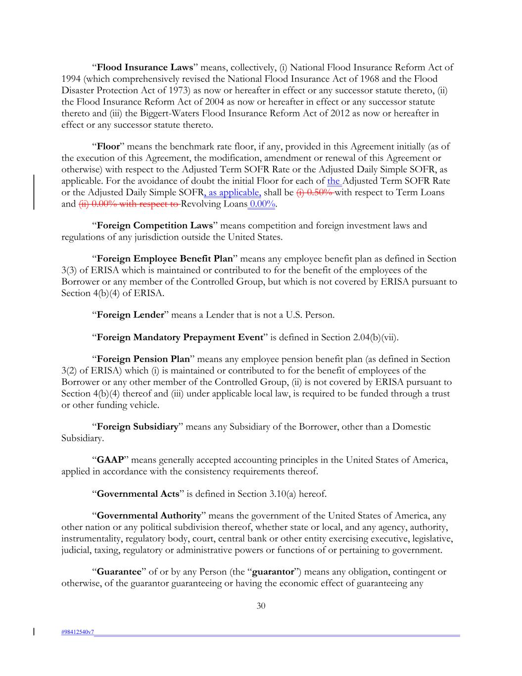 “Flood Insurance Laws” means, collectively, (i) National Flood Insurance Reform Act of 1994 (which comprehensively revised the National Flood Insurance Act of 1968 and the Flood Disaster Protection Act of 1973) as now or hereafter in effect or any successor statute thereto, (ii) the Flood Insurance Reform Act of 2004 as now or hereafter in effect or any successor statute thereto and (iii) the Biggert-Waters Flood Insurance Reform Act of 2012 as now or hereafter in effect or any successor statute thereto. “Floor” means the benchmark rate floor, if any, provided in this Agreement initially (as of the execution of this Agreement, the modification, amendment or renewal of this Agreement or otherwise) with respect to the Adjusted Term SOFR Rate or the Adjusted Daily Simple SOFR, as applicable. For the avoidance of doubt the initial Floor for each of the Adjusted Term SOFR Rate or the Adjusted Daily Simple SOFR, as applicable, shall be (i) 0.50% with respect to Term Loans and (ii) 0.00% with respect to Revolving Loans 0.00%. “Foreign Competition Laws” means competition and foreign investment laws and regulations of any jurisdiction outside the United States. “Foreign Employee Benefit Plan” means any employee benefit plan as defined in Section 3(3) of ERISA which is maintained or contributed to for the benefit of the employees of the Borrower or any member of the Controlled Group, but which is not covered by ERISA pursuant to Section 4(b)(4) of ERISA. “Foreign Lender” means a Lender that is not a U.S. Person. “Foreign Mandatory Prepayment Event” is defined in Section 2.04(b)(vii). “Foreign Pension Plan” means any employee pension benefit plan (as defined in Section 3(2) of ERISA) which (i) is maintained or contributed to for the benefit of employees of the Borrower or any other member of the Controlled Group, (ii) is not covered by ERISA pursuant to Section 4(b)(4) thereof and (iii) under applicable local law, is required to be funded through a trust or other funding vehicle. “Foreign Subsidiary” means any Subsidiary of the Borrower, other than a Domestic Subsidiary. “GAAP” means generally accepted accounting principles in the United States of America, applied in accordance with the consistency requirements thereof. “Governmental Acts” is defined in Section 3.10(a) hereof. “Governmental Authority” means the government of the United States of America, any other nation or any political subdivision thereof, whether state or local, and any agency, authority, instrumentality, regulatory body, court, central bank or other entity exercising executive, legislative, judicial, taxing, regulatory or administrative powers or functions of or pertaining to government. “Guarantee” of or by any Person (the “guarantor”) means any obligation, contingent or otherwise, of the guarantor guaranteeing or having the economic effect of guaranteeing any 30 #98412540v7