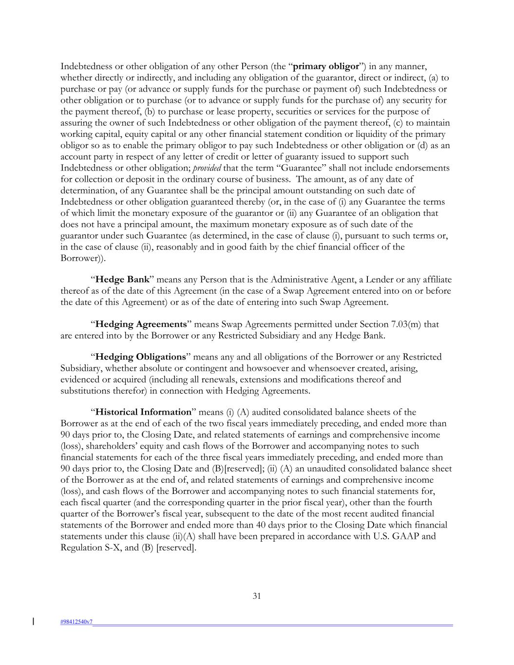 Indebtedness or other obligation of any other Person (the “primary obligor”) in any manner, whether directly or indirectly, and including any obligation of the guarantor, direct or indirect, (a) to purchase or pay (or advance or supply funds for the purchase or payment of) such Indebtedness or other obligation or to purchase (or to advance or supply funds for the purchase of) any security for the payment thereof, (b) to purchase or lease property, securities or services for the purpose of assuring the owner of such Indebtedness or other obligation of the payment thereof, (c) to maintain working capital, equity capital or any other financial statement condition or liquidity of the primary obligor so as to enable the primary obligor to pay such Indebtedness or other obligation or (d) as an account party in respect of any letter of credit or letter of guaranty issued to support such Indebtedness or other obligation; provided that the term “Guarantee” shall not include endorsements for collection or deposit in the ordinary course of business. The amount, as of any date of determination, of any Guarantee shall be the principal amount outstanding on such date of Indebtedness or other obligation guaranteed thereby (or, in the case of (i) any Guarantee the terms of which limit the monetary exposure of the guarantor or (ii) any Guarantee of an obligation that does not have a principal amount, the maximum monetary exposure as of such date of the guarantor under such Guarantee (as determined, in the case of clause (i), pursuant to such terms or, in the case of clause (ii), reasonably and in good faith by the chief financial officer of the Borrower)). “Hedge Bank” means any Person that is the Administrative Agent, a Lender or any affiliate thereof as of the date of this Agreement (in the case of a Swap Agreement entered into on or before the date of this Agreement) or as of the date of entering into such Swap Agreement. “Hedging Agreements” means Swap Agreements permitted under Section 7.03(m) that are entered into by the Borrower or any Restricted Subsidiary and any Hedge Bank. “Hedging Obligations” means any and all obligations of the Borrower or any Restricted Subsidiary, whether absolute or contingent and howsoever and whensoever created, arising, evidenced or acquired (including all renewals, extensions and modifications thereof and substitutions therefor) in connection with Hedging Agreements. “Historical Information” means (i) (A) audited consolidated balance sheets of the Borrower as at the end of each of the two fiscal years immediately preceding, and ended more than 90 days prior to, the Closing Date, and related statements of earnings and comprehensive income (loss), shareholders’ equity and cash flows of the Borrower and accompanying notes to such financial statements for each of the three fiscal years immediately preceding, and ended more than 90 days prior to, the Closing Date and (B)[reserved]; (ii) (A) an unaudited consolidated balance sheet of the Borrower as at the end of, and related statements of earnings and comprehensive income (loss), and cash flows of the Borrower and accompanying notes to such financial statements for, each fiscal quarter (and the corresponding quarter in the prior fiscal year), other than the fourth quarter of the Borrower’s fiscal year, subsequent to the date of the most recent audited financial statements of the Borrower and ended more than 40 days prior to the Closing Date which financial statements under this clause (ii)(A) shall have been prepared in accordance with U.S. GAAP and Regulation S-X, and (B) [reserved]. 31 #98412540v7