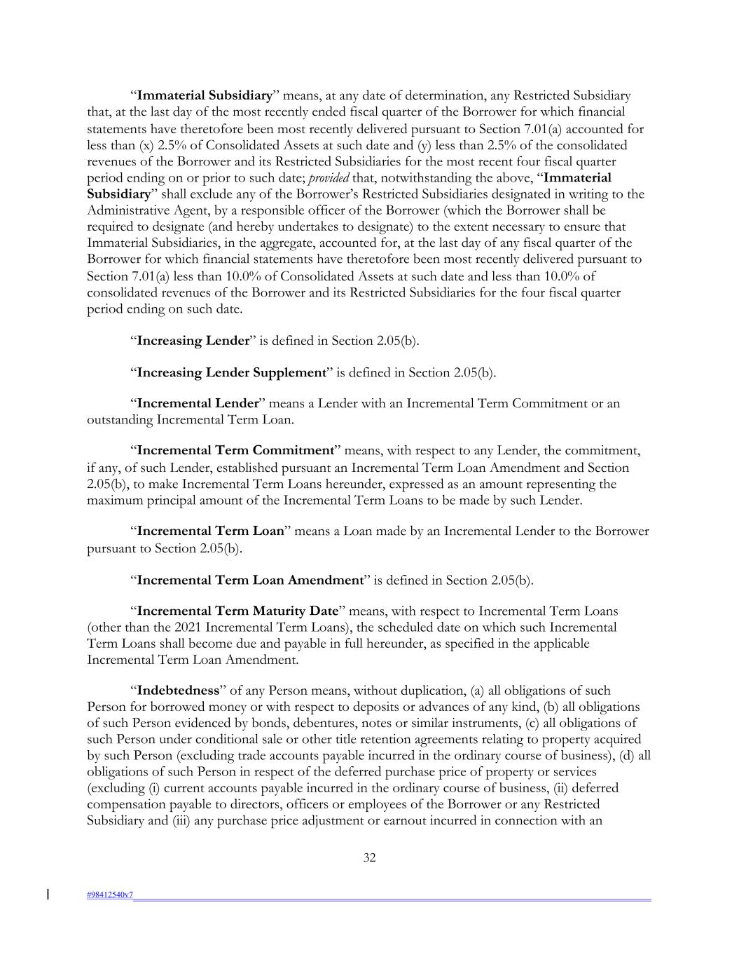 “Immaterial Subsidiary” means, at any date of determination, any Restricted Subsidiary that, at the last day of the most recently ended fiscal quarter of the Borrower for which financial statements have theretofore been most recently delivered pursuant to Section 7.01(a) accounted for less than (x) 2.5% of Consolidated Assets at such date and (y) less than 2.5% of the consolidated revenues of the Borrower and its Restricted Subsidiaries for the most recent four fiscal quarter period ending on or prior to such date; provided that, notwithstanding the above, “Immaterial Subsidiary” shall exclude any of the Borrower’s Restricted Subsidiaries designated in writing to the Administrative Agent, by a responsible officer of the Borrower (which the Borrower shall be required to designate (and hereby undertakes to designate) to the extent necessary to ensure that Immaterial Subsidiaries, in the aggregate, accounted for, at the last day of any fiscal quarter of the Borrower for which financial statements have theretofore been most recently delivered pursuant to Section 7.01(a) less than 10.0% of Consolidated Assets at such date and less than 10.0% of consolidated revenues of the Borrower and its Restricted Subsidiaries for the four fiscal quarter period ending on such date. “Increasing Lender” is defined in Section 2.05(b). “Increasing Lender Supplement” is defined in Section 2.05(b). “Incremental Lender” means a Lender with an Incremental Term Commitment or an outstanding Incremental Term Loan. “Incremental Term Commitment” means, with respect to any Lender, the commitment, if any, of such Lender, established pursuant an Incremental Term Loan Amendment and Section 2.05(b), to make Incremental Term Loans hereunder, expressed as an amount representing the maximum principal amount of the Incremental Term Loans to be made by such Lender. “Incremental Term Loan” means a Loan made by an Incremental Lender to the Borrower pursuant to Section 2.05(b). “Incremental Term Loan Amendment” is defined in Section 2.05(b). “Incremental Term Maturity Date” means, with respect to Incremental Term Loans (other than the 2021 Incremental Term Loans), the scheduled date on which such Incremental Term Loans shall become due and payable in full hereunder, as specified in the applicable Incremental Term Loan Amendment. “Indebtedness” of any Person means, without duplication, (a) all obligations of such Person for borrowed money or with respect to deposits or advances of any kind, (b) all obligations of such Person evidenced by bonds, debentures, notes or similar instruments, (c) all obligations of such Person under conditional sale or other title retention agreements relating to property acquired by such Person (excluding trade accounts payable incurred in the ordinary course of business), (d) all obligations of such Person in respect of the deferred purchase price of property or services (excluding (i) current accounts payable incurred in the ordinary course of business, (ii) deferred compensation payable to directors, officers or employees of the Borrower or any Restricted Subsidiary and (iii) any purchase price adjustment or earnout incurred in connection with an 32 #98412540v7