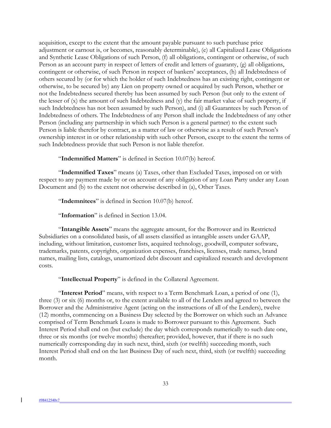 acquisition, except to the extent that the amount payable pursuant to such purchase price adjustment or earnout is, or becomes, reasonably determinable), (e) all Capitalized Lease Obligations and Synthetic Lease Obligations of such Person, (f) all obligations, contingent or otherwise, of such Person as an account party in respect of letters of credit and letters of guaranty, (g) all obligations, contingent or otherwise, of such Person in respect of bankers’ acceptances, (h) all Indebtedness of others secured by (or for which the holder of such Indebtedness has an existing right, contingent or otherwise, to be secured by) any Lien on property owned or acquired by such Person, whether or not the Indebtedness secured thereby has been assumed by such Person (but only to the extent of the lesser of (x) the amount of such Indebtedness and (y) the fair market value of such property, if such Indebtedness has not been assumed by such Person), and (i) all Guarantees by such Person of Indebtedness of others. The Indebtedness of any Person shall include the Indebtedness of any other Person (including any partnership in which such Person is a general partner) to the extent such Person is liable therefor by contract, as a matter of law or otherwise as a result of such Person’s ownership interest in or other relationship with such other Person, except to the extent the terms of such Indebtedness provide that such Person is not liable therefor. “Indemnified Matters” is defined in Section 10.07(b) hereof. “Indemnified Taxes” means (a) Taxes, other than Excluded Taxes, imposed on or with respect to any payment made by or on account of any obligation of any Loan Party under any Loan Document and (b) to the extent not otherwise described in (a), Other Taxes. “Indemnitees” is defined in Section 10.07(b) hereof. “Information” is defined in Section 13.04. “Intangible Assets” means the aggregate amount, for the Borrower and its Restricted Subsidiaries on a consolidated basis, of all assets classified as intangible assets under GAAP, including, without limitation, customer lists, acquired technology, goodwill, computer software, trademarks, patents, copyrights, organization expenses, franchises, licenses, trade names, brand names, mailing lists, catalogs, unamortized debt discount and capitalized research and development costs. “Intellectual Property” is defined in the Collateral Agreement. “Interest Period” means, with respect to a Term Benchmark Loan, a period of one (1), three (3) or six (6) months or, to the extent available to all of the Lenders and agreed to between the Borrower and the Administrative Agent (acting on the instructions of all of the Lenders), twelve (12) months, commencing on a Business Day selected by the Borrower on which such an Advance comprised of Term Benchmark Loans is made to Borrower pursuant to this Agreement. Such Interest Period shall end on (but exclude) the day which corresponds numerically to such date one, three or six months (or twelve months) thereafter; provided, however, that if there is no such numerically corresponding day in such next, third, sixth (or twelfth) succeeding month, such Interest Period shall end on the last Business Day of such next, third, sixth (or twelfth) succeeding month. 33 #98412540v7