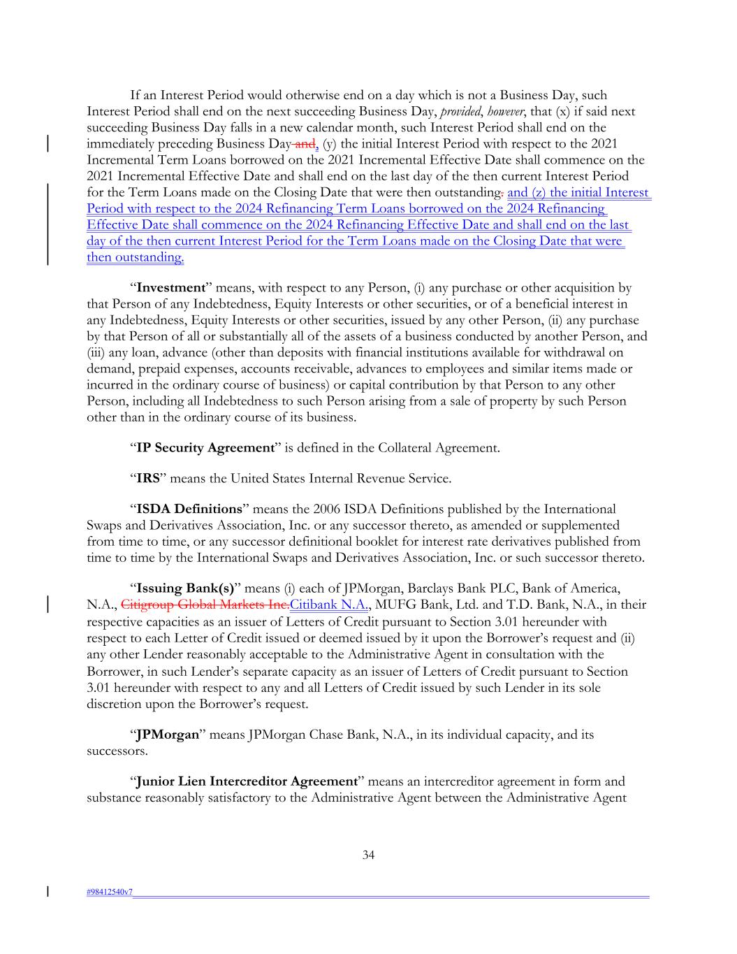 If an Interest Period would otherwise end on a day which is not a Business Day, such Interest Period shall end on the next succeeding Business Day, provided, however, that (x) if said next succeeding Business Day falls in a new calendar month, such Interest Period shall end on the immediately preceding Business Day and, (y) the initial Interest Period with respect to the 2021 Incremental Term Loans borrowed on the 2021 Incremental Effective Date shall commence on the 2021 Incremental Effective Date and shall end on the last day of the then current Interest Period for the Term Loans made on the Closing Date that were then outstanding. and (z) the initial Interest Period with respect to the 2024 Refinancing Term Loans borrowed on the 2024 Refinancing Effective Date shall commence on the 2024 Refinancing Effective Date and shall end on the last day of the then current Interest Period for the Term Loans made on the Closing Date that were then outstanding. “Investment” means, with respect to any Person, (i) any purchase or other acquisition by that Person of any Indebtedness, Equity Interests or other securities, or of a beneficial interest in any Indebtedness, Equity Interests or other securities, issued by any other Person, (ii) any purchase by that Person of all or substantially all of the assets of a business conducted by another Person, and (iii) any loan, advance (other than deposits with financial institutions available for withdrawal on demand, prepaid expenses, accounts receivable, advances to employees and similar items made or incurred in the ordinary course of business) or capital contribution by that Person to any other Person, including all Indebtedness to such Person arising from a sale of property by such Person other than in the ordinary course of its business. “IP Security Agreement” is defined in the Collateral Agreement. “IRS” means the United States Internal Revenue Service. “ISDA Definitions” means the 2006 ISDA Definitions published by the International Swaps and Derivatives Association, Inc. or any successor thereto, as amended or supplemented from time to time, or any successor definitional booklet for interest rate derivatives published from time to time by the International Swaps and Derivatives Association, Inc. or such successor thereto. “Issuing Bank(s)” means (i) each of JPMorgan, Barclays Bank PLC, Bank of America, N.A., Citigroup Global Markets Inc.Citibank N.A., MUFG Bank, Ltd. and T.D. Bank, N.A., in their respective capacities as an issuer of Letters of Credit pursuant to Section 3.01 hereunder with respect to each Letter of Credit issued or deemed issued by it upon the Borrower’s request and (ii) any other Lender reasonably acceptable to the Administrative Agent in consultation with the Borrower, in such Lender’s separate capacity as an issuer of Letters of Credit pursuant to Section 3.01 hereunder with respect to any and all Letters of Credit issued by such Lender in its sole discretion upon the Borrower’s request. “JPMorgan” means JPMorgan Chase Bank, N.A., in its individual capacity, and its successors. “Junior Lien Intercreditor Agreement” means an intercreditor agreement in form and substance reasonably satisfactory to the Administrative Agent between the Administrative Agent 34 #98412540v7