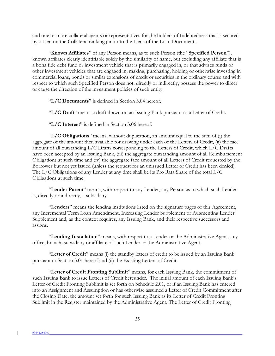 and one or more collateral agents or representatives for the holders of Indebtedness that is secured by a Lien on the Collateral ranking junior to the Liens of the Loan Documents. “Known Affiliates” of any Person means, as to such Person (the “Specified Person”), known affiliates clearly identifiable solely by the similarity of name, but excluding any affiliate that is a bona fide debt fund or investment vehicle that is primarily engaged in, or that advises funds or other investment vehicles that are engaged in, making, purchasing, holding or otherwise investing in commercial loans, bonds or similar extensions of credit or securities in the ordinary course and with respect to which such Specified Person does not, directly or indirectly, possess the power to direct or cause the direction of the investment policies of such entity. “L/C Documents” is defined in Section 3.04 hereof. “L/C Draft” means a draft drawn on an Issuing Bank pursuant to a Letter of Credit. “L/C Interest” is defined in Section 3.06 hereof. “L/C Obligations” means, without duplication, an amount equal to the sum of (i) the aggregate of the amount then available for drawing under each of the Letters of Credit, (ii) the face amount of all outstanding L/C Drafts corresponding to the Letters of Credit, which L/C Drafts have been accepted by an Issuing Bank, (iii) the aggregate outstanding amount of all Reimbursement Obligations at such time and (iv) the aggregate face amount of all Letters of Credit requested by the Borrower but not yet issued (unless the request for an unissued Letter of Credit has been denied). The L/C Obligations of any Lender at any time shall be its Pro Rata Share of the total L/C Obligations at such time. “Lender Parent” means, with respect to any Lender, any Person as to which such Lender is, directly or indirectly, a subsidiary. “Lenders” means the lending institutions listed on the signature pages of this Agreement, any Incremental Term Loan Amendment, Increasing Lender Supplement or Augmenting Lender Supplement and, as the context requires, any Issuing Bank, and their respective successors and assigns. “Lending Installation” means, with respect to a Lender or the Administrative Agent, any office, branch, subsidiary or affiliate of such Lender or the Administrative Agent. “Letter of Credit” means (i) the standby letters of credit to be issued by an Issuing Bank pursuant to Section 3.01 hereof and (ii) the Existing Letters of Credit. “Letter of Credit Fronting Sublimit” means, for each Issuing Bank, the commitment of such Issuing Bank to issue Letters of Credit hereunder. The initial amount of each Issuing Bank’s Letter of Credit Fronting Sublimit is set forth on Schedule 2.01, or if an Issuing Bank has entered into an Assignment and Assumption or has otherwise assumed a Letter of Credit Commitment after the Closing Date, the amount set forth for such Issuing Bank as its Letter of Credit Fronting Sublimit in the Register maintained by the Administrative Agent. The Letter of Credit Fronting 35 #98412540v7