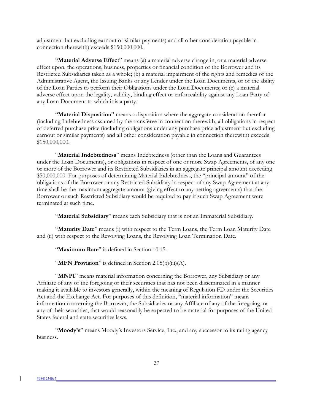 adjustment but excluding earnout or similar payments) and all other consideration payable in connection therewith) exceeds $150,000,000. “Material Adverse Effect” means (a) a material adverse change in, or a material adverse effect upon, the operations, business, properties or financial condition of the Borrower and its Restricted Subsidiaries taken as a whole; (b) a material impairment of the rights and remedies of the Administrative Agent, the Issuing Banks or any Lender under the Loan Documents, or of the ability of the Loan Parties to perform their Obligations under the Loan Documents; or (c) a material adverse effect upon the legality, validity, binding effect or enforceability against any Loan Party of any Loan Document to which it is a party. “Material Disposition” means a disposition where the aggregate consideration therefor (including Indebtedness assumed by the transferee in connection therewith, all obligations in respect of deferred purchase price (including obligations under any purchase price adjustment but excluding earnout or similar payments) and all other consideration payable in connection therewith) exceeds $150,000,000. “Material Indebtedness” means Indebtedness (other than the Loans and Guarantees under the Loan Documents), or obligations in respect of one or more Swap Agreements, of any one or more of the Borrower and its Restricted Subsidiaries in an aggregate principal amount exceeding $50,000,000. For purposes of determining Material Indebtedness, the “principal amount” of the obligations of the Borrower or any Restricted Subsidiary in respect of any Swap Agreement at any time shall be the maximum aggregate amount (giving effect to any netting agreements) that the Borrower or such Restricted Subsidiary would be required to pay if such Swap Agreement were terminated at such time. “Material Subsidiary” means each Subsidiary that is not an Immaterial Subsidiary. “Maturity Date” means (i) with respect to the Term Loans, the Term Loan Maturity Date and (ii) with respect to the Revolving Loans, the Revolving Loan Termination Date. “Maximum Rate” is defined in Section 10.15. “MFN Provision” is defined in Section 2.05(b)(iii)(A). “MNPI” means material information concerning the Borrower, any Subsidiary or any Affiliate of any of the foregoing or their securities that has not been disseminated in a manner making it available to investors generally, within the meaning of Regulation FD under the Securities Act and the Exchange Act. For purposes of this definition, “material information” means information concerning the Borrower, the Subsidiaries or any Affiliate of any of the foregoing, or any of their securities, that would reasonably be expected to be material for purposes of the United States federal and state securities laws. “Moody’s” means Moody’s Investors Service, Inc., and any successor to its rating agency business. 37 #98412540v7