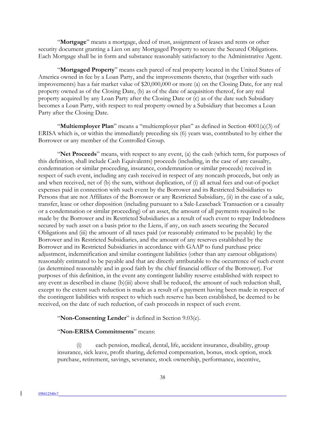 “Mortgage” means a mortgage, deed of trust, assignment of leases and rents or other security document granting a Lien on any Mortgaged Property to secure the Secured Obligations. Each Mortgage shall be in form and substance reasonably satisfactory to the Administrative Agent. “Mortgaged Property” means each parcel of real property located in the United States of America owned in fee by a Loan Party, and the improvements thereto, that (together with such improvements) has a fair market value of $20,000,000 or more (a) on the Closing Date, for any real property owned as of the Closing Date, (b) as of the date of acquisition thereof, for any real property acquired by any Loan Party after the Closing Date or (c) as of the date such Subsidiary becomes a Loan Party, with respect to real property owned by a Subsidiary that becomes a Loan Party after the Closing Date. “Multiemployer Plan” means a “multiemployer plan” as defined in Section 4001(a)(3) of ERISA which is, or within the immediately preceding six (6) years was, contributed to by either the Borrower or any member of the Controlled Group. “Net Proceeds” means, with respect to any event, (a) the cash (which term, for purposes of this definition, shall include Cash Equivalents) proceeds (including, in the case of any casualty, condemnation or similar proceeding, insurance, condemnation or similar proceeds) received in respect of such event, including any cash received in respect of any noncash proceeds, but only as and when received, net of (b) the sum, without duplication, of (i) all actual fees and out-of-pocket expenses paid in connection with such event by the Borrower and its Restricted Subsidiaries to Persons that are not Affiliates of the Borrower or any Restricted Subsidiary, (ii) in the case of a sale, transfer, lease or other disposition (including pursuant to a Sale-Leaseback Transaction or a casualty or a condemnation or similar proceeding) of an asset, the amount of all payments required to be made by the Borrower and its Restricted Subsidiaries as a result of such event to repay Indebtedness secured by such asset on a basis prior to the Liens, if any, on such assets securing the Secured Obligations and (iii) the amount of all taxes paid (or reasonably estimated to be payable) by the Borrower and its Restricted Subsidiaries, and the amount of any reserves established by the Borrower and its Restricted Subsidiaries in accordance with GAAP to fund purchase price adjustment, indemnification and similar contingent liabilities (other than any earnout obligations) reasonably estimated to be payable and that are directly attributable to the occurrence of such event (as determined reasonably and in good faith by the chief financial officer of the Borrower). For purposes of this definition, in the event any contingent liability reserve established with respect to any event as described in clause (b)(iii) above shall be reduced, the amount of such reduction shall, except to the extent such reduction is made as a result of a payment having been made in respect of the contingent liabilities with respect to which such reserve has been established, be deemed to be received, on the date of such reduction, of cash proceeds in respect of such event. “Non-Consenting Lender” is defined in Section 9.03(e). “Non-ERISA Commitments” means: (i) each pension, medical, dental, life, accident insurance, disability, group insurance, sick leave, profit sharing, deferred compensation, bonus, stock option, stock purchase, retirement, savings, severance, stock ownership, performance, incentive, 38 #98412540v7