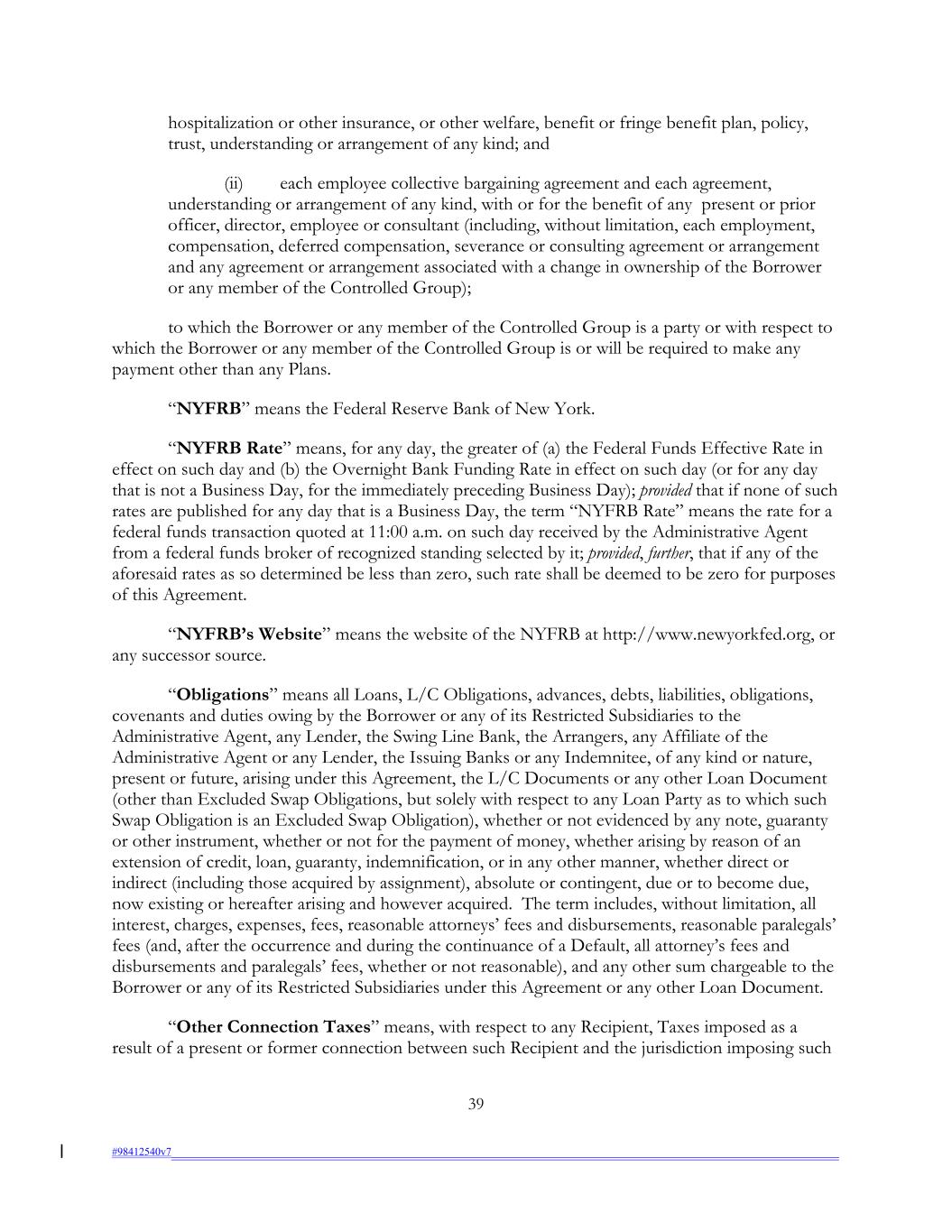 hospitalization or other insurance, or other welfare, benefit or fringe benefit plan, policy, trust, understanding or arrangement of any kind; and (ii) each employee collective bargaining agreement and each agreement, understanding or arrangement of any kind, with or for the benefit of any present or prior officer, director, employee or consultant (including, without limitation, each employment, compensation, deferred compensation, severance or consulting agreement or arrangement and any agreement or arrangement associated with a change in ownership of the Borrower or any member of the Controlled Group); to which the Borrower or any member of the Controlled Group is a party or with respect to which the Borrower or any member of the Controlled Group is or will be required to make any payment other than any Plans. “NYFRB” means the Federal Reserve Bank of New York. “NYFRB Rate” means, for any day, the greater of (a) the Federal Funds Effective Rate in effect on such day and (b) the Overnight Bank Funding Rate in effect on such day (or for any day that is not a Business Day, for the immediately preceding Business Day); provided that if none of such rates are published for any day that is a Business Day, the term “NYFRB Rate” means the rate for a federal funds transaction quoted at 11:00 a.m. on such day received by the Administrative Agent from a federal funds broker of recognized standing selected by it; provided, further, that if any of the aforesaid rates as so determined be less than zero, such rate shall be deemed to be zero for purposes of this Agreement. “NYFRB’s Website” means the website of the NYFRB at http://www.newyorkfed.org, or any successor source. “Obligations” means all Loans, L/C Obligations, advances, debts, liabilities, obligations, covenants and duties owing by the Borrower or any of its Restricted Subsidiaries to the Administrative Agent, any Lender, the Swing Line Bank, the Arrangers, any Affiliate of the Administrative Agent or any Lender, the Issuing Banks or any Indemnitee, of any kind or nature, present or future, arising under this Agreement, the L/C Documents or any other Loan Document (other than Excluded Swap Obligations, but solely with respect to any Loan Party as to which such Swap Obligation is an Excluded Swap Obligation), whether or not evidenced by any note, guaranty or other instrument, whether or not for the payment of money, whether arising by reason of an extension of credit, loan, guaranty, indemnification, or in any other manner, whether direct or indirect (including those acquired by assignment), absolute or contingent, due or to become due, now existing or hereafter arising and however acquired. The term includes, without limitation, all interest, charges, expenses, fees, reasonable attorneys’ fees and disbursements, reasonable paralegals’ fees (and, after the occurrence and during the continuance of a Default, all attorney’s fees and disbursements and paralegals’ fees, whether or not reasonable), and any other sum chargeable to the Borrower or any of its Restricted Subsidiaries under this Agreement or any other Loan Document. “Other Connection Taxes” means, with respect to any Recipient, Taxes imposed as a result of a present or former connection between such Recipient and the jurisdiction imposing such 39 #98412540v7