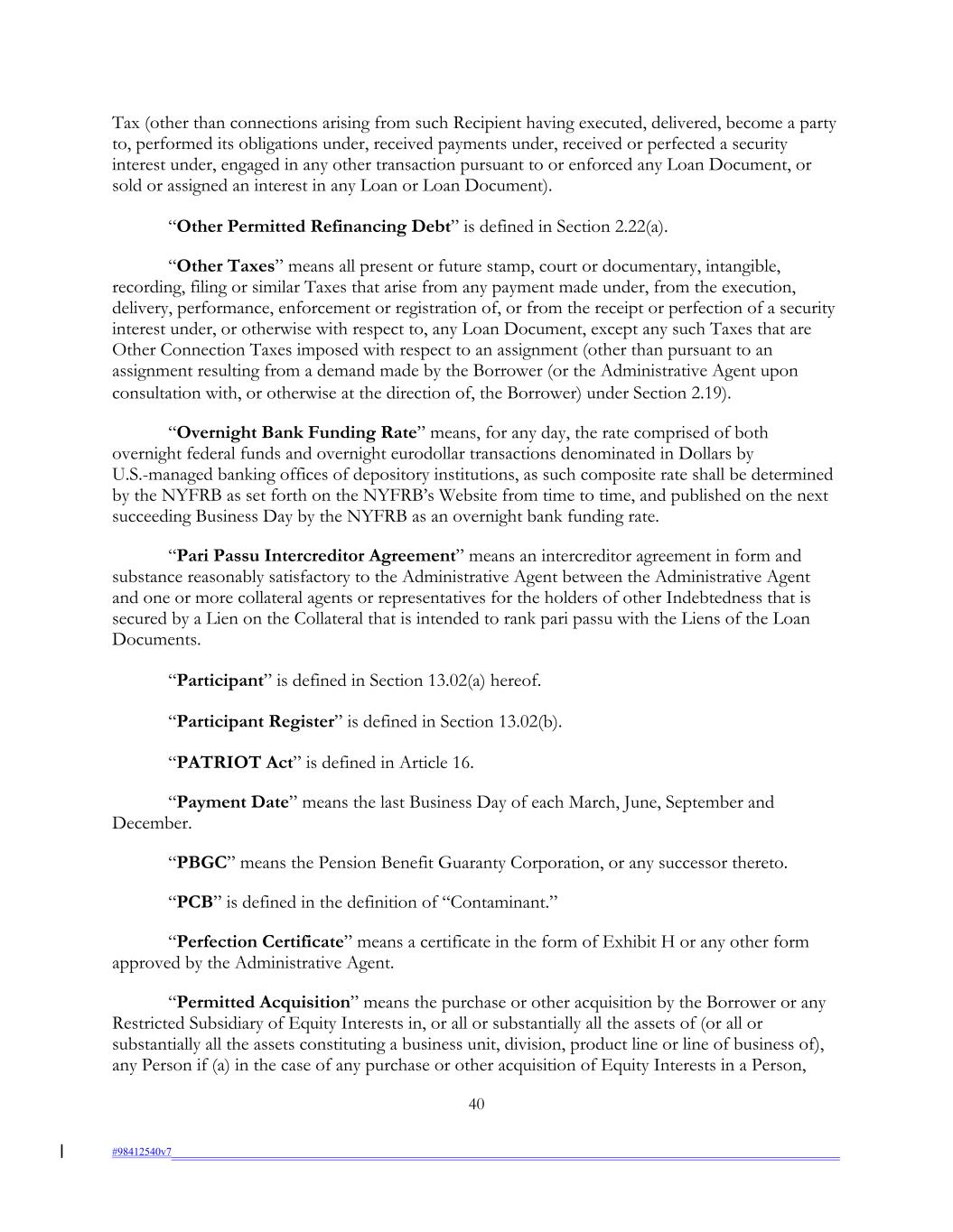 Tax (other than connections arising from such Recipient having executed, delivered, become a party to, performed its obligations under, received payments under, received or perfected a security interest under, engaged in any other transaction pursuant to or enforced any Loan Document, or sold or assigned an interest in any Loan or Loan Document). “Other Permitted Refinancing Debt” is defined in Section 2.22(a). “Other Taxes” means all present or future stamp, court or documentary, intangible, recording, filing or similar Taxes that arise from any payment made under, from the execution, delivery, performance, enforcement or registration of, or from the receipt or perfection of a security interest under, or otherwise with respect to, any Loan Document, except any such Taxes that are Other Connection Taxes imposed with respect to an assignment (other than pursuant to an assignment resulting from a demand made by the Borrower (or the Administrative Agent upon consultation with, or otherwise at the direction of, the Borrower) under Section 2.19). “Overnight Bank Funding Rate” means, for any day, the rate comprised of both overnight federal funds and overnight eurodollar transactions denominated in Dollars by U.S.-managed banking offices of depository institutions, as such composite rate shall be determined by the NYFRB as set forth on the NYFRB’s Website from time to time, and published on the next succeeding Business Day by the NYFRB as an overnight bank funding rate. “Pari Passu Intercreditor Agreement” means an intercreditor agreement in form and substance reasonably satisfactory to the Administrative Agent between the Administrative Agent and one or more collateral agents or representatives for the holders of other Indebtedness that is secured by a Lien on the Collateral that is intended to rank pari passu with the Liens of the Loan Documents. “Participant” is defined in Section 13.02(a) hereof. “Participant Register” is defined in Section 13.02(b). “PATRIOT Act” is defined in Article 16. “Payment Date” means the last Business Day of each March, June, September and December. “PBGC” means the Pension Benefit Guaranty Corporation, or any successor thereto. “PCB” is defined in the definition of “Contaminant.” “Perfection Certificate” means a certificate in the form of Exhibit H or any other form approved by the Administrative Agent. “Permitted Acquisition” means the purchase or other acquisition by the Borrower or any Restricted Subsidiary of Equity Interests in, or all or substantially all the assets of (or all or substantially all the assets constituting a business unit, division, product line or line of business of), any Person if (a) in the case of any purchase or other acquisition of Equity Interests in a Person, 40 #98412540v7