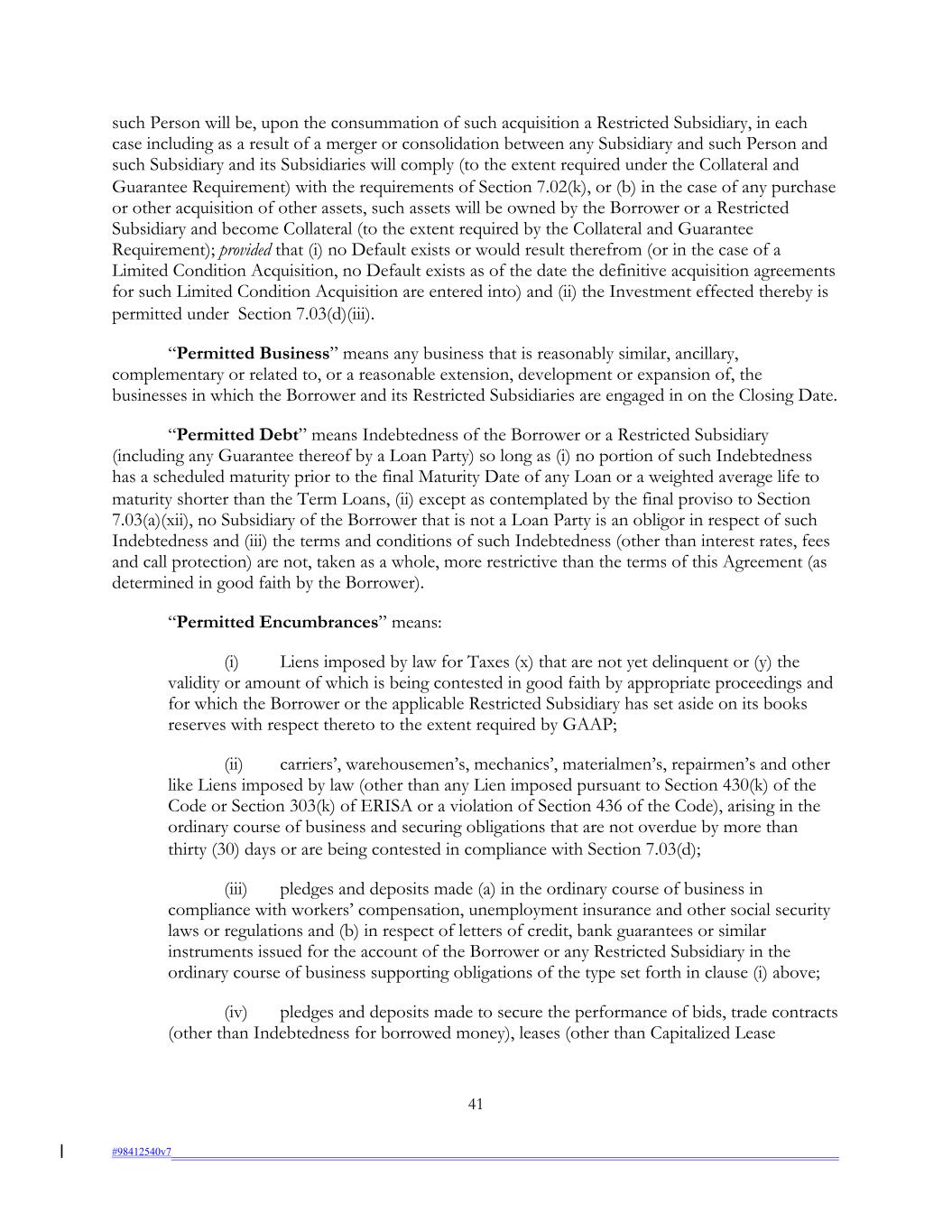 such Person will be, upon the consummation of such acquisition a Restricted Subsidiary, in each case including as a result of a merger or consolidation between any Subsidiary and such Person and such Subsidiary and its Subsidiaries will comply (to the extent required under the Collateral and Guarantee Requirement) with the requirements of Section 7.02(k), or (b) in the case of any purchase or other acquisition of other assets, such assets will be owned by the Borrower or a Restricted Subsidiary and become Collateral (to the extent required by the Collateral and Guarantee Requirement); provided that (i) no Default exists or would result therefrom (or in the case of a Limited Condition Acquisition, no Default exists as of the date the definitive acquisition agreements for such Limited Condition Acquisition are entered into) and (ii) the Investment effected thereby is permitted under Section 7.03(d)(iii). “Permitted Business” means any business that is reasonably similar, ancillary, complementary or related to, or a reasonable extension, development or expansion of, the businesses in which the Borrower and its Restricted Subsidiaries are engaged in on the Closing Date. “Permitted Debt” means Indebtedness of the Borrower or a Restricted Subsidiary (including any Guarantee thereof by a Loan Party) so long as (i) no portion of such Indebtedness has a scheduled maturity prior to the final Maturity Date of any Loan or a weighted average life to maturity shorter than the Term Loans, (ii) except as contemplated by the final proviso to Section 7.03(a)(xii), no Subsidiary of the Borrower that is not a Loan Party is an obligor in respect of such Indebtedness and (iii) the terms and conditions of such Indebtedness (other than interest rates, fees and call protection) are not, taken as a whole, more restrictive than the terms of this Agreement (as determined in good faith by the Borrower). “Permitted Encumbrances” means: (i) Liens imposed by law for Taxes (x) that are not yet delinquent or (y) the validity or amount of which is being contested in good faith by appropriate proceedings and for which the Borrower or the applicable Restricted Subsidiary has set aside on its books reserves with respect thereto to the extent required by GAAP; (ii) carriers’, warehousemen’s, mechanics’, materialmen’s, repairmen’s and other like Liens imposed by law (other than any Lien imposed pursuant to Section 430(k) of the Code or Section 303(k) of ERISA or a violation of Section 436 of the Code), arising in the ordinary course of business and securing obligations that are not overdue by more than thirty (30) days or are being contested in compliance with Section 7.03(d); (iii) pledges and deposits made (a) in the ordinary course of business in compliance with workers’ compensation, unemployment insurance and other social security laws or regulations and (b) in respect of letters of credit, bank guarantees or similar instruments issued for the account of the Borrower or any Restricted Subsidiary in the ordinary course of business supporting obligations of the type set forth in clause (i) above; (iv) pledges and deposits made to secure the performance of bids, trade contracts (other than Indebtedness for borrowed money), leases (other than Capitalized Lease 41 #98412540v7