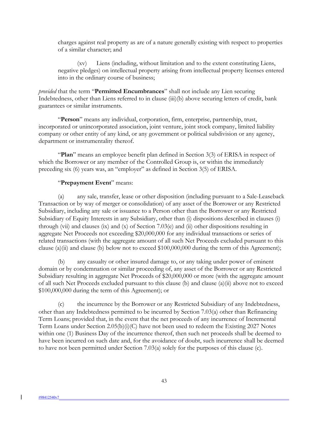 charges against real property as are of a nature generally existing with respect to properties of a similar character; and (xv) Liens (including, without limitation and to the extent constituting Liens, negative pledges) on intellectual property arising from intellectual property licenses entered into in the ordinary course of business; provided that the term “Permitted Encumbrances” shall not include any Lien securing Indebtedness, other than Liens referred to in clause (iii)(b) above securing letters of credit, bank guarantees or similar instruments. “Person” means any individual, corporation, firm, enterprise, partnership, trust, incorporated or unincorporated association, joint venture, joint stock company, limited liability company or other entity of any kind, or any government or political subdivision or any agency, department or instrumentality thereof. “Plan” means an employee benefit plan defined in Section 3(3) of ERISA in respect of which the Borrower or any member of the Controlled Group is, or within the immediately preceding six (6) years was, an “employer” as defined in Section 3(5) of ERISA. “Prepayment Event” means: (a) any sale, transfer, lease or other disposition (including pursuant to a Sale-Leaseback Transaction or by way of merger or consolidation) of any asset of the Borrower or any Restricted Subsidiary, including any sale or issuance to a Person other than the Borrower or any Restricted Subsidiary of Equity Interests in any Subsidiary, other than (i) dispositions described in clauses (i) through (vii) and clauses (ix) and (x) of Section 7.03(e) and (ii) other dispositions resulting in aggregate Net Proceeds not exceeding $20,000,000 for any individual transactions or series of related transactions (with the aggregate amount of all such Net Proceeds excluded pursuant to this clause (a)(ii) and clause (b) below not to exceed $100,000,000 during the term of this Agreement); (b) any casualty or other insured damage to, or any taking under power of eminent domain or by condemnation or similar proceeding of, any asset of the Borrower or any Restricted Subsidiary resulting in aggregate Net Proceeds of $20,000,000 or more (with the aggregate amount of all such Net Proceeds excluded pursuant to this clause (b) and clause (a)(ii) above not to exceed $100,000,000 during the term of this Agreement); or (c) the incurrence by the Borrower or any Restricted Subsidiary of any Indebtedness, other than any Indebtedness permitted to be incurred by Section 7.03(a) other than Refinancing Term Loans; provided that, in the event that the net proceeds of any incurrence of Incremental Term Loans under Section 2.05(b)(i)(C) have not been used to redeem the Existing 2027 Notes within one (1) Business Day of the incurrence thereof, then such net proceeds shall be deemed to have been incurred on such date and, for the avoidance of doubt, such incurrence shall be deemed to have not been permitted under Section 7.03(a) solely for the purposes of this clause (c). 43 #98412540v7