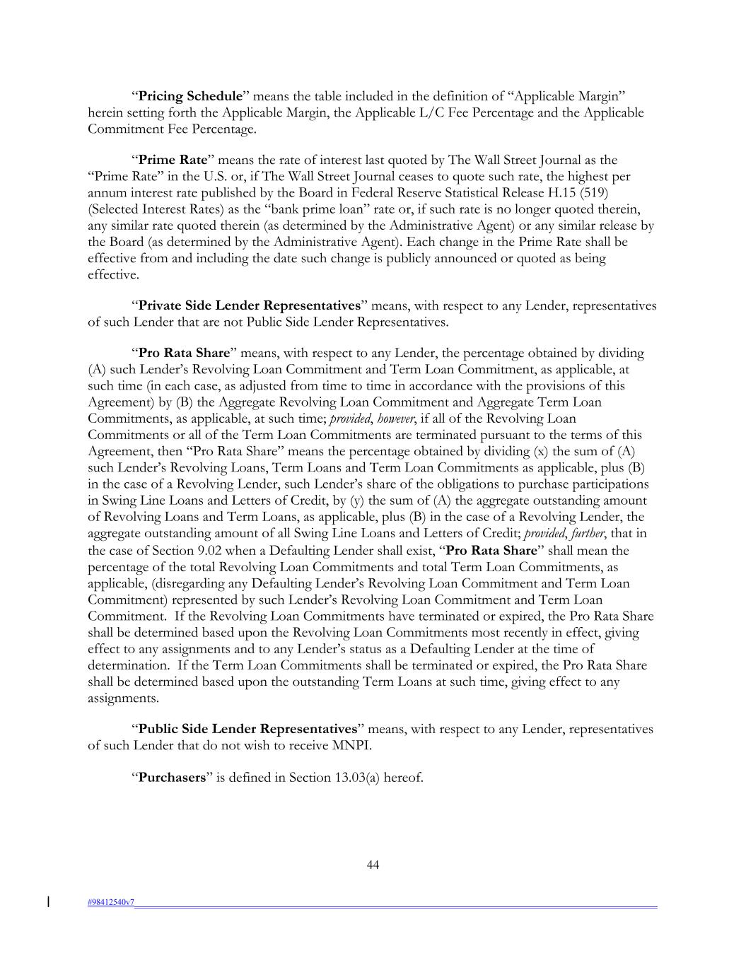 “Pricing Schedule” means the table included in the definition of “Applicable Margin” herein setting forth the Applicable Margin, the Applicable L/C Fee Percentage and the Applicable Commitment Fee Percentage. “Prime Rate” means the rate of interest last quoted by The Wall Street Journal as the “Prime Rate” in the U.S. or, if The Wall Street Journal ceases to quote such rate, the highest per annum interest rate published by the Board in Federal Reserve Statistical Release H.15 (519) (Selected Interest Rates) as the “bank prime loan” rate or, if such rate is no longer quoted therein, any similar rate quoted therein (as determined by the Administrative Agent) or any similar release by the Board (as determined by the Administrative Agent). Each change in the Prime Rate shall be effective from and including the date such change is publicly announced or quoted as being effective. “Private Side Lender Representatives” means, with respect to any Lender, representatives of such Lender that are not Public Side Lender Representatives. “Pro Rata Share” means, with respect to any Lender, the percentage obtained by dividing (A) such Lender’s Revolving Loan Commitment and Term Loan Commitment, as applicable, at such time (in each case, as adjusted from time to time in accordance with the provisions of this Agreement) by (B) the Aggregate Revolving Loan Commitment and Aggregate Term Loan Commitments, as applicable, at such time; provided, however, if all of the Revolving Loan Commitments or all of the Term Loan Commitments are terminated pursuant to the terms of this Agreement, then “Pro Rata Share” means the percentage obtained by dividing (x) the sum of (A) such Lender’s Revolving Loans, Term Loans and Term Loan Commitments as applicable, plus (B) in the case of a Revolving Lender, such Lender’s share of the obligations to purchase participations in Swing Line Loans and Letters of Credit, by (y) the sum of (A) the aggregate outstanding amount of Revolving Loans and Term Loans, as applicable, plus (B) in the case of a Revolving Lender, the aggregate outstanding amount of all Swing Line Loans and Letters of Credit; provided, further, that in the case of Section 9.02 when a Defaulting Lender shall exist, “Pro Rata Share” shall mean the percentage of the total Revolving Loan Commitments and total Term Loan Commitments, as applicable, (disregarding any Defaulting Lender’s Revolving Loan Commitment and Term Loan Commitment) represented by such Lender’s Revolving Loan Commitment and Term Loan Commitment. If the Revolving Loan Commitments have terminated or expired, the Pro Rata Share shall be determined based upon the Revolving Loan Commitments most recently in effect, giving effect to any assignments and to any Lender’s status as a Defaulting Lender at the time of determination. If the Term Loan Commitments shall be terminated or expired, the Pro Rata Share shall be determined based upon the outstanding Term Loans at such time, giving effect to any assignments. “Public Side Lender Representatives” means, with respect to any Lender, representatives of such Lender that do not wish to receive MNPI. “Purchasers” is defined in Section 13.03(a) hereof. 44 #98412540v7