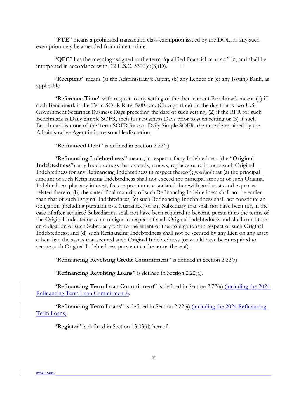 “PTE” means a prohibited transaction class exemption issued by the DOL, as any such exemption may be amended from time to time. “QFC” has the meaning assigned to the term “qualified financial contract” in, and shall be interpreted in accordance with, 12 U.S.C. 5390(c)(8)(D). “Recipient” means (a) the Administrative Agent, (b) any Lender or (c) any Issuing Bank, as applicable. “Reference Time” with respect to any setting of the then-current Benchmark means (1) if such Benchmark is the Term SOFR Rate, 5:00 a.m. (Chicago time) on the day that is two U.S. Government Securities Business Days preceding the date of such setting, (2) if the RFR for such Benchmark is Daily Simple SOFR, then four Business Days prior to such setting or (3) if such Benchmark is none of the Term SOFR Rate or Daily Simple SOFR, the time determined by the Administrative Agent in its reasonable discretion. “Refinanced Debt” is defined in Section 2.22(a). “Refinancing Indebtedness” means, in respect of any Indebtedness (the “Original Indebtedness”), any Indebtedness that extends, renews, replaces or refinances such Original Indebtedness (or any Refinancing Indebtedness in respect thereof); provided that (a) the principal amount of such Refinancing Indebtedness shall not exceed the principal amount of such Original Indebtedness plus any interest, fees or premiums associated therewith, and costs and expenses related thereto; (b) the stated final maturity of such Refinancing Indebtedness shall not be earlier than that of such Original Indebtedness; (c) such Refinancing Indebtedness shall not constitute an obligation (including pursuant to a Guarantee) of any Subsidiary that shall not have been (or, in the case of after-acquired Subsidiaries, shall not have been required to become pursuant to the terms of the Original Indebtedness) an obligor in respect of such Original Indebtedness and shall constitute an obligation of such Subsidiary only to the extent of their obligations in respect of such Original Indebtedness; and (d) such Refinancing Indebtedness shall not be secured by any Lien on any asset other than the assets that secured such Original Indebtedness (or would have been required to secure such Original Indebtedness pursuant to the terms thereof). “Refinancing Revolving Credit Commitment” is defined in Section 2.22(a). “Refinancing Revolving Loans” is defined in Section 2.22(a). “Refinancing Term Loan Commitment” is defined in Section 2.22(a) (including the 2024 Refinancing Term Loan Commitments). “Refinancing Term Loans” is defined in Section 2.22(a) (including the 2024 Refinancing Term Loans). “Register” is defined in Section 13.03(d) hereof. 45 #98412540v7