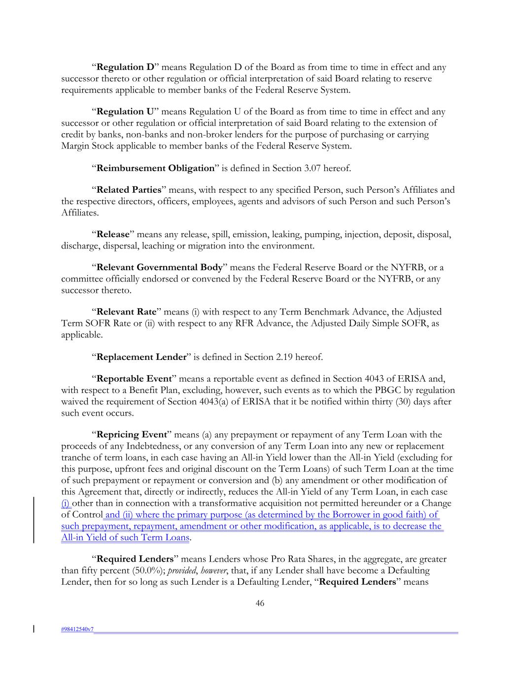 “Regulation D” means Regulation D of the Board as from time to time in effect and any successor thereto or other regulation or official interpretation of said Board relating to reserve requirements applicable to member banks of the Federal Reserve System. “Regulation U” means Regulation U of the Board as from time to time in effect and any successor or other regulation or official interpretation of said Board relating to the extension of credit by banks, non-banks and non-broker lenders for the purpose of purchasing or carrying Margin Stock applicable to member banks of the Federal Reserve System. “Reimbursement Obligation” is defined in Section 3.07 hereof. “Related Parties” means, with respect to any specified Person, such Person’s Affiliates and the respective directors, officers, employees, agents and advisors of such Person and such Person’s Affiliates. “Release” means any release, spill, emission, leaking, pumping, injection, deposit, disposal, discharge, dispersal, leaching or migration into the environment. “Relevant Governmental Body” means the Federal Reserve Board or the NYFRB, or a committee officially endorsed or convened by the Federal Reserve Board or the NYFRB, or any successor thereto. “Relevant Rate” means (i) with respect to any Term Benchmark Advance, the Adjusted Term SOFR Rate or (ii) with respect to any RFR Advance, the Adjusted Daily Simple SOFR, as applicable. “Replacement Lender” is defined in Section 2.19 hereof. “Reportable Event” means a reportable event as defined in Section 4043 of ERISA and, with respect to a Benefit Plan, excluding, however, such events as to which the PBGC by regulation waived the requirement of Section 4043(a) of ERISA that it be notified within thirty (30) days after such event occurs. “Repricing Event” means (a) any prepayment or repayment of any Term Loan with the proceeds of any Indebtedness, or any conversion of any Term Loan into any new or replacement tranche of term loans, in each case having an All-in Yield lower than the All-in Yield (excluding for this purpose, upfront fees and original discount on the Term Loans) of such Term Loan at the time of such prepayment or repayment or conversion and (b) any amendment or other modification of this Agreement that, directly or indirectly, reduces the All-in Yield of any Term Loan, in each case (i) other than in connection with a transformative acquisition not permitted hereunder or a Change of Control and (ii) where the primary purpose (as determined by the Borrower in good faith) of such prepayment, repayment, amendment or other modification, as applicable, is to decrease the All-in Yield of such Term Loans. “Required Lenders” means Lenders whose Pro Rata Shares, in the aggregate, are greater than fifty percent (50.0%); provided, however, that, if any Lender shall have become a Defaulting Lender, then for so long as such Lender is a Defaulting Lender, “Required Lenders” means 46 #98412540v7
