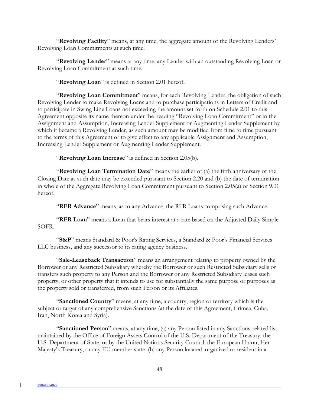 “Revolving Facility” means, at any time, the aggregate amount of the Revolving Lenders’ Revolving Loan Commitments at such time. “Revolving Lender” means at any time, any Lender with an outstanding Revolving Loan or Revolving Loan Commitment at such time. “Revolving Loan” is defined in Section 2.01 hereof. “Revolving Loan Commitment” means, for each Revolving Lender, the obligation of such Revolving Lender to make Revolving Loans and to purchase participations in Letters of Credit and to participate in Swing Line Loans not exceeding the amount set forth on Schedule 2.01 to this Agreement opposite its name thereon under the heading “Revolving Loan Commitment” or in the Assignment and Assumption, Increasing Lender Supplement or Augmenting Lender Supplement by which it became a Revolving Lender, as such amount may be modified from time to time pursuant to the terms of this Agreement or to give effect to any applicable Assignment and Assumption, Increasing Lender Supplement or Augmenting Lender Supplement. “Revolving Loan Increase” is defined in Section 2.05(b). “Revolving Loan Termination Date” means the earlier of (a) the fifth anniversary of the Closing Date as such date may be extended pursuant to Section 2.20 and (b) the date of termination in whole of the Aggregate Revolving Loan Commitment pursuant to Section 2.05(a) or Section 9.01 hereof. “RFR Advance” means, as to any Advance, the RFR Loans comprising such Advance. “RFR Loan” means a Loan that bears interest at a rate based on the Adjusted Daily Simple SOFR. “S&P” means Standard & Poor’s Rating Services, a Standard & Poor’s Financial Services LLC business, and any successor to its rating agency business. “Sale-Leaseback Transaction” means an arrangement relating to property owned by the Borrower or any Restricted Subsidiary whereby the Borrower or such Restricted Subsidiary sells or transfers such property to any Person and the Borrower or any Restricted Subsidiary leases such property, or other property that it intends to use for substantially the same purpose or purposes as the property sold or transferred, from such Person or its Affiliates. “Sanctioned Country” means, at any time, a country, region or territory which is the subject or target of any comprehensive Sanctions (at the date of this Agreement, Crimea, Cuba, Iran, North Korea and Syria). “Sanctioned Person” means, at any time, (a) any Person listed in any Sanctions-related list maintained by the Office of Foreign Assets Control of the U.S. Department of the Treasury, the U.S. Department of State, or by the United Nations Security Council, the European Union, Her Majesty’s Treasury, or any EU member state, (b) any Person located, organized or resident in a 48 #98412540v7