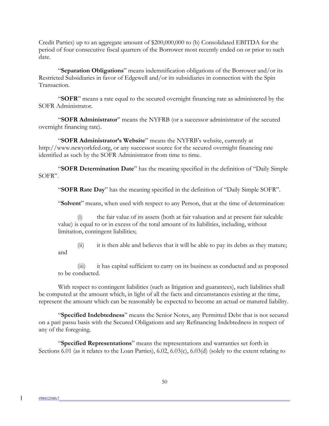Credit Parties) up to an aggregate amount of $200,000,000 to (b) Consolidated EBITDA for the period of four consecutive fiscal quarters of the Borrower most recently ended on or prior to such date. “Separation Obligations” means indemnification obligations of the Borrower and/or its Restricted Subsidiaries in favor of Edgewell and/or its subsidiaries in connection with the Spin Transaction. “SOFR” means a rate equal to the secured overnight financing rate as administered by the SOFR Administrator. “SOFR Administrator” means the NYFRB (or a successor administrator of the secured overnight financing rate). “SOFR Administrator’s Website” means the NYFRB’s website, currently at http://www.newyorkfed.org, or any successor source for the secured overnight financing rate identified as such by the SOFR Administrator from time to time. “SOFR Determination Date” has the meaning specified in the definition of “Daily Simple SOFR”. “SOFR Rate Day” has the meaning specified in the definition of “Daily Simple SOFR”. “Solvent” means, when used with respect to any Person, that at the time of determination: (i) the fair value of its assets (both at fair valuation and at present fair saleable value) is equal to or in excess of the total amount of its liabilities, including, without limitation, contingent liabilities; (ii) it is then able and believes that it will be able to pay its debts as they mature; and (iii) it has capital sufficient to carry on its business as conducted and as proposed to be conducted. With respect to contingent liabilities (such as litigation and guarantees), such liabilities shall be computed at the amount which, in light of all the facts and circumstances existing at the time, represent the amount which can be reasonably be expected to become an actual or matured liability. “Specified Indebtedness” means the Senior Notes, any Permitted Debt that is not secured on a pari passu basis with the Secured Obligations and any Refinancing Indebtedness in respect of any of the foregoing. “Specified Representations” means the representations and warranties set forth in Sections 6.01 (as it relates to the Loan Parties), 6.02, 6.03(c), 6.03(d) (solely to the extent relating to 50 #98412540v7