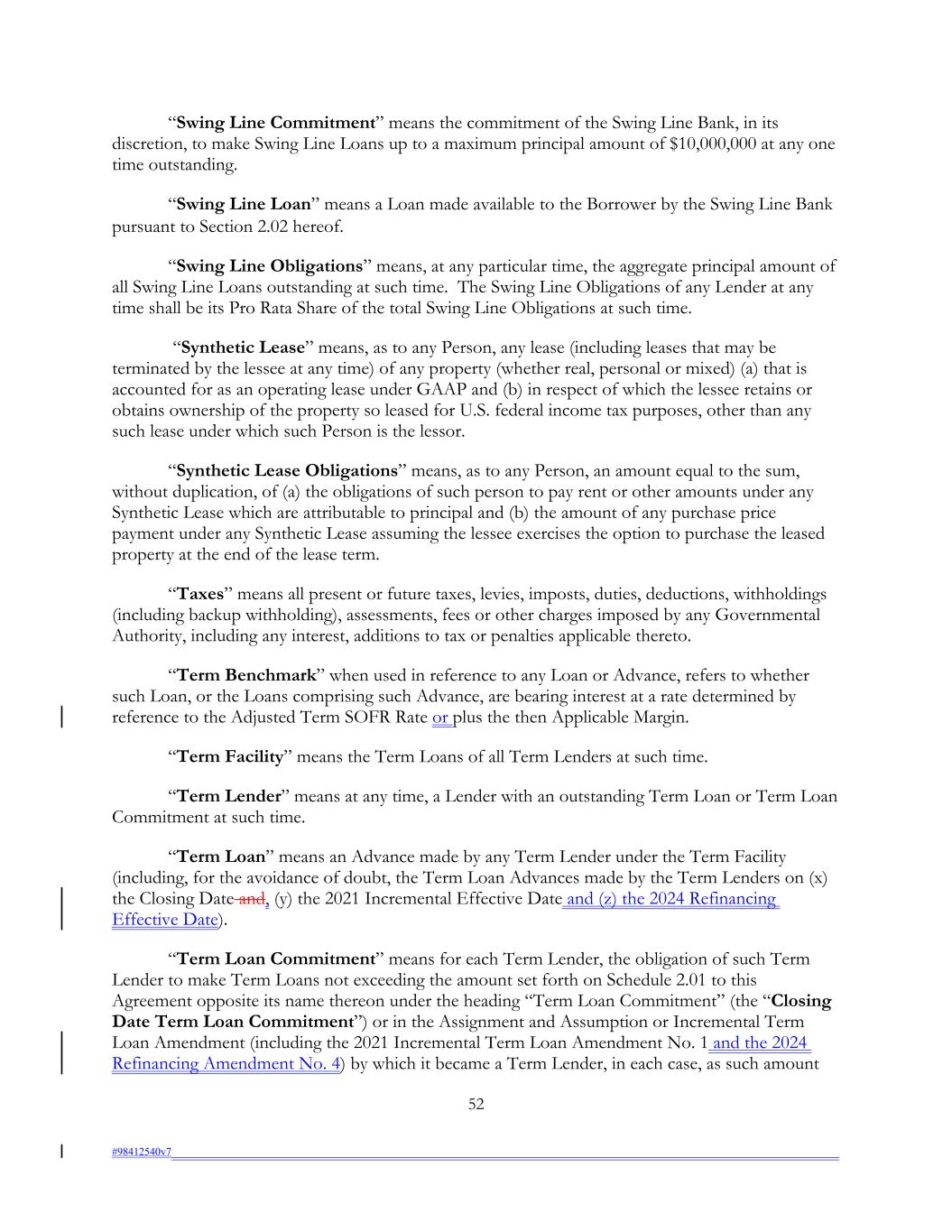 “Swing Line Commitment” means the commitment of the Swing Line Bank, in its discretion, to make Swing Line Loans up to a maximum principal amount of $10,000,000 at any one time outstanding. “Swing Line Loan” means a Loan made available to the Borrower by the Swing Line Bank pursuant to Section 2.02 hereof. “Swing Line Obligations” means, at any particular time, the aggregate principal amount of all Swing Line Loans outstanding at such time. The Swing Line Obligations of any Lender at any time shall be its Pro Rata Share of the total Swing Line Obligations at such time. “Synthetic Lease” means, as to any Person, any lease (including leases that may be terminated by the lessee at any time) of any property (whether real, personal or mixed) (a) that is accounted for as an operating lease under GAAP and (b) in respect of which the lessee retains or obtains ownership of the property so leased for U.S. federal income tax purposes, other than any such lease under which such Person is the lessor. “Synthetic Lease Obligations” means, as to any Person, an amount equal to the sum, without duplication, of (a) the obligations of such person to pay rent or other amounts under any Synthetic Lease which are attributable to principal and (b) the amount of any purchase price payment under any Synthetic Lease assuming the lessee exercises the option to purchase the leased property at the end of the lease term. “Taxes” means all present or future taxes, levies, imposts, duties, deductions, withholdings (including backup withholding), assessments, fees or other charges imposed by any Governmental Authority, including any interest, additions to tax or penalties applicable thereto. “Term Benchmark” when used in reference to any Loan or Advance, refers to whether such Loan, or the Loans comprising such Advance, are bearing interest at a rate determined by reference to the Adjusted Term SOFR Rate or plus the then Applicable Margin. “Term Facility” means the Term Loans of all Term Lenders at such time. “Term Lender” means at any time, a Lender with an outstanding Term Loan or Term Loan Commitment at such time. “Term Loan” means an Advance made by any Term Lender under the Term Facility (including, for the avoidance of doubt, the Term Loan Advances made by the Term Lenders on (x) the Closing Date and, (y) the 2021 Incremental Effective Date and (z) the 2024 Refinancing Effective Date). “Term Loan Commitment” means for each Term Lender, the obligation of such Term Lender to make Term Loans not exceeding the amount set forth on Schedule 2.01 to this Agreement opposite its name thereon under the heading “Term Loan Commitment” (the “Closing Date Term Loan Commitment”) or in the Assignment and Assumption or Incremental Term Loan Amendment (including the 2021 Incremental Term Loan Amendment No. 1 and the 2024 Refinancing Amendment No. 4) by which it became a Term Lender, in each case, as such amount 52 #98412540v7
