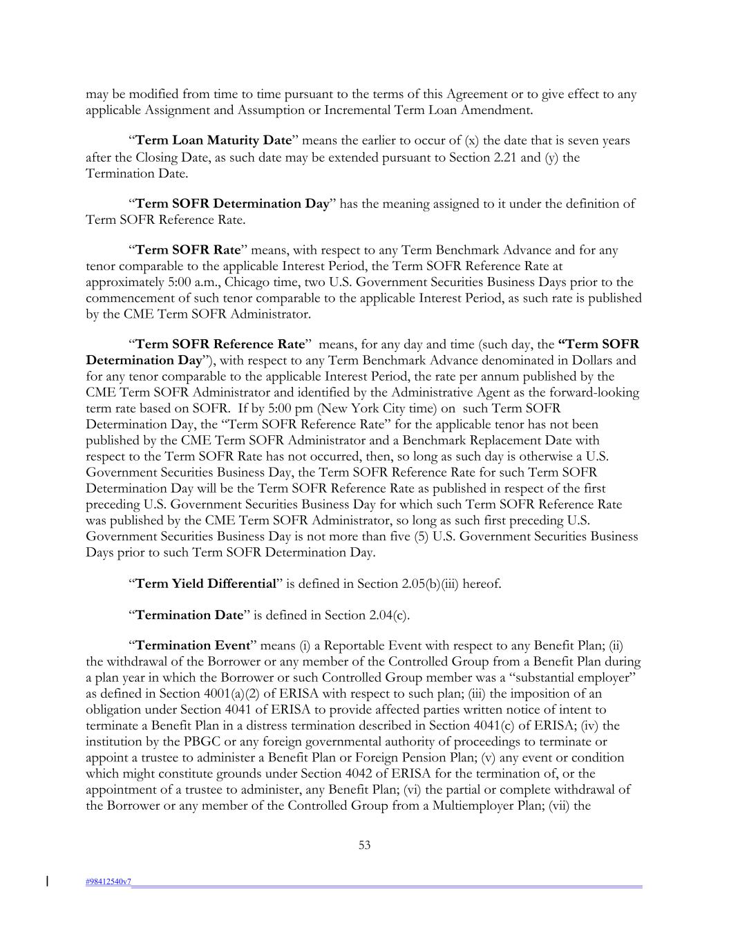 may be modified from time to time pursuant to the terms of this Agreement or to give effect to any applicable Assignment and Assumption or Incremental Term Loan Amendment. “Term Loan Maturity Date” means the earlier to occur of (x) the date that is seven years after the Closing Date, as such date may be extended pursuant to Section 2.21 and (y) the Termination Date. “Term SOFR Determination Day” has the meaning assigned to it under the definition of Term SOFR Reference Rate. “Term SOFR Rate” means, with respect to any Term Benchmark Advance and for any tenor comparable to the applicable Interest Period, the Term SOFR Reference Rate at approximately 5:00 a.m., Chicago time, two U.S. Government Securities Business Days prior to the commencement of such tenor comparable to the applicable Interest Period, as such rate is published by the CME Term SOFR Administrator. “Term SOFR Reference Rate” means, for any day and time (such day, the “Term SOFR Determination Day”), with respect to any Term Benchmark Advance denominated in Dollars and for any tenor comparable to the applicable Interest Period, the rate per annum published by the CME Term SOFR Administrator and identified by the Administrative Agent as the forward-looking term rate based on SOFR. If by 5:00 pm (New York City time) on such Term SOFR Determination Day, the “Term SOFR Reference Rate” for the applicable tenor has not been published by the CME Term SOFR Administrator and a Benchmark Replacement Date with respect to the Term SOFR Rate has not occurred, then, so long as such day is otherwise a U.S. Government Securities Business Day, the Term SOFR Reference Rate for such Term SOFR Determination Day will be the Term SOFR Reference Rate as published in respect of the first preceding U.S. Government Securities Business Day for which such Term SOFR Reference Rate was published by the CME Term SOFR Administrator, so long as such first preceding U.S. Government Securities Business Day is not more than five (5) U.S. Government Securities Business Days prior to such Term SOFR Determination Day. “Term Yield Differential” is defined in Section 2.05(b)(iii) hereof. “Termination Date” is defined in Section 2.04(c). “Termination Event” means (i) a Reportable Event with respect to any Benefit Plan; (ii) the withdrawal of the Borrower or any member of the Controlled Group from a Benefit Plan during a plan year in which the Borrower or such Controlled Group member was a “substantial employer” as defined in Section 4001(a)(2) of ERISA with respect to such plan; (iii) the imposition of an obligation under Section 4041 of ERISA to provide affected parties written notice of intent to terminate a Benefit Plan in a distress termination described in Section 4041(c) of ERISA; (iv) the institution by the PBGC or any foreign governmental authority of proceedings to terminate or appoint a trustee to administer a Benefit Plan or Foreign Pension Plan; (v) any event or condition which might constitute grounds under Section 4042 of ERISA for the termination of, or the appointment of a trustee to administer, any Benefit Plan; (vi) the partial or complete withdrawal of the Borrower or any member of the Controlled Group from a Multiemployer Plan; (vii) the 53 #98412540v7