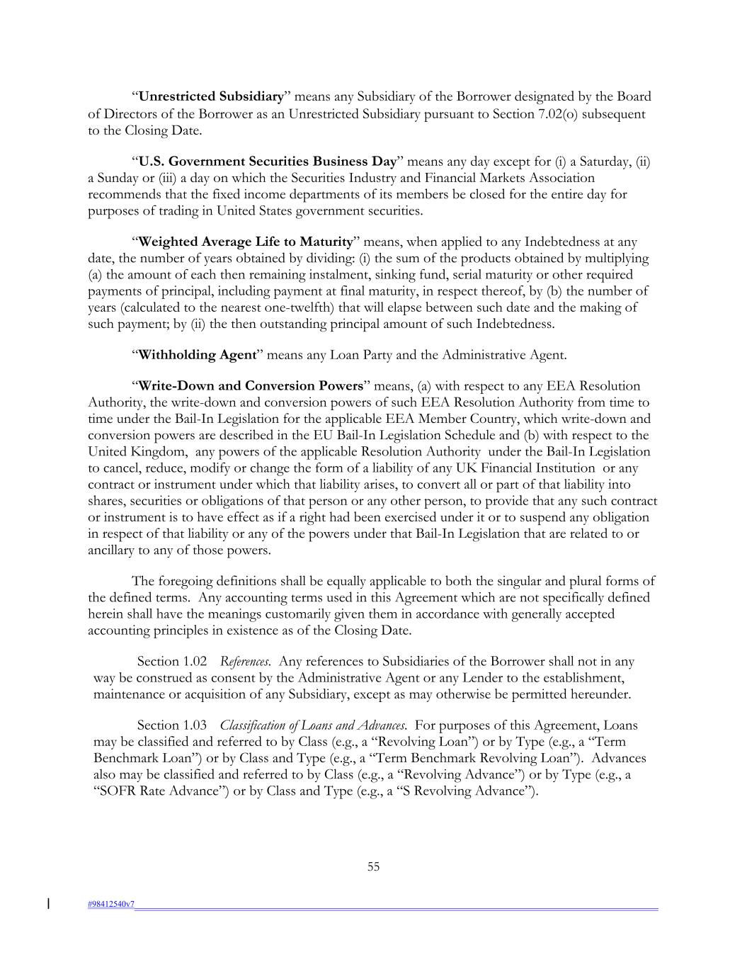 “Unrestricted Subsidiary” means any Subsidiary of the Borrower designated by the Board of Directors of the Borrower as an Unrestricted Subsidiary pursuant to Section 7.02(o) subsequent to the Closing Date. “U.S. Government Securities Business Day” means any day except for (i) a Saturday, (ii) a Sunday or (iii) a day on which the Securities Industry and Financial Markets Association recommends that the fixed income departments of its members be closed for the entire day for purposes of trading in United States government securities. “Weighted Average Life to Maturity” means, when applied to any Indebtedness at any date, the number of years obtained by dividing: (i) the sum of the products obtained by multiplying (a) the amount of each then remaining instalment, sinking fund, serial maturity or other required payments of principal, including payment at final maturity, in respect thereof, by (b) the number of years (calculated to the nearest one-twelfth) that will elapse between such date and the making of such payment; by (ii) the then outstanding principal amount of such Indebtedness. “Withholding Agent” means any Loan Party and the Administrative Agent. “Write-Down and Conversion Powers” means, (a) with respect to any EEA Resolution Authority, the write-down and conversion powers of such EEA Resolution Authority from time to time under the Bail-In Legislation for the applicable EEA Member Country, which write-down and conversion powers are described in the EU Bail-In Legislation Schedule and (b) with respect to the United Kingdom, any powers of the applicable Resolution Authority under the Bail-In Legislation to cancel, reduce, modify or change the form of a liability of any UK Financial Institution or any contract or instrument under which that liability arises, to convert all or part of that liability into shares, securities or obligations of that person or any other person, to provide that any such contract or instrument is to have effect as if a right had been exercised under it or to suspend any obligation in respect of that liability or any of the powers under that Bail-In Legislation that are related to or ancillary to any of those powers. The foregoing definitions shall be equally applicable to both the singular and plural forms of the defined terms. Any accounting terms used in this Agreement which are not specifically defined herein shall have the meanings customarily given them in accordance with generally accepted accounting principles in existence as of the Closing Date. Section 1.02 References. Any references to Subsidiaries of the Borrower shall not in any way be construed as consent by the Administrative Agent or any Lender to the establishment, maintenance or acquisition of any Subsidiary, except as may otherwise be permitted hereunder. Section 1.03 Classification of Loans and Advances. For purposes of this Agreement, Loans may be classified and referred to by Class (e.g., a “Revolving Loan”) or by Type (e.g., a “Term Benchmark Loan”) or by Class and Type (e.g., a “Term Benchmark Revolving Loan”). Advances also may be classified and referred to by Class (e.g., a “Revolving Advance”) or by Type (e.g., a “SOFR Rate Advance”) or by Class and Type (e.g., a “S Revolving Advance”). 55 #98412540v7