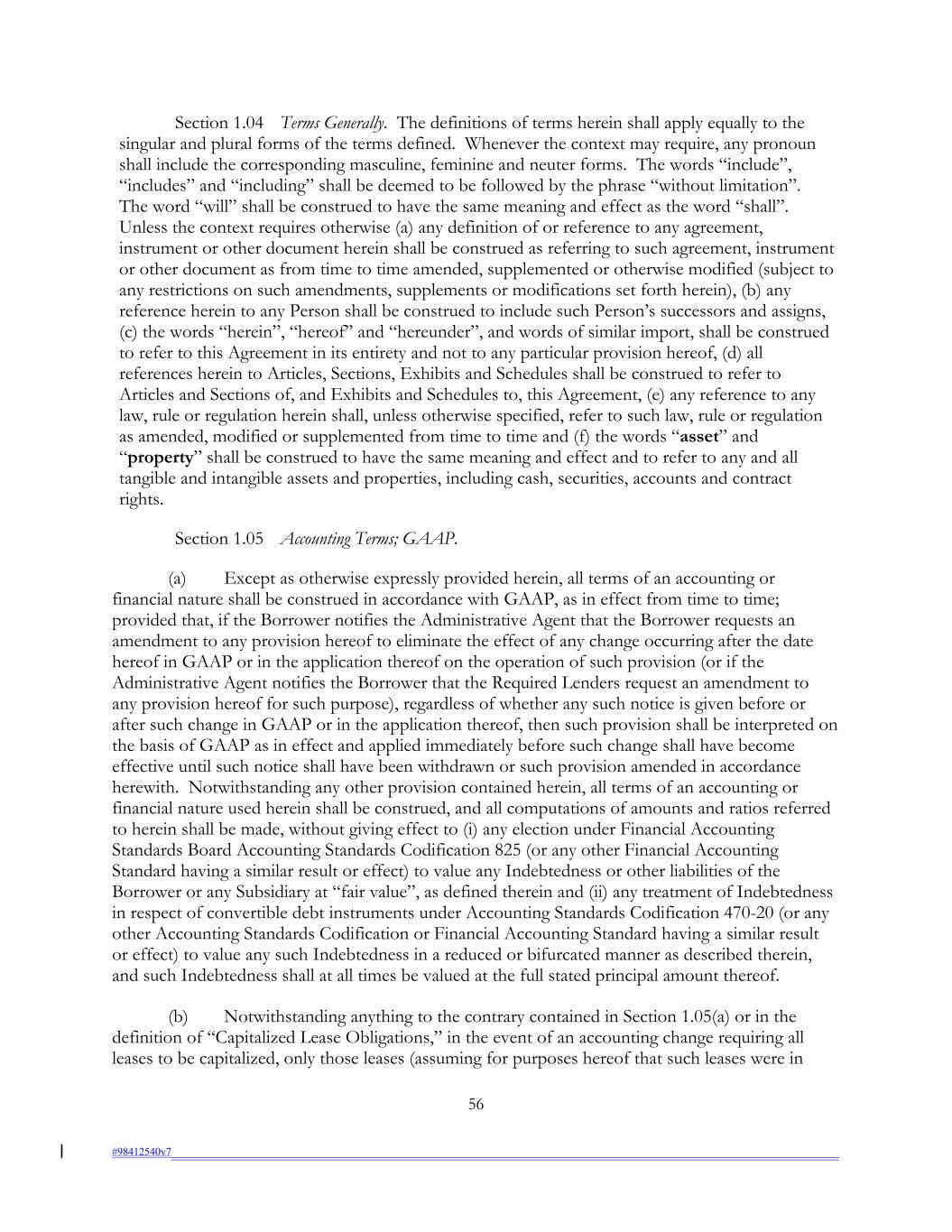 Section 1.04 Terms Generally. The definitions of terms herein shall apply equally to the singular and plural forms of the terms defined. Whenever the context may require, any pronoun shall include the corresponding masculine, feminine and neuter forms. The words “include”, “includes” and “including” shall be deemed to be followed by the phrase “without limitation”. The word “will” shall be construed to have the same meaning and effect as the word “shall”. Unless the context requires otherwise (a) any definition of or reference to any agreement, instrument or other document herein shall be construed as referring to such agreement, instrument or other document as from time to time amended, supplemented or otherwise modified (subject to any restrictions on such amendments, supplements or modifications set forth herein), (b) any reference herein to any Person shall be construed to include such Person’s successors and assigns, (c) the words “herein”, “hereof” and “hereunder”, and words of similar import, shall be construed to refer to this Agreement in its entirety and not to any particular provision hereof, (d) all references herein to Articles, Sections, Exhibits and Schedules shall be construed to refer to Articles and Sections of, and Exhibits and Schedules to, this Agreement, (e) any reference to any law, rule or regulation herein shall, unless otherwise specified, refer to such law, rule or regulation as amended, modified or supplemented from time to time and (f) the words “asset” and “property” shall be construed to have the same meaning and effect and to refer to any and all tangible and intangible assets and properties, including cash, securities, accounts and contract rights. Section 1.05 Accounting Terms; GAAP. (a) Except as otherwise expressly provided herein, all terms of an accounting or financial nature shall be construed in accordance with GAAP, as in effect from time to time; provided that, if the Borrower notifies the Administrative Agent that the Borrower requests an amendment to any provision hereof to eliminate the effect of any change occurring after the date hereof in GAAP or in the application thereof on the operation of such provision (or if the Administrative Agent notifies the Borrower that the Required Lenders request an amendment to any provision hereof for such purpose), regardless of whether any such notice is given before or after such change in GAAP or in the application thereof, then such provision shall be interpreted on the basis of GAAP as in effect and applied immediately before such change shall have become effective until such notice shall have been withdrawn or such provision amended in accordance herewith. Notwithstanding any other provision contained herein, all terms of an accounting or financial nature used herein shall be construed, and all computations of amounts and ratios referred to herein shall be made, without giving effect to (i) any election under Financial Accounting Standards Board Accounting Standards Codification 825 (or any other Financial Accounting Standard having a similar result or effect) to value any Indebtedness or other liabilities of the Borrower or any Subsidiary at “fair value”, as defined therein and (ii) any treatment of Indebtedness in respect of convertible debt instruments under Accounting Standards Codification 470-20 (or any other Accounting Standards Codification or Financial Accounting Standard having a similar result or effect) to value any such Indebtedness in a reduced or bifurcated manner as described therein, and such Indebtedness shall at all times be valued at the full stated principal amount thereof. (b) Notwithstanding anything to the contrary contained in Section 1.05(a) or in the definition of “Capitalized Lease Obligations,” in the event of an accounting change requiring all leases to be capitalized, only those leases (assuming for purposes hereof that such leases were in 56 #98412540v7