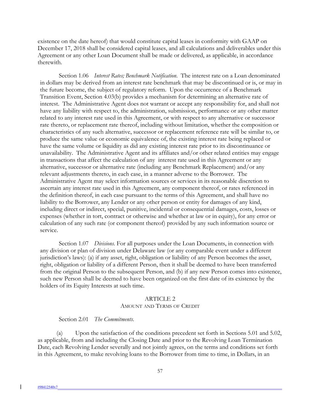 existence on the date hereof) that would constitute capital leases in conformity with GAAP on December 17, 2018 shall be considered capital leases, and all calculations and deliverables under this Agreement or any other Loan Document shall be made or delivered, as applicable, in accordance therewith. Section 1.06 Interest Rates; Benchmark Notification. The interest rate on a Loan denominated in dollars may be derived from an interest rate benchmark that may be discontinued or is, or may in the future become, the subject of regulatory reform. Upon the occurrence of a Benchmark Transition Event, Section 4.03(b) provides a mechanism for determining an alternative rate of interest. The Administrative Agent does not warrant or accept any responsibility for, and shall not have any liability with respect to, the administration, submission, performance or any other matter related to any interest rate used in this Agreement, or with respect to any alternative or successor rate thereto, or replacement rate thereof, including without limitation, whether the composition or characteristics of any such alternative, successor or replacement reference rate will be similar to, or produce the same value or economic equivalence of, the existing interest rate being replaced or have the same volume or liquidity as did any existing interest rate prior to its discontinuance or unavailability. The Administrative Agent and its affiliates and/or other related entities may engage in transactions that affect the calculation of any interest rate used in this Agreement or any alternative, successor or alternative rate (including any Benchmark Replacement) and/or any relevant adjustments thereto, in each case, in a manner adverse to the Borrower. The Administrative Agent may select information sources or services in its reasonable discretion to ascertain any interest rate used in this Agreement, any component thereof, or rates referenced in the definition thereof, in each case pursuant to the terms of this Agreement, and shall have no liability to the Borrower, any Lender or any other person or entity for damages of any kind, including direct or indirect, special, punitive, incidental or consequential damages, costs, losses or expenses (whether in tort, contract or otherwise and whether at law or in equity), for any error or calculation of any such rate (or component thereof) provided by any such information source or service. Section 1.07 Divisions. For all purposes under the Loan Documents, in connection with any division or plan of division under Delaware law (or any comparable event under a different jurisdiction’s laws): (a) if any asset, right, obligation or liability of any Person becomes the asset, right, obligation or liability of a different Person, then it shall be deemed to have been transferred from the original Person to the subsequent Person, and (b) if any new Person comes into existence, such new Person shall be deemed to have been organized on the first date of its existence by the holders of its Equity Interests at such time. ARTICLE 2 AMOUNT AND TERMS OF CREDIT Section 2.01 The Commitments. (a) Upon the satisfaction of the conditions precedent set forth in Sections 5.01 and 5.02, as applicable, from and including the Closing Date and prior to the Revolving Loan Termination Date, each Revolving Lender severally and not jointly agrees, on the terms and conditions set forth in this Agreement, to make revolving loans to the Borrower from time to time, in Dollars, in an 57 #98412540v7