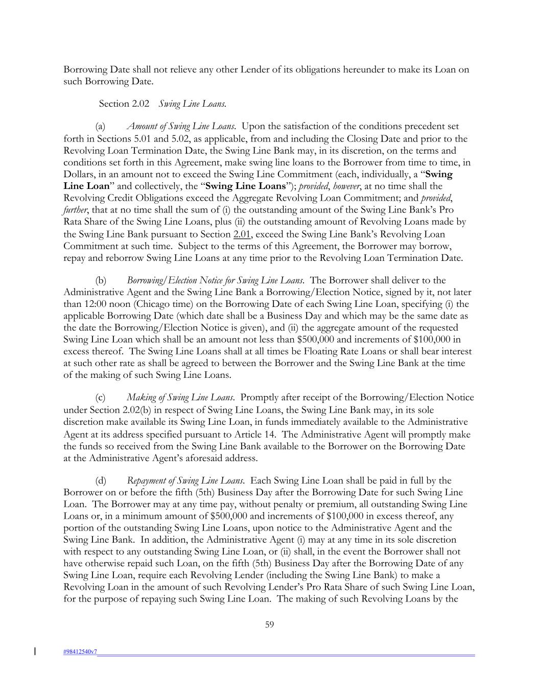 Borrowing Date shall not relieve any other Lender of its obligations hereunder to make its Loan on such Borrowing Date. Section 2.02 Swing Line Loans. (a) Amount of Swing Line Loans. Upon the satisfaction of the conditions precedent set forth in Sections 5.01 and 5.02, as applicable, from and including the Closing Date and prior to the Revolving Loan Termination Date, the Swing Line Bank may, in its discretion, on the terms and conditions set forth in this Agreement, make swing line loans to the Borrower from time to time, in Dollars, in an amount not to exceed the Swing Line Commitment (each, individually, a “Swing Line Loan” and collectively, the “Swing Line Loans”); provided, however, at no time shall the Revolving Credit Obligations exceed the Aggregate Revolving Loan Commitment; and provided, further, that at no time shall the sum of (i) the outstanding amount of the Swing Line Bank’s Pro Rata Share of the Swing Line Loans, plus (ii) the outstanding amount of Revolving Loans made by the Swing Line Bank pursuant to Section 2.01, exceed the Swing Line Bank’s Revolving Loan Commitment at such time. Subject to the terms of this Agreement, the Borrower may borrow, repay and reborrow Swing Line Loans at any time prior to the Revolving Loan Termination Date. (b) Borrowing/Election Notice for Swing Line Loans. The Borrower shall deliver to the Administrative Agent and the Swing Line Bank a Borrowing/Election Notice, signed by it, not later than 12:00 noon (Chicago time) on the Borrowing Date of each Swing Line Loan, specifying (i) the applicable Borrowing Date (which date shall be a Business Day and which may be the same date as the date the Borrowing/Election Notice is given), and (ii) the aggregate amount of the requested Swing Line Loan which shall be an amount not less than $500,000 and increments of $100,000 in excess thereof. The Swing Line Loans shall at all times be Floating Rate Loans or shall bear interest at such other rate as shall be agreed to between the Borrower and the Swing Line Bank at the time of the making of such Swing Line Loans. (c) Making of Swing Line Loans. Promptly after receipt of the Borrowing/Election Notice under Section 2.02(b) in respect of Swing Line Loans, the Swing Line Bank may, in its sole discretion make available its Swing Line Loan, in funds immediately available to the Administrative Agent at its address specified pursuant to Article 14. The Administrative Agent will promptly make the funds so received from the Swing Line Bank available to the Borrower on the Borrowing Date at the Administrative Agent’s aforesaid address. (d) Repayment of Swing Line Loans. Each Swing Line Loan shall be paid in full by the Borrower on or before the fifth (5th) Business Day after the Borrowing Date for such Swing Line Loan. The Borrower may at any time pay, without penalty or premium, all outstanding Swing Line Loans or, in a minimum amount of $500,000 and increments of $100,000 in excess thereof, any portion of the outstanding Swing Line Loans, upon notice to the Administrative Agent and the Swing Line Bank. In addition, the Administrative Agent (i) may at any time in its sole discretion with respect to any outstanding Swing Line Loan, or (ii) shall, in the event the Borrower shall not have otherwise repaid such Loan, on the fifth (5th) Business Day after the Borrowing Date of any Swing Line Loan, require each Revolving Lender (including the Swing Line Bank) to make a Revolving Loan in the amount of such Revolving Lender’s Pro Rata Share of such Swing Line Loan, for the purpose of repaying such Swing Line Loan. The making of such Revolving Loans by the 59 #98412540v7