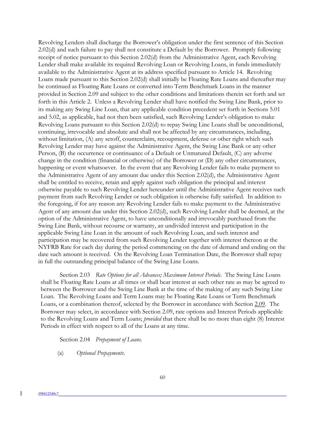 Revolving Lenders shall discharge the Borrower’s obligation under the first sentence of this Section 2.02(d) and such failure to pay shall not constitute a Default by the Borrower. Promptly following receipt of notice pursuant to this Section 2.02(d) from the Administrative Agent, each Revolving Lender shall make available its required Revolving Loan or Revolving Loans, in funds immediately available to the Administrative Agent at its address specified pursuant to Article 14. Revolving Loans made pursuant to this Section 2.02(d) shall initially be Floating Rate Loans and thereafter may be continued as Floating Rate Loans or converted into Term Benchmark Loans in the manner provided in Section 2.09 and subject to the other conditions and limitations therein set forth and set forth in this Article 2. Unless a Revolving Lender shall have notified the Swing Line Bank, prior to its making any Swing Line Loan, that any applicable condition precedent set forth in Sections 5.01 and 5.02, as applicable, had not then been satisfied, such Revolving Lender’s obligation to make Revolving Loans pursuant to this Section 2.02(d) to repay Swing Line Loans shall be unconditional, continuing, irrevocable and absolute and shall not be affected by any circumstances, including, without limitation, (A) any setoff, counterclaim, recoupment, defense or other right which such Revolving Lender may have against the Administrative Agent, the Swing Line Bank or any other Person, (B) the occurrence or continuance of a Default or Unmatured Default, (C) any adverse change in the condition (financial or otherwise) of the Borrower or (D) any other circumstances, happening or event whatsoever. In the event that any Revolving Lender fails to make payment to the Administrative Agent of any amount due under this Section 2.02(d), the Administrative Agent shall be entitled to receive, retain and apply against such obligation the principal and interest otherwise payable to such Revolving Lender hereunder until the Administrative Agent receives such payment from such Revolving Lender or such obligation is otherwise fully satisfied. In addition to the foregoing, if for any reason any Revolving Lender fails to make payment to the Administrative Agent of any amount due under this Section 2.02(d), such Revolving Lender shall be deemed, at the option of the Administrative Agent, to have unconditionally and irrevocably purchased from the Swing Line Bank, without recourse or warranty, an undivided interest and participation in the applicable Swing Line Loan in the amount of such Revolving Loan, and such interest and participation may be recovered from such Revolving Lender together with interest thereon at the NYFRB Rate for each day during the period commencing on the date of demand and ending on the date such amount is received. On the Revolving Loan Termination Date, the Borrower shall repay in full the outstanding principal balance of the Swing Line Loans. Section 2.03 Rate Options for all Advances; Maximum Interest Periods. The Swing Line Loans shall be Floating Rate Loans at all times or shall bear interest at such other rate as may be agreed to between the Borrower and the Swing Line Bank at the time of the making of any such Swing Line Loan. The Revolving Loans and Term Loans may be Floating Rate Loans or Term Benchmark Loans, or a combination thereof, selected by the Borrower in accordance with Section 2.09. The Borrower may select, in accordance with Section 2.09, rate options and Interest Periods applicable to the Revolving Loans and Term Loans; provided that there shall be no more than eight (8) Interest Periods in effect with respect to all of the Loans at any time. Section 2.04 Prepayment of Loans. (a) Optional Prepayments. 60 #98412540v7