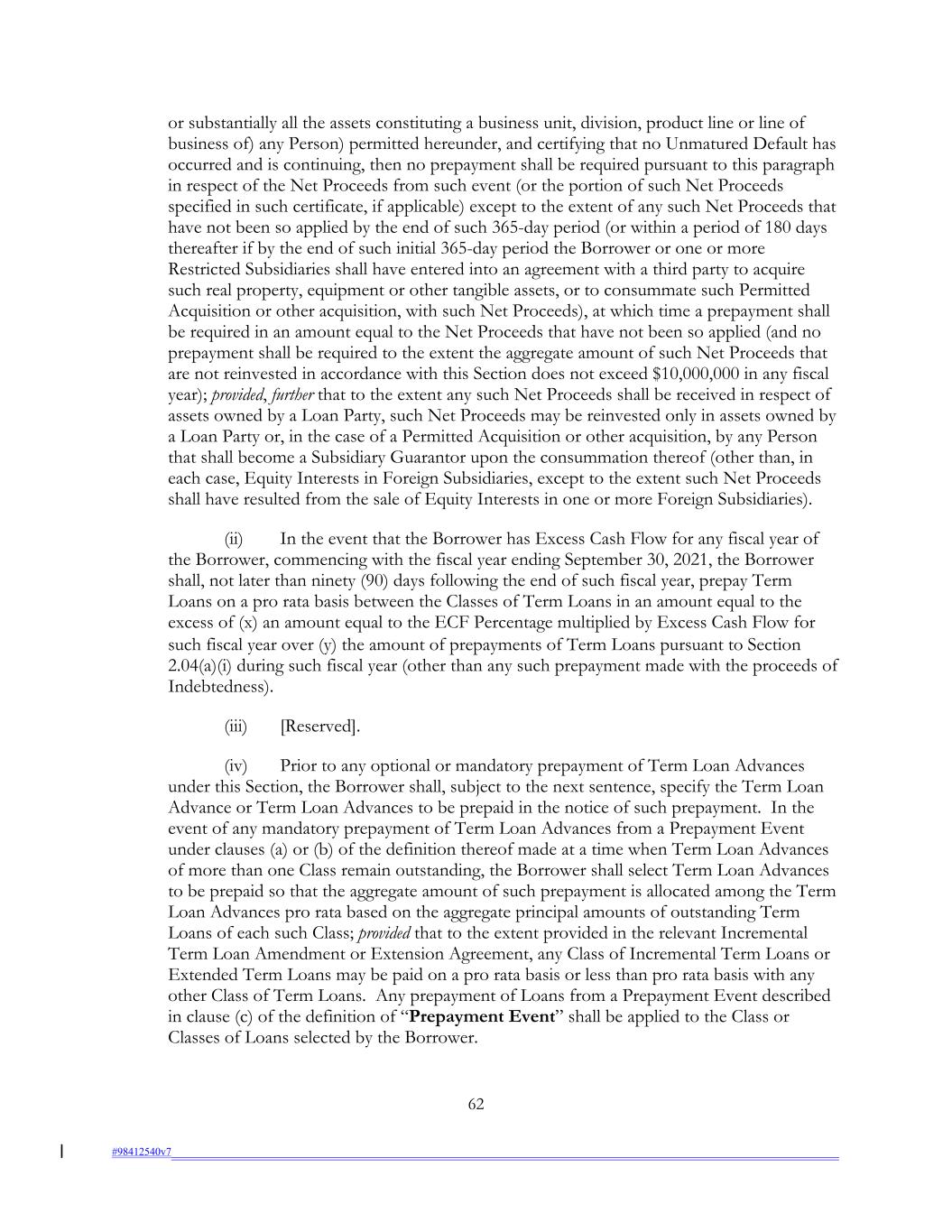 or substantially all the assets constituting a business unit, division, product line or line of business of) any Person) permitted hereunder, and certifying that no Unmatured Default has occurred and is continuing, then no prepayment shall be required pursuant to this paragraph in respect of the Net Proceeds from such event (or the portion of such Net Proceeds specified in such certificate, if applicable) except to the extent of any such Net Proceeds that have not been so applied by the end of such 365-day period (or within a period of 180 days thereafter if by the end of such initial 365-day period the Borrower or one or more Restricted Subsidiaries shall have entered into an agreement with a third party to acquire such real property, equipment or other tangible assets, or to consummate such Permitted Acquisition or other acquisition, with such Net Proceeds), at which time a prepayment shall be required in an amount equal to the Net Proceeds that have not been so applied (and no prepayment shall be required to the extent the aggregate amount of such Net Proceeds that are not reinvested in accordance with this Section does not exceed $10,000,000 in any fiscal year); provided, further that to the extent any such Net Proceeds shall be received in respect of assets owned by a Loan Party, such Net Proceeds may be reinvested only in assets owned by a Loan Party or, in the case of a Permitted Acquisition or other acquisition, by any Person that shall become a Subsidiary Guarantor upon the consummation thereof (other than, in each case, Equity Interests in Foreign Subsidiaries, except to the extent such Net Proceeds shall have resulted from the sale of Equity Interests in one or more Foreign Subsidiaries). (ii) In the event that the Borrower has Excess Cash Flow for any fiscal year of the Borrower, commencing with the fiscal year ending September 30, 2021, the Borrower shall, not later than ninety (90) days following the end of such fiscal year, prepay Term Loans on a pro rata basis between the Classes of Term Loans in an amount equal to the excess of (x) an amount equal to the ECF Percentage multiplied by Excess Cash Flow for such fiscal year over (y) the amount of prepayments of Term Loans pursuant to Section 2.04(a)(i) during such fiscal year (other than any such prepayment made with the proceeds of Indebtedness). (iii) [Reserved]. (iv) Prior to any optional or mandatory prepayment of Term Loan Advances under this Section, the Borrower shall, subject to the next sentence, specify the Term Loan Advance or Term Loan Advances to be prepaid in the notice of such prepayment. In the event of any mandatory prepayment of Term Loan Advances from a Prepayment Event under clauses (a) or (b) of the definition thereof made at a time when Term Loan Advances of more than one Class remain outstanding, the Borrower shall select Term Loan Advances to be prepaid so that the aggregate amount of such prepayment is allocated among the Term Loan Advances pro rata based on the aggregate principal amounts of outstanding Term Loans of each such Class; provided that to the extent provided in the relevant Incremental Term Loan Amendment or Extension Agreement, any Class of Incremental Term Loans or Extended Term Loans may be paid on a pro rata basis or less than pro rata basis with any other Class of Term Loans. Any prepayment of Loans from a Prepayment Event described in clause (c) of the definition of “Prepayment Event” shall be applied to the Class or Classes of Loans selected by the Borrower. 62 #98412540v7