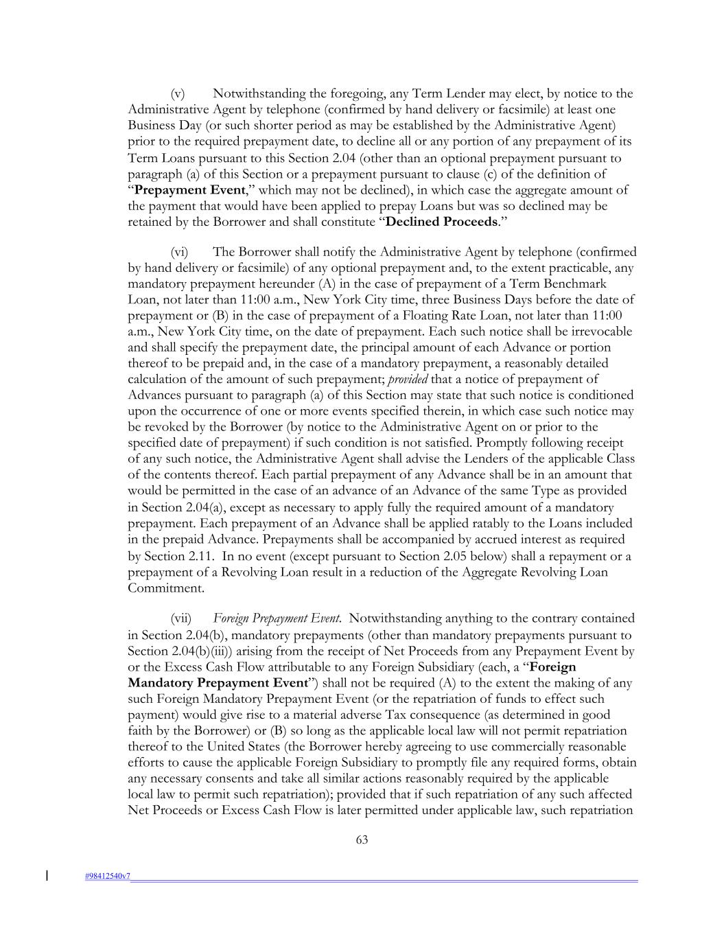 (v) Notwithstanding the foregoing, any Term Lender may elect, by notice to the Administrative Agent by telephone (confirmed by hand delivery or facsimile) at least one Business Day (or such shorter period as may be established by the Administrative Agent) prior to the required prepayment date, to decline all or any portion of any prepayment of its Term Loans pursuant to this Section 2.04 (other than an optional prepayment pursuant to paragraph (a) of this Section or a prepayment pursuant to clause (c) of the definition of “Prepayment Event,” which may not be declined), in which case the aggregate amount of the payment that would have been applied to prepay Loans but was so declined may be retained by the Borrower and shall constitute “Declined Proceeds.” (vi) The Borrower shall notify the Administrative Agent by telephone (confirmed by hand delivery or facsimile) of any optional prepayment and, to the extent practicable, any mandatory prepayment hereunder (A) in the case of prepayment of a Term Benchmark Loan, not later than 11:00 a.m., New York City time, three Business Days before the date of prepayment or (B) in the case of prepayment of a Floating Rate Loan, not later than 11:00 a.m., New York City time, on the date of prepayment. Each such notice shall be irrevocable and shall specify the prepayment date, the principal amount of each Advance or portion thereof to be prepaid and, in the case of a mandatory prepayment, a reasonably detailed calculation of the amount of such prepayment; provided that a notice of prepayment of Advances pursuant to paragraph (a) of this Section may state that such notice is conditioned upon the occurrence of one or more events specified therein, in which case such notice may be revoked by the Borrower (by notice to the Administrative Agent on or prior to the specified date of prepayment) if such condition is not satisfied. Promptly following receipt of any such notice, the Administrative Agent shall advise the Lenders of the applicable Class of the contents thereof. Each partial prepayment of any Advance shall be in an amount that would be permitted in the case of an advance of an Advance of the same Type as provided in Section 2.04(a), except as necessary to apply fully the required amount of a mandatory prepayment. Each prepayment of an Advance shall be applied ratably to the Loans included in the prepaid Advance. Prepayments shall be accompanied by accrued interest as required by Section 2.11. In no event (except pursuant to Section 2.05 below) shall a repayment or a prepayment of a Revolving Loan result in a reduction of the Aggregate Revolving Loan Commitment. (vii) Foreign Prepayment Event. Notwithstanding anything to the contrary contained in Section 2.04(b), mandatory prepayments (other than mandatory prepayments pursuant to Section 2.04(b)(iii)) arising from the receipt of Net Proceeds from any Prepayment Event by or the Excess Cash Flow attributable to any Foreign Subsidiary (each, a “Foreign Mandatory Prepayment Event”) shall not be required (A) to the extent the making of any such Foreign Mandatory Prepayment Event (or the repatriation of funds to effect such payment) would give rise to a material adverse Tax consequence (as determined in good faith by the Borrower) or (B) so long as the applicable local law will not permit repatriation thereof to the United States (the Borrower hereby agreeing to use commercially reasonable efforts to cause the applicable Foreign Subsidiary to promptly file any required forms, obtain any necessary consents and take all similar actions reasonably required by the applicable local law to permit such repatriation); provided that if such repatriation of any such affected Net Proceeds or Excess Cash Flow is later permitted under applicable law, such repatriation 63 #98412540v7