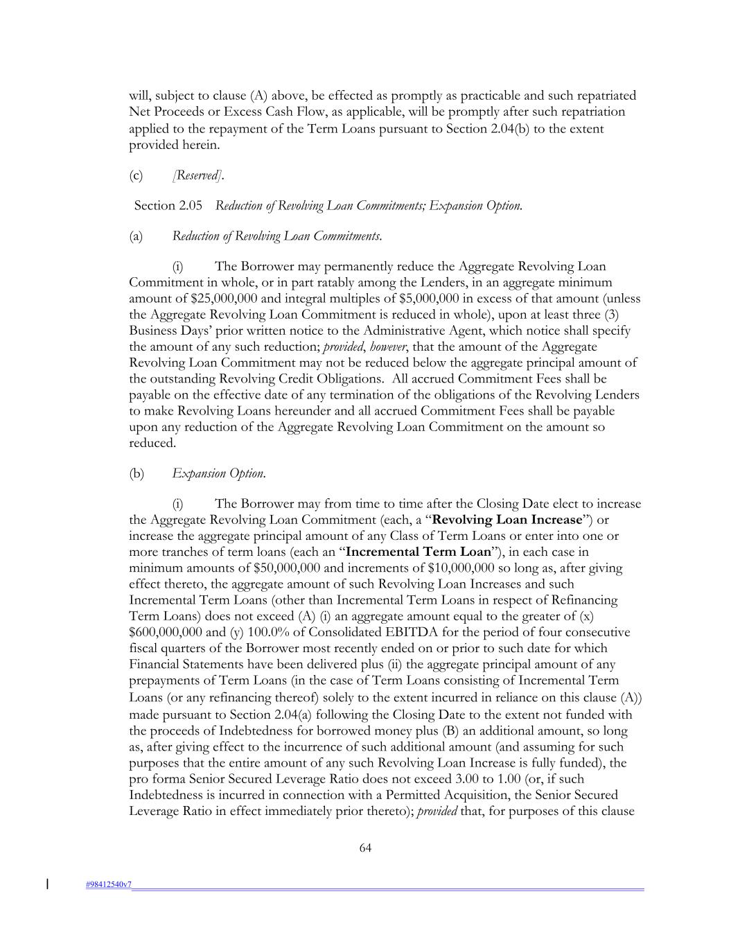 will, subject to clause (A) above, be effected as promptly as practicable and such repatriated Net Proceeds or Excess Cash Flow, as applicable, will be promptly after such repatriation applied to the repayment of the Term Loans pursuant to Section 2.04(b) to the extent provided herein. (c) [Reserved]. Section 2.05 Reduction of Revolving Loan Commitments; Expansion Option. (a) Reduction of Revolving Loan Commitments. (i) The Borrower may permanently reduce the Aggregate Revolving Loan Commitment in whole, or in part ratably among the Lenders, in an aggregate minimum amount of $25,000,000 and integral multiples of $5,000,000 in excess of that amount (unless the Aggregate Revolving Loan Commitment is reduced in whole), upon at least three (3) Business Days’ prior written notice to the Administrative Agent, which notice shall specify the amount of any such reduction; provided, however, that the amount of the Aggregate Revolving Loan Commitment may not be reduced below the aggregate principal amount of the outstanding Revolving Credit Obligations. All accrued Commitment Fees shall be payable on the effective date of any termination of the obligations of the Revolving Lenders to make Revolving Loans hereunder and all accrued Commitment Fees shall be payable upon any reduction of the Aggregate Revolving Loan Commitment on the amount so reduced. (b) Expansion Option. (i) The Borrower may from time to time after the Closing Date elect to increase the Aggregate Revolving Loan Commitment (each, a “Revolving Loan Increase”) or increase the aggregate principal amount of any Class of Term Loans or enter into one or more tranches of term loans (each an “Incremental Term Loan”), in each case in minimum amounts of $50,000,000 and increments of $10,000,000 so long as, after giving effect thereto, the aggregate amount of such Revolving Loan Increases and such Incremental Term Loans (other than Incremental Term Loans in respect of Refinancing Term Loans) does not exceed (A) (i) an aggregate amount equal to the greater of (x) $600,000,000 and (y) 100.0% of Consolidated EBITDA for the period of four consecutive fiscal quarters of the Borrower most recently ended on or prior to such date for which Financial Statements have been delivered plus (ii) the aggregate principal amount of any prepayments of Term Loans (in the case of Term Loans consisting of Incremental Term Loans (or any refinancing thereof) solely to the extent incurred in reliance on this clause (A)) made pursuant to Section 2.04(a) following the Closing Date to the extent not funded with the proceeds of Indebtedness for borrowed money plus (B) an additional amount, so long as, after giving effect to the incurrence of such additional amount (and assuming for such purposes that the entire amount of any such Revolving Loan Increase is fully funded), the pro forma Senior Secured Leverage Ratio does not exceed 3.00 to 1.00 (or, if such Indebtedness is incurred in connection with a Permitted Acquisition, the Senior Secured Leverage Ratio in effect immediately prior thereto); provided that, for purposes of this clause 64 #98412540v7