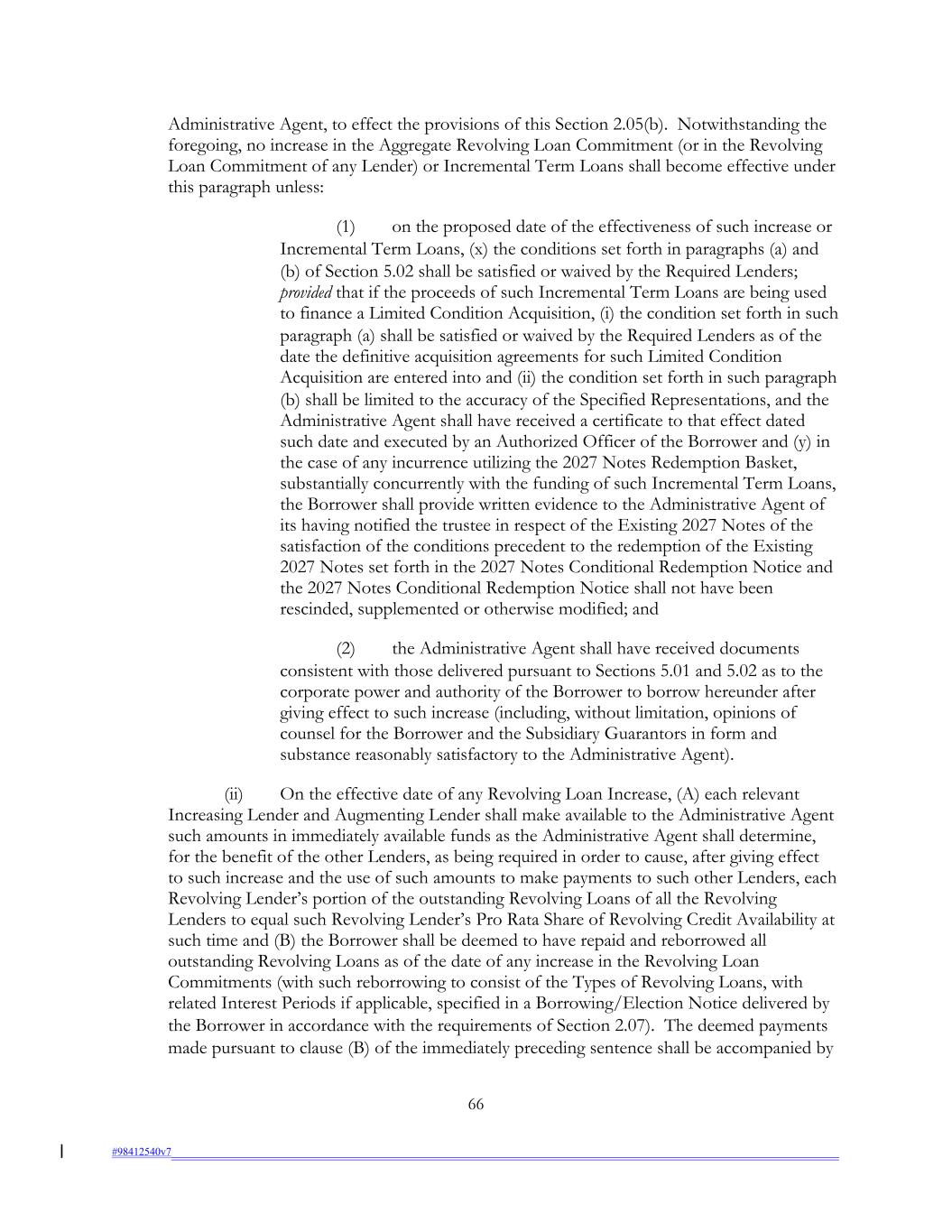Administrative Agent, to effect the provisions of this Section 2.05(b). Notwithstanding the foregoing, no increase in the Aggregate Revolving Loan Commitment (or in the Revolving Loan Commitment of any Lender) or Incremental Term Loans shall become effective under this paragraph unless: (1) on the proposed date of the effectiveness of such increase or Incremental Term Loans, (x) the conditions set forth in paragraphs (a) and (b) of Section 5.02 shall be satisfied or waived by the Required Lenders; provided that if the proceeds of such Incremental Term Loans are being used to finance a Limited Condition Acquisition, (i) the condition set forth in such paragraph (a) shall be satisfied or waived by the Required Lenders as of the date the definitive acquisition agreements for such Limited Condition Acquisition are entered into and (ii) the condition set forth in such paragraph (b) shall be limited to the accuracy of the Specified Representations, and the Administrative Agent shall have received a certificate to that effect dated such date and executed by an Authorized Officer of the Borrower and (y) in the case of any incurrence utilizing the 2027 Notes Redemption Basket, substantially concurrently with the funding of such Incremental Term Loans, the Borrower shall provide written evidence to the Administrative Agent of its having notified the trustee in respect of the Existing 2027 Notes of the satisfaction of the conditions precedent to the redemption of the Existing 2027 Notes set forth in the 2027 Notes Conditional Redemption Notice and the 2027 Notes Conditional Redemption Notice shall not have been rescinded, supplemented or otherwise modified; and (2) the Administrative Agent shall have received documents consistent with those delivered pursuant to Sections 5.01 and 5.02 as to the corporate power and authority of the Borrower to borrow hereunder after giving effect to such increase (including, without limitation, opinions of counsel for the Borrower and the Subsidiary Guarantors in form and substance reasonably satisfactory to the Administrative Agent). (ii) On the effective date of any Revolving Loan Increase, (A) each relevant Increasing Lender and Augmenting Lender shall make available to the Administrative Agent such amounts in immediately available funds as the Administrative Agent shall determine, for the benefit of the other Lenders, as being required in order to cause, after giving effect to such increase and the use of such amounts to make payments to such other Lenders, each Revolving Lender’s portion of the outstanding Revolving Loans of all the Revolving Lenders to equal such Revolving Lender’s Pro Rata Share of Revolving Credit Availability at such time and (B) the Borrower shall be deemed to have repaid and reborrowed all outstanding Revolving Loans as of the date of any increase in the Revolving Loan Commitments (with such reborrowing to consist of the Types of Revolving Loans, with related Interest Periods if applicable, specified in a Borrowing/Election Notice delivered by the Borrower in accordance with the requirements of Section 2.07). The deemed payments made pursuant to clause (B) of the immediately preceding sentence shall be accompanied by 66 #98412540v7