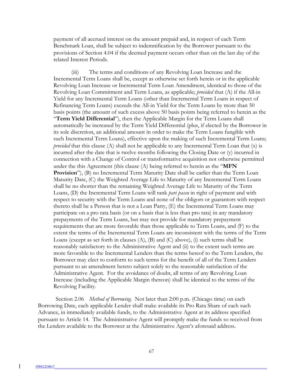 payment of all accrued interest on the amount prepaid and, in respect of each Term Benchmark Loan, shall be subject to indemnification by the Borrower pursuant to the provisions of Section 4.04 if the deemed payment occurs other than on the last day of the related Interest Periods. (iii) The terms and conditions of any Revolving Loan Increase and the Incremental Term Loans shall be, except as otherwise set forth herein or in the applicable Revolving Loan Increase or Incremental Term Loan Amendment, identical to those of the Revolving Loan Commitment and Term Loans, as applicable; provided that (A) if the All-in Yield for any Incremental Term Loans (other than Incremental Term Loans in respect of Refinancing Term Loans) exceeds the All-in Yield for the Term Loans by more than 50 basis points (the amount of such excess above 50 basis points being referred to herein as the “Term Yield Differential”), then the Applicable Margin for the Term Loans shall automatically be increased by the Term Yield Differential (plus, if elected by the Borrower in its sole discretion, an additional amount in order to make the Term Loans fungible with such Incremental Term Loans), effective upon the making of such Incremental Term Loans; provided that this clause (A) shall not be applicable to any Incremental Term Loan that (x) is incurred after the date that is twelve months following the Closing Date or (y) incurred in connection with a Change of Control or transformative acquisition not otherwise permitted under the this Agreement (this clause (A) being referred to herein as the “MFN Provision”), (B) no Incremental Term Maturity Date shall be earlier than the Term Loan Maturity Date, (C) the Weighted Average Life to Maturity of any Incremental Term Loans shall be no shorter than the remaining Weighted Average Life to Maturity of the Term Loans, (D) the Incremental Term Loans will rank pari passu in right of payment and with respect to security with the Term Loans and none of the obligors or guarantors with respect thereto shall be a Person that is not a Loan Party, (E) the Incremental Term Loans may participate on a pro rata basis (or on a basis that is less than pro rata) in any mandatory prepayments of the Term Loans, but may not provide for mandatory prepayment requirements that are more favorable than those applicable to Term Loans, and (F) to the extent the terms of the Incremental Term Loans are inconsistent with the terms of the Term Loans (except as set forth in clauses (A), (B) and (C) above), (i) such terms shall be reasonably satisfactory to the Administrative Agent and (ii) to the extent such terms are more favorable to the Incremental Lenders than the terms hereof to the Term Lenders, the Borrower may elect to conform to such terms for the benefit of all of the Term Lenders pursuant to an amendment hereto subject solely to the reasonable satisfaction of the Administrative Agent. For the avoidance of doubt, all terms of any Revolving Loan Increase (including the Applicable Margin thereon) shall be identical to the terms of the Revolving Facility. Section 2.06 Method of Borrowing. Not later than 2:00 p.m. (Chicago time) on each Borrowing Date, each applicable Lender shall make available its Pro Rata Share of each such Advance, in immediately available funds, to the Administrative Agent at its address specified pursuant to Article 14. The Administrative Agent will promptly make the funds so received from the Lenders available to the Borrower at the Administrative Agent’s aforesaid address. 67 #98412540v7