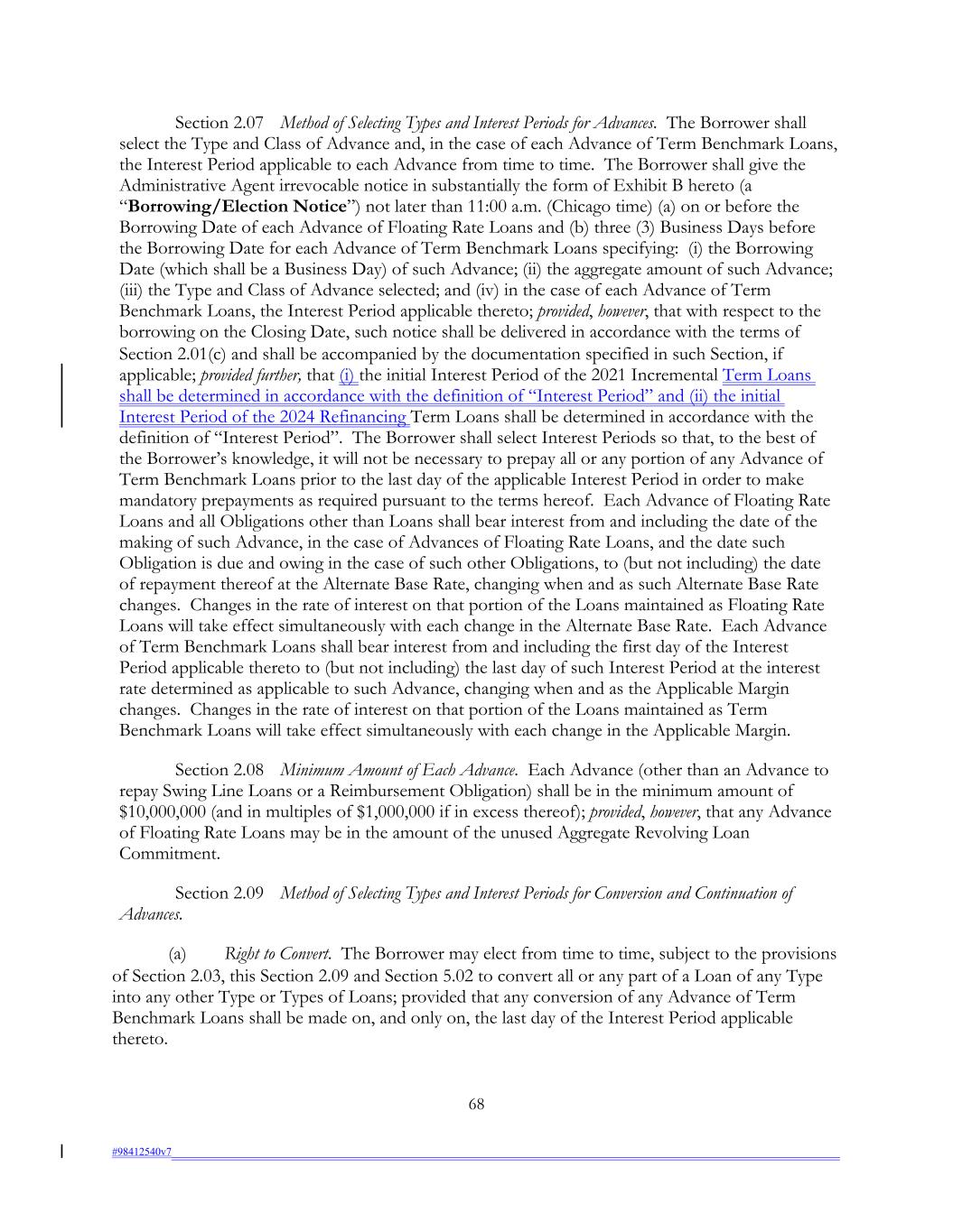 Section 2.07 Method of Selecting Types and Interest Periods for Advances. The Borrower shall select the Type and Class of Advance and, in the case of each Advance of Term Benchmark Loans, the Interest Period applicable to each Advance from time to time. The Borrower shall give the Administrative Agent irrevocable notice in substantially the form of Exhibit B hereto (a “Borrowing/Election Notice”) not later than 11:00 a.m. (Chicago time) (a) on or before the Borrowing Date of each Advance of Floating Rate Loans and (b) three (3) Business Days before the Borrowing Date for each Advance of Term Benchmark Loans specifying: (i) the Borrowing Date (which shall be a Business Day) of such Advance; (ii) the aggregate amount of such Advance; (iii) the Type and Class of Advance selected; and (iv) in the case of each Advance of Term Benchmark Loans, the Interest Period applicable thereto; provided, however, that with respect to the borrowing on the Closing Date, such notice shall be delivered in accordance with the terms of Section 2.01(c) and shall be accompanied by the documentation specified in such Section, if applicable; provided further, that (i) the initial Interest Period of the 2021 Incremental Term Loans shall be determined in accordance with the definition of “Interest Period” and (ii) the initial Interest Period of the 2024 Refinancing Term Loans shall be determined in accordance with the definition of “Interest Period”. The Borrower shall select Interest Periods so that, to the best of the Borrower’s knowledge, it will not be necessary to prepay all or any portion of any Advance of Term Benchmark Loans prior to the last day of the applicable Interest Period in order to make mandatory prepayments as required pursuant to the terms hereof. Each Advance of Floating Rate Loans and all Obligations other than Loans shall bear interest from and including the date of the making of such Advance, in the case of Advances of Floating Rate Loans, and the date such Obligation is due and owing in the case of such other Obligations, to (but not including) the date of repayment thereof at the Alternate Base Rate, changing when and as such Alternate Base Rate changes. Changes in the rate of interest on that portion of the Loans maintained as Floating Rate Loans will take effect simultaneously with each change in the Alternate Base Rate. Each Advance of Term Benchmark Loans shall bear interest from and including the first day of the Interest Period applicable thereto to (but not including) the last day of such Interest Period at the interest rate determined as applicable to such Advance, changing when and as the Applicable Margin changes. Changes in the rate of interest on that portion of the Loans maintained as Term Benchmark Loans will take effect simultaneously with each change in the Applicable Margin. Section 2.08 Minimum Amount of Each Advance. Each Advance (other than an Advance to repay Swing Line Loans or a Reimbursement Obligation) shall be in the minimum amount of $10,000,000 (and in multiples of $1,000,000 if in excess thereof); provided, however, that any Advance of Floating Rate Loans may be in the amount of the unused Aggregate Revolving Loan Commitment. Section 2.09 Method of Selecting Types and Interest Periods for Conversion and Continuation of Advances. (a) Right to Convert. The Borrower may elect from time to time, subject to the provisions of Section 2.03, this Section 2.09 and Section 5.02 to convert all or any part of a Loan of any Type into any other Type or Types of Loans; provided that any conversion of any Advance of Term Benchmark Loans shall be made on, and only on, the last day of the Interest Period applicable thereto. 68 #98412540v7
