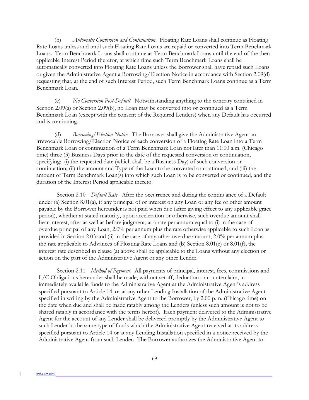 (b) Automatic Conversion and Continuation. Floating Rate Loans shall continue as Floating Rate Loans unless and until such Floating Rate Loans are repaid or converted into Term Benchmark Loans. Term Benchmark Loans shall continue as Term Benchmark Loans until the end of the then applicable Interest Period therefor, at which time such Term Benchmark Loans shall be automatically converted into Floating Rate Loans unless the Borrower shall have repaid such Loans or given the Administrative Agent a Borrowing/Election Notice in accordance with Section 2.09(d) requesting that, at the end of such Interest Period, such Term Benchmark Loans continue as a Term Benchmark Loan. (c) No Conversion Post-Default. Notwithstanding anything to the contrary contained in Section 2.09(a) or Section 2.09(b), no Loan may be converted into or continued as a Term Benchmark Loan (except with the consent of the Required Lenders) when any Default has occurred and is continuing. (d) Borrowing/Election Notice. The Borrower shall give the Administrative Agent an irrevocable Borrowing/Election Notice of each conversion of a Floating Rate Loan into a Term Benchmark Loan or continuation of a Term Benchmark Loan not later than 11:00 a.m. (Chicago time) three (3) Business Days prior to the date of the requested conversion or continuation, specifying: (i) the requested date (which shall be a Business Day) of such conversion or continuation; (ii) the amount and Type of the Loan to be converted or continued; and (iii) the amount of Term Benchmark Loan(s) into which such Loan is to be converted or continued, and the duration of the Interest Period applicable thereto. Section 2.10 Default Rate. After the occurrence and during the continuance of a Default under (a) Section 8.01(a), if any principal of or interest on any Loan or any fee or other amount payable by the Borrower hereunder is not paid when due (after giving effect to any applicable grace period), whether at stated maturity, upon acceleration or otherwise, such overdue amount shall bear interest, after as well as before judgment, at a rate per annum equal to (i) in the case of overdue principal of any Loan, 2.0% per annum plus the rate otherwise applicable to such Loan as provided in Section 2.03 and (ii) in the case of any other overdue amount, 2.0% per annum plus the rate applicable to Advances of Floating Rate Loans and (b) Section 8.01(e) or 8.01(f), the interest rate described in clause (a) above shall be applicable to the Loans without any election or action on the part of the Administrative Agent or any other Lender. Section 2.11 Method of Payment. All payments of principal, interest, fees, commissions and L/C Obligations hereunder shall be made, without setoff, deduction or counterclaim, in immediately available funds to the Administrative Agent at the Administrative Agent’s address specified pursuant to Article 14, or at any other Lending Installation of the Administrative Agent specified in writing by the Administrative Agent to the Borrower, by 2:00 p.m. (Chicago time) on the date when due and shall be made ratably among the Lenders (unless such amount is not to be shared ratably in accordance with the terms hereof). Each payment delivered to the Administrative Agent for the account of any Lender shall be delivered promptly by the Administrative Agent to such Lender in the same type of funds which the Administrative Agent received at its address specified pursuant to Article 14 or at any Lending Installation specified in a notice received by the Administrative Agent from such Lender. The Borrower authorizes the Administrative Agent to 69 #98412540v7