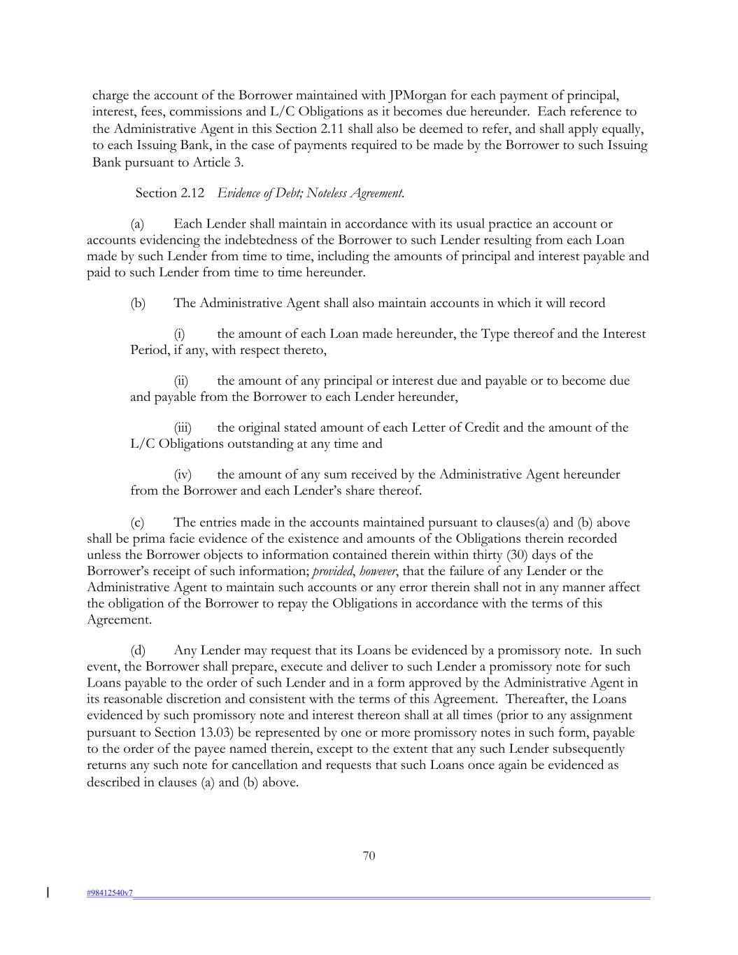 charge the account of the Borrower maintained with JPMorgan for each payment of principal, interest, fees, commissions and L/C Obligations as it becomes due hereunder. Each reference to the Administrative Agent in this Section 2.11 shall also be deemed to refer, and shall apply equally, to each Issuing Bank, in the case of payments required to be made by the Borrower to such Issuing Bank pursuant to Article 3. Section 2.12 Evidence of Debt; Noteless Agreement. (a) Each Lender shall maintain in accordance with its usual practice an account or accounts evidencing the indebtedness of the Borrower to such Lender resulting from each Loan made by such Lender from time to time, including the amounts of principal and interest payable and paid to such Lender from time to time hereunder. (b) The Administrative Agent shall also maintain accounts in which it will record (i) the amount of each Loan made hereunder, the Type thereof and the Interest Period, if any, with respect thereto, (ii) the amount of any principal or interest due and payable or to become due and payable from the Borrower to each Lender hereunder, (iii) the original stated amount of each Letter of Credit and the amount of the L/C Obligations outstanding at any time and (iv) the amount of any sum received by the Administrative Agent hereunder from the Borrower and each Lender’s share thereof. (c) The entries made in the accounts maintained pursuant to clauses(a) and (b) above shall be prima facie evidence of the existence and amounts of the Obligations therein recorded unless the Borrower objects to information contained therein within thirty (30) days of the Borrower’s receipt of such information; provided, however, that the failure of any Lender or the Administrative Agent to maintain such accounts or any error therein shall not in any manner affect the obligation of the Borrower to repay the Obligations in accordance with the terms of this Agreement. (d) Any Lender may request that its Loans be evidenced by a promissory note. In such event, the Borrower shall prepare, execute and deliver to such Lender a promissory note for such Loans payable to the order of such Lender and in a form approved by the Administrative Agent in its reasonable discretion and consistent with the terms of this Agreement. Thereafter, the Loans evidenced by such promissory note and interest thereon shall at all times (prior to any assignment pursuant to Section 13.03) be represented by one or more promissory notes in such form, payable to the order of the payee named therein, except to the extent that any such Lender subsequently returns any such note for cancellation and requests that such Loans once again be evidenced as described in clauses (a) and (b) above. 70 #98412540v7