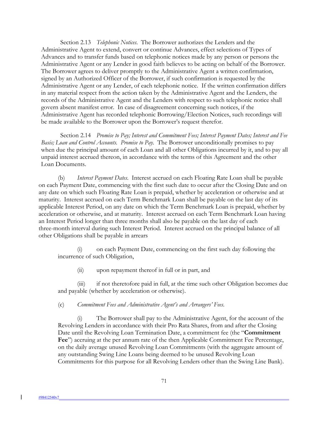 Section 2.13 Telephonic Notices. The Borrower authorizes the Lenders and the Administrative Agent to extend, convert or continue Advances, effect selections of Types of Advances and to transfer funds based on telephonic notices made by any person or persons the Administrative Agent or any Lender in good faith believes to be acting on behalf of the Borrower. The Borrower agrees to deliver promptly to the Administrative Agent a written confirmation, signed by an Authorized Officer of the Borrower, if such confirmation is requested by the Administrative Agent or any Lender, of each telephonic notice. If the written confirmation differs in any material respect from the action taken by the Administrative Agent and the Lenders, the records of the Administrative Agent and the Lenders with respect to such telephonic notice shall govern absent manifest error. In case of disagreement concerning such notices, if the Administrative Agent has recorded telephonic Borrowing/Election Notices, such recordings will be made available to the Borrower upon the Borrower’s request therefor. Section 2.14 Promise to Pay; Interest and Commitment Fees; Interest Payment Dates; Interest and Fee Basis; Loan and Control Accounts. Promise to Pay. The Borrower unconditionally promises to pay when due the principal amount of each Loan and all other Obligations incurred by it, and to pay all unpaid interest accrued thereon, in accordance with the terms of this Agreement and the other Loan Documents. (b) Interest Payment Dates. Interest accrued on each Floating Rate Loan shall be payable on each Payment Date, commencing with the first such date to occur after the Closing Date and on any date on which such Floating Rate Loan is prepaid, whether by acceleration or otherwise and at maturity. Interest accrued on each Term Benchmark Loan shall be payable on the last day of its applicable Interest Period, on any date on which the Term Benchmark Loan is prepaid, whether by acceleration or otherwise, and at maturity. Interest accrued on each Term Benchmark Loan having an Interest Period longer than three months shall also be payable on the last day of each three-month interval during such Interest Period. Interest accrued on the principal balance of all other Obligations shall be payable in arrears (i) on each Payment Date, commencing on the first such day following the incurrence of such Obligation, (ii) upon repayment thereof in full or in part, and (iii) if not theretofore paid in full, at the time such other Obligation becomes due and payable (whether by acceleration or otherwise). (c) Commitment Fees and Administrative Agent’s and Arrangers’ Fees. (i) The Borrower shall pay to the Administrative Agent, for the account of the Revolving Lenders in accordance with their Pro Rata Shares, from and after the Closing Date until the Revolving Loan Termination Date, a commitment fee (the “Commitment Fee”) accruing at the per annum rate of the then Applicable Commitment Fee Percentage, on the daily average unused Revolving Loan Commitments (with the aggregate amount of any outstanding Swing Line Loans being deemed to be unused Revolving Loan Commitments for this purpose for all Revolving Lenders other than the Swing Line Bank). 71 #98412540v7